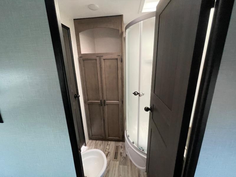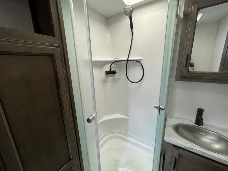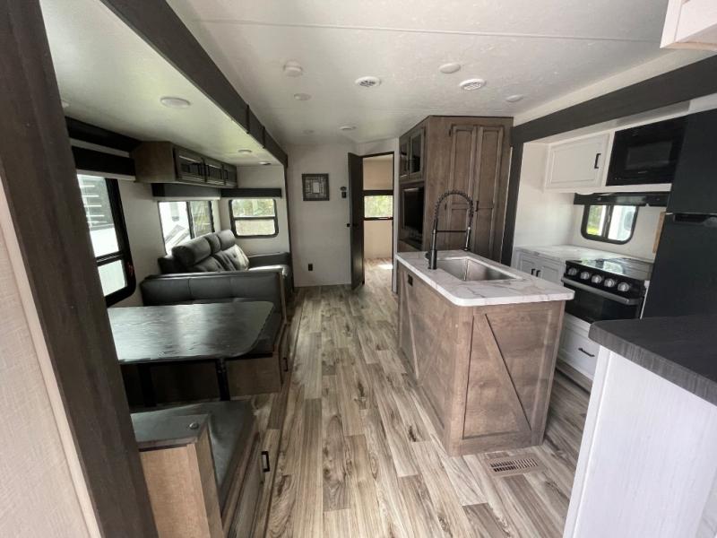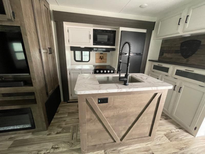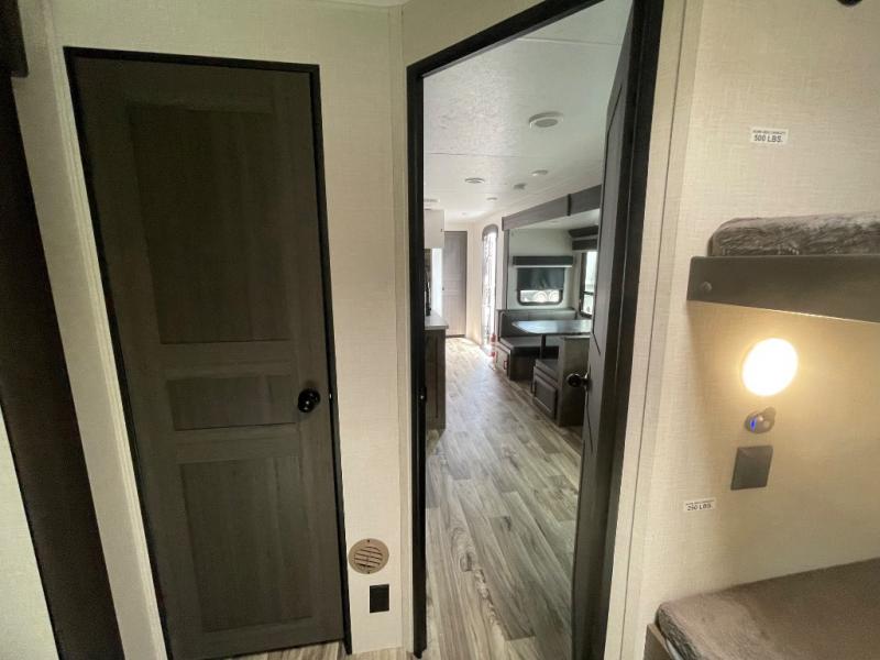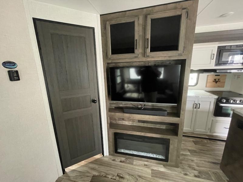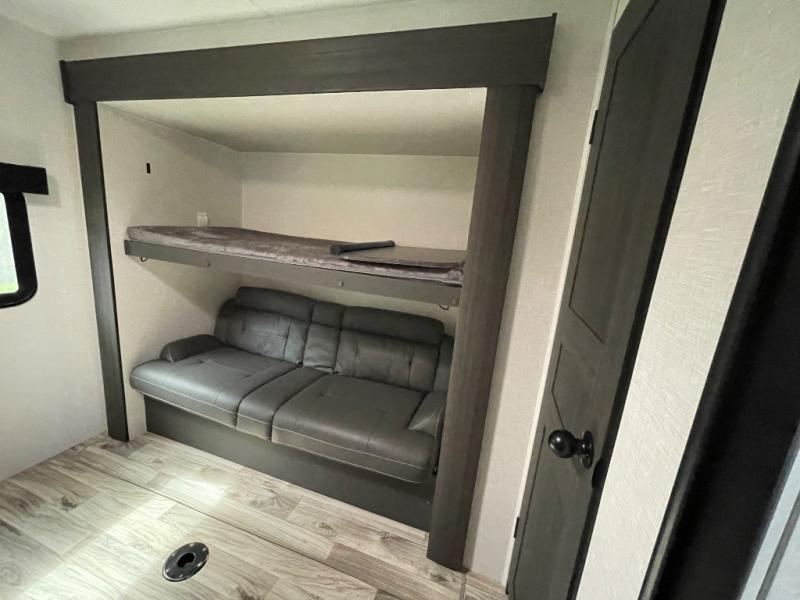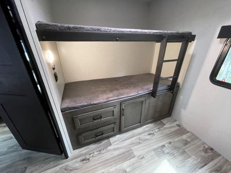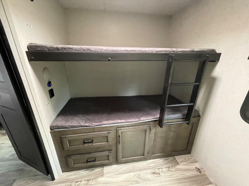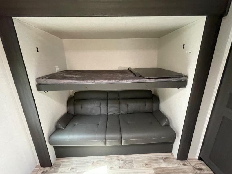 Stay protected rain or shine with the two 10' legless awnings with wind sensors on this travel trailer! Some other exterior features you will enjoy include a campfire café with a 40" TV to watch the big game while you grill steaks on the griddle, and the pass-through storage area with slam latch baggage doors will keep your gear in place. Inside, there is a rear private bunkhouse with a closet, a 32" x 70" flip-up bunk above a 70" sofa with a table, and a 28" x 70" bunk above a 40" x 70" bottom bunk. The living area has a sofa across from an entertainment center with a frameless fireplace and a 40" TV with a swing arm so others can watch it from the 42" booth dinette. The dual entry bathroom has a 34" radius shower to freshen up in, and is easy to access, especially those staying in the front private bedroom!