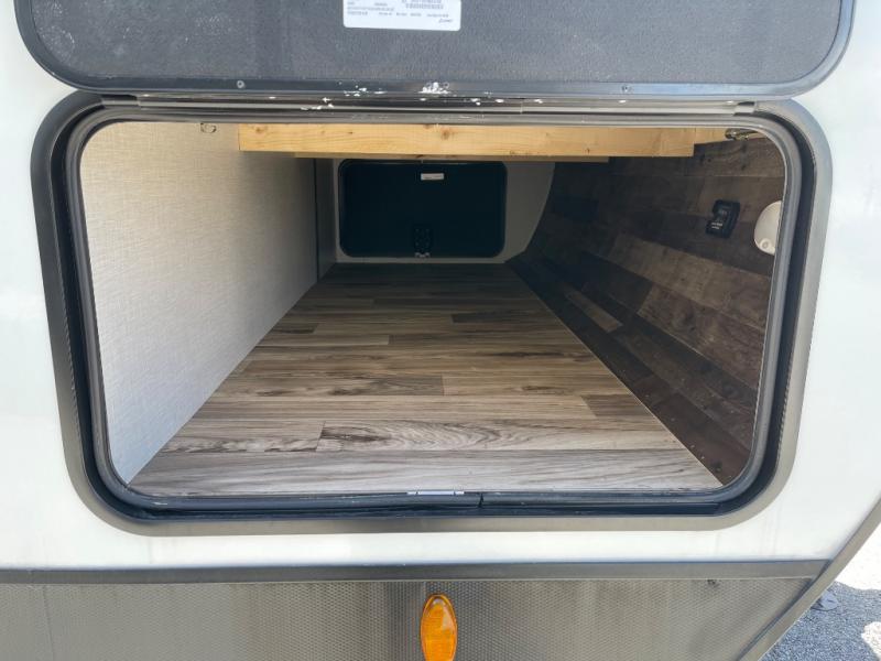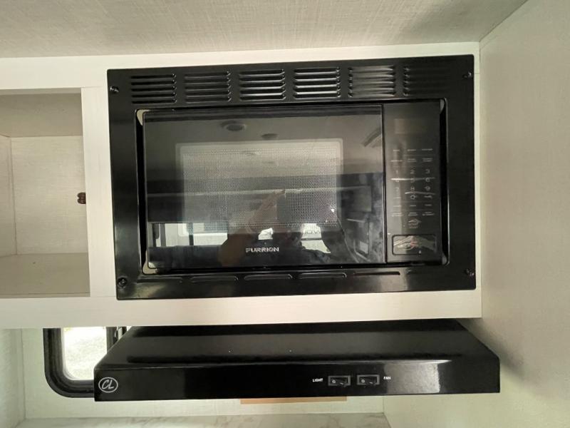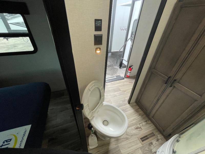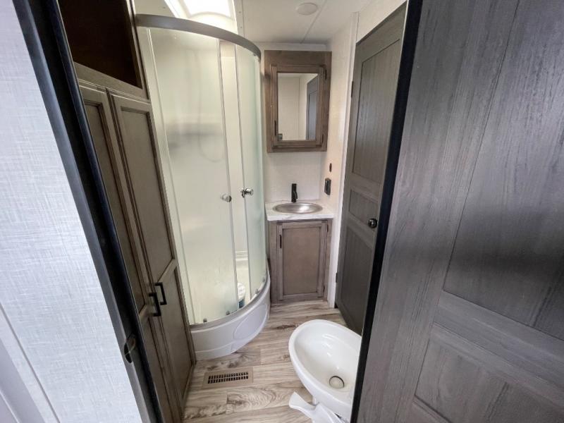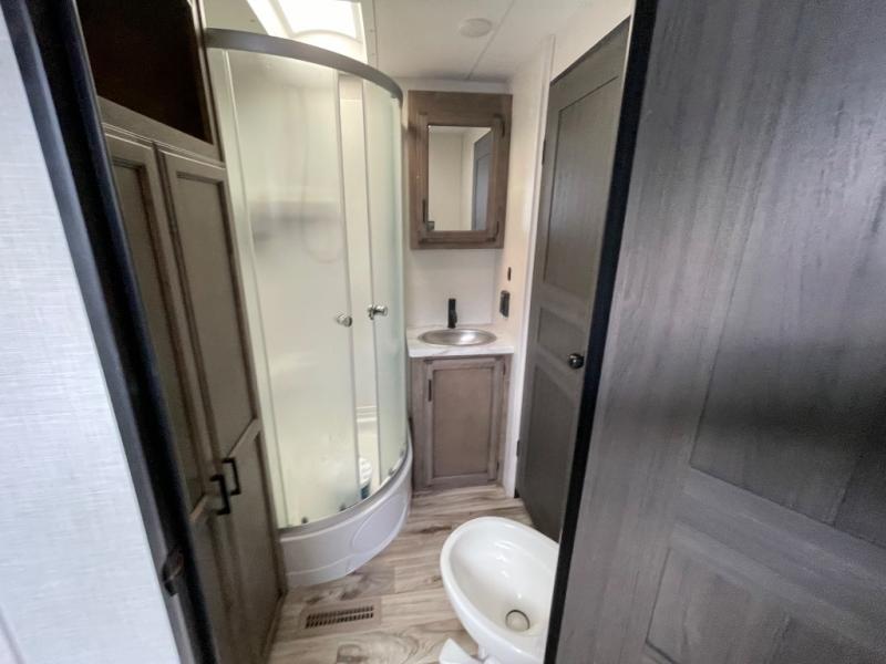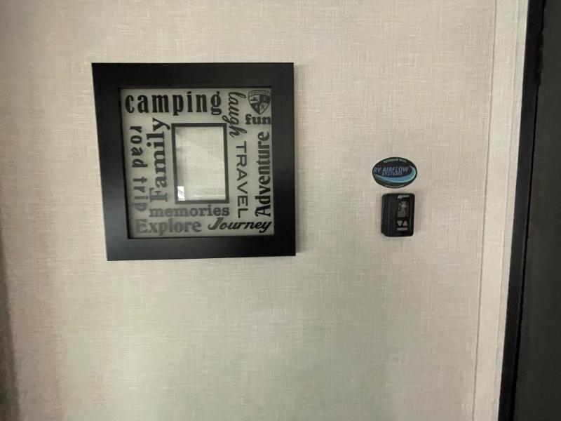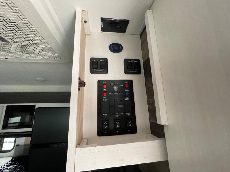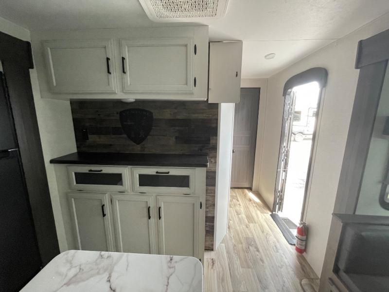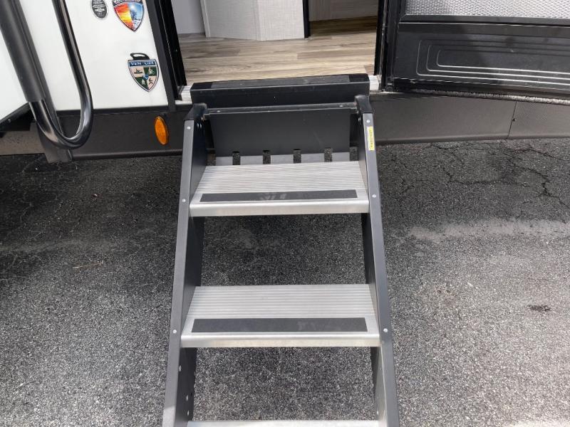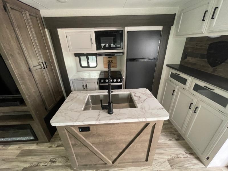 Stay protected rain or shine with the two 10' legless awnings with wind sensors on this travel trailer! Some other exterior features you will enjoy include a campfire café with a 40" TV to watch the big game while you grill steaks on the griddle, and the pass-through storage area with slam latch baggage doors will keep your gear in place. Inside, there is a rear private bunkhouse with a closet, a 32" x 70" flip-up bunk above a 70" sofa with a table, and a 28" x 70" bunk above a 40" x 70" bottom bunk. The living area has a sofa across from an entertainment center with a frameless fireplace and a 40" TV with a swing arm so others can watch it from the 42" booth dinette. The dual entry bathroom has a 34" radius shower to freshen up in, and is easy to access, especially those staying in the front private bedroom!