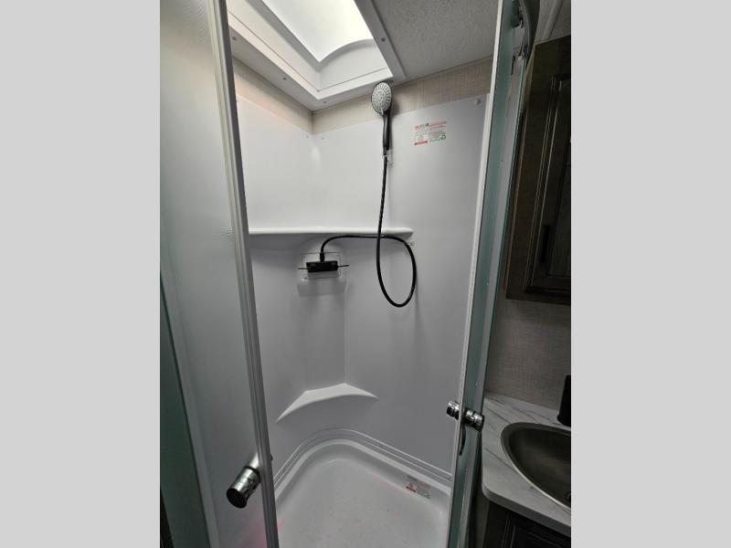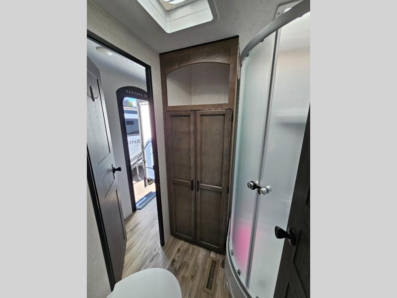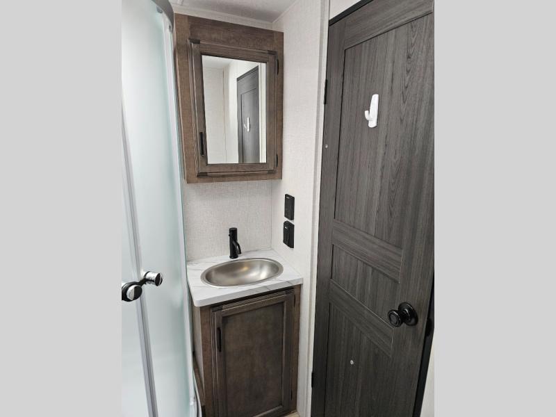 Every Venture RV SportTrek lightweight travel trailer is constructed to offer peace of mind and the comforts of home! Their purposeful residential kitchens are packed with handy features like a Furrion oven and three burner cooktop, a large stainless steel sink with a cover and dish drying rack, plus a 12V refrigerator. You will find plenty of storage throughout, including Safe-Tek hidden storage with a charging center and StorMore nightstands on either side of the bed behind the full-length closets. And the magnetic slam-latch baggage doors and spacious pass-through storage area will hold your outdoor gear in place. They even come with a hot and cold exterior shower and SporTrek's Weather Shield which includes a forced air heated and enclosed underbelly, high output A/C ducting, and more features that will let you extend your camping season. You will also love the new residential upgraded furniture, Serta memory foam mattress, barn style passage doors, and many more comforts!