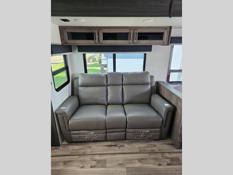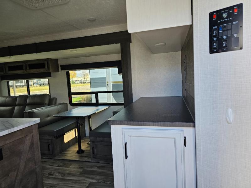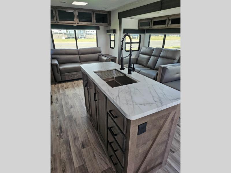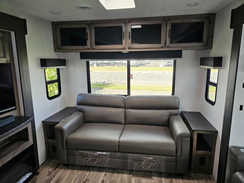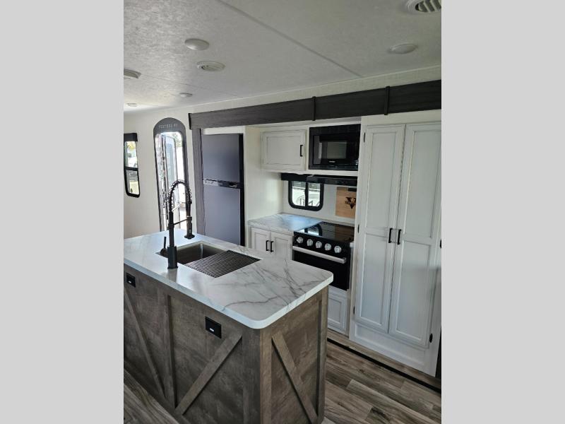 You will feel right at home camping in this travel trailer! From the front private bedroom with a Sleep Tight queen bed to the rear living area with a 70" sofa. The living area also has theater seating with USB ports across from the entertainment center that has a 40" TV on a swing arm for all to see, even those preparing dinner at the kitchen island. Breathe in some fresh air and enjoy a sunrise breakfast as you cook pancakes on the griddle at the outside campfire café. You can store your dishes in the hutch and play games at the 42" booth dinette. After a fun day at the beach, head to the dual entry bathroom to rinse the sand out of your hair in the 34" radius shower and grab your towel from the convenient linen closet!