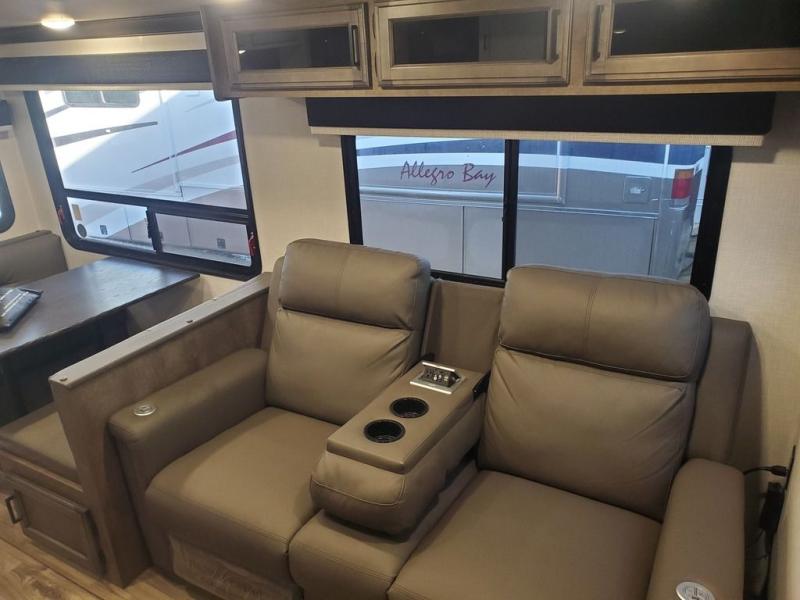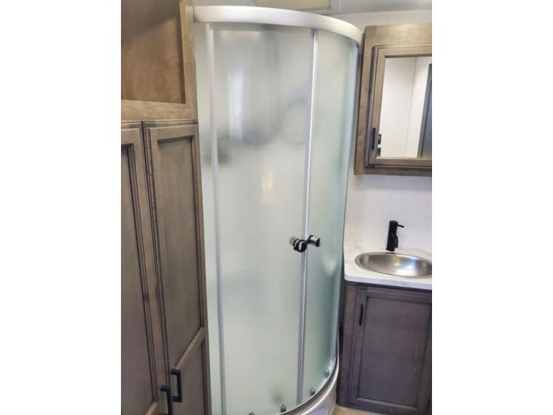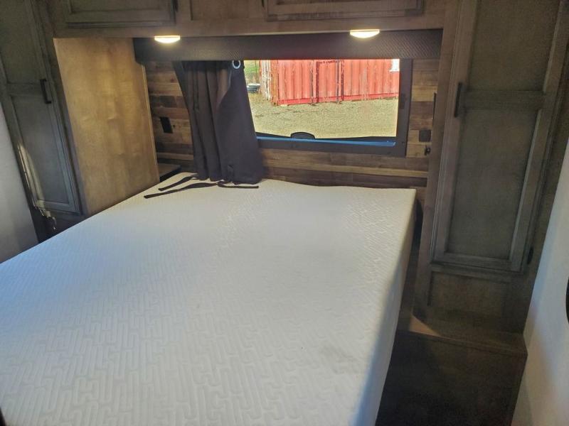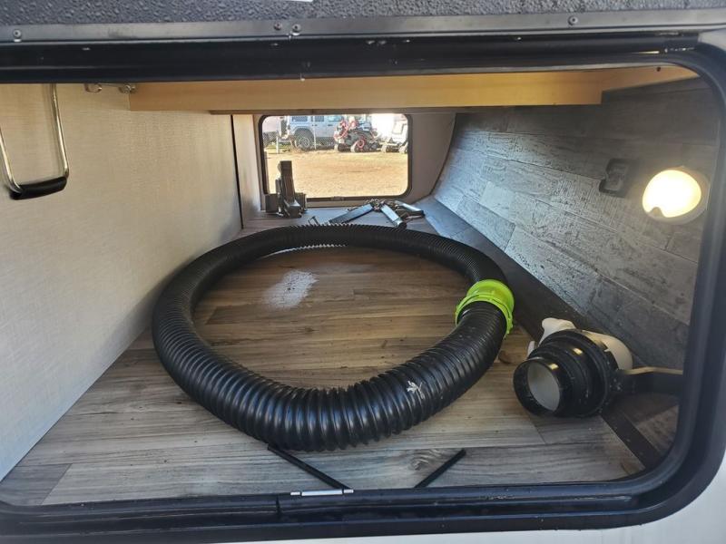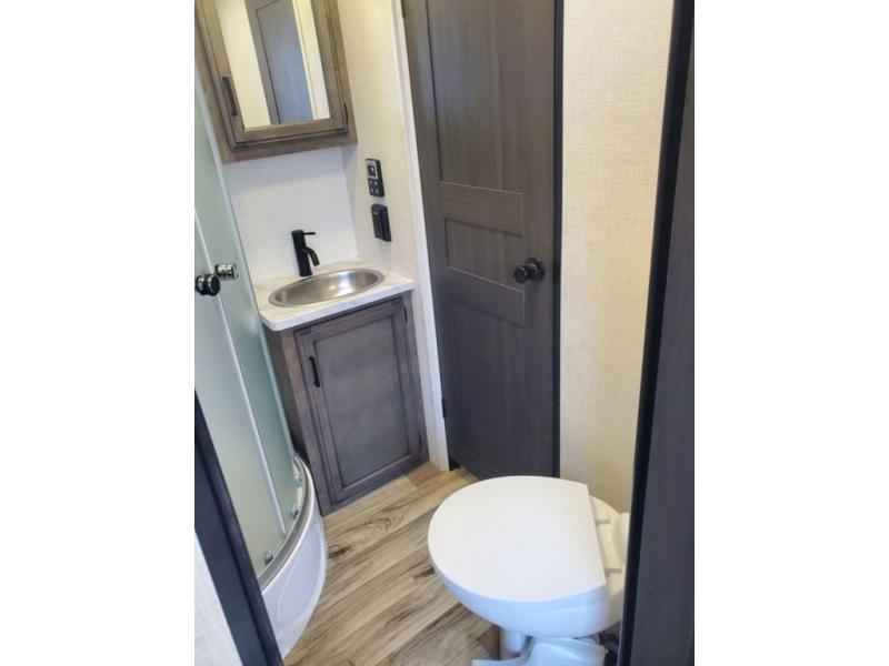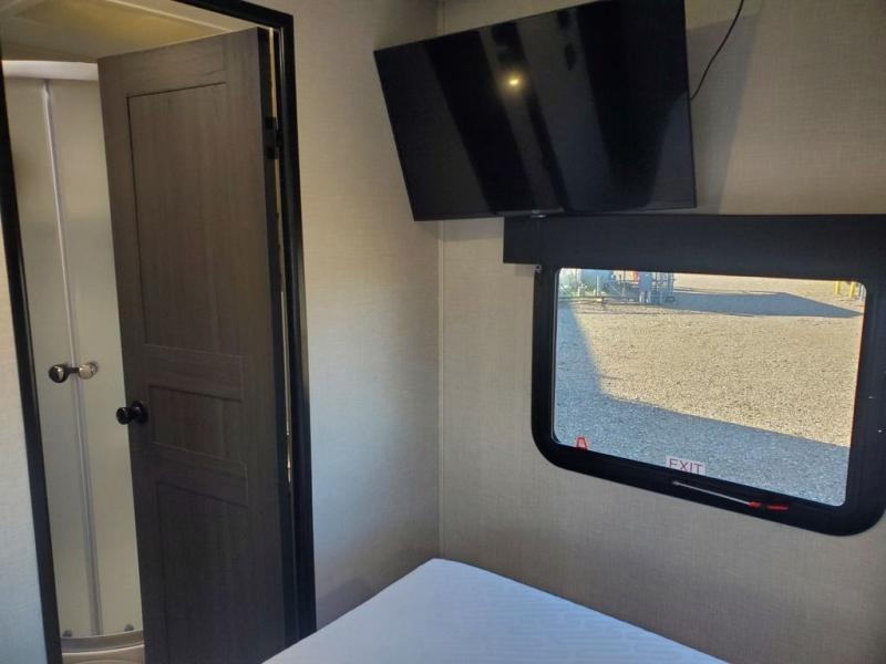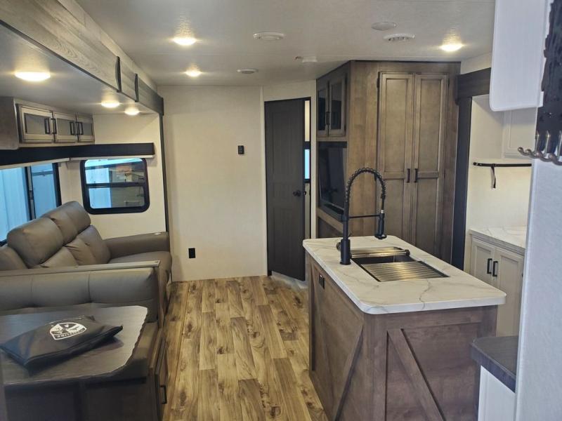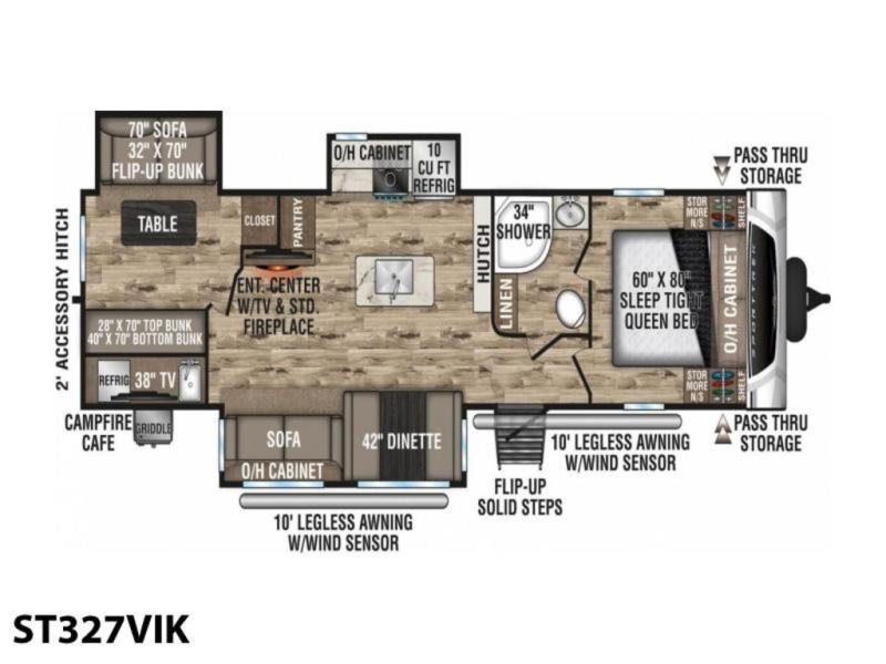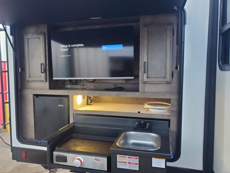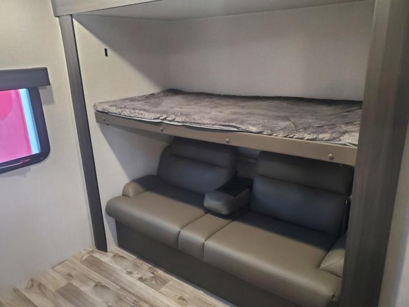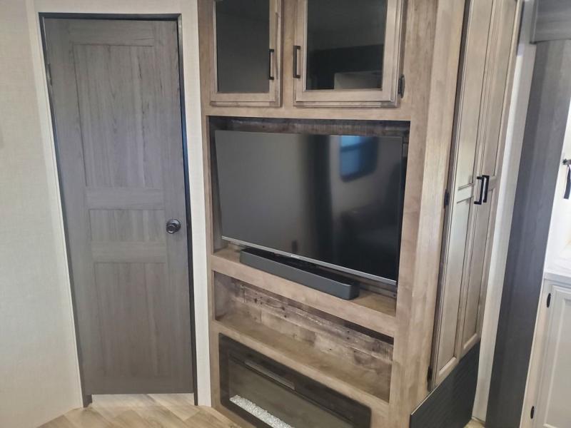 Stay protected rain or shine with the two 10' legless awnings with wind sensors on this travel trailer! Some other exterior features you will enjoy include a campfire café with a 40" TV to watch the big game while you grill steaks on the griddle, and the pass-through storage area with slam latch baggage doors will keep your gear in place. Inside, there is a rear private bunkhouse with a closet, a 32" x 70" flip-up bunk above a 70" sofa with a table, and a 28" x 70" bunk above a 40" x 70" bottom bunk. The living area has a sofa across from an entertainment center with a frameless fireplace and a 40" TV with a swing arm so others can watch it from the 42" booth dinette. The dual entry bathroom has a 34" radius shower to freshen up in, and is easy to access, especially those staying in the front private bedroom!