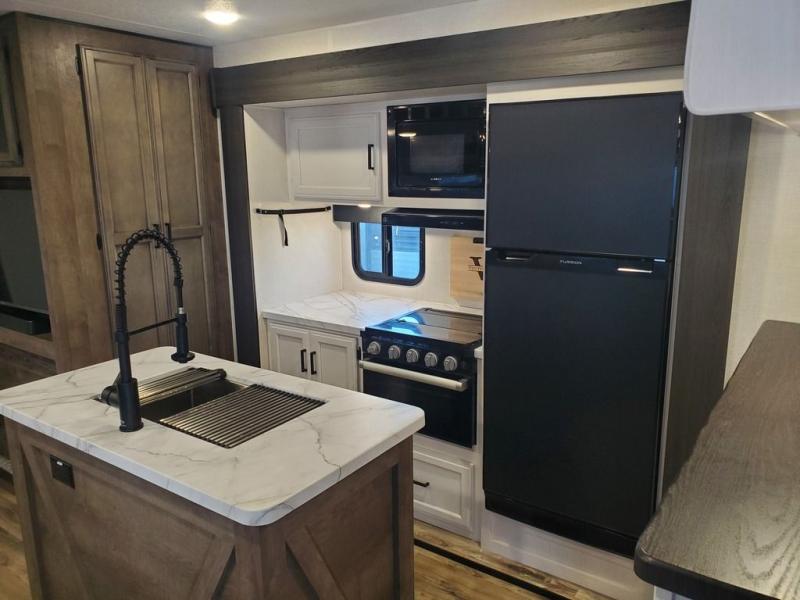 Every Venture RV SportTrek lightweight travel trailer is constructed to offer peace of mind and the comforts of home! Their purposeful residential kitchens are packed with handy features like a Furrion oven and three burner cooktop, a large stainless steel sink with a cover and dish drying rack, plus a 12V refrigerator. You will find plenty of storage throughout, including Safe-Tek hidden storage with a charging center and StorMore nightstands on either side of the bed behind the full-length closets. And the magnetic slam-latch baggage doors and spacious pass-through storage area will hold your outdoor gear in place. They even come with a hot and cold exterior shower and SporTrek's Weather Shield which includes a forced air heated and enclosed underbelly, high output A/C ducting, and more features that will let you extend your camping season. You will also love the new residential upgraded furniture, Serta memory foam mattress, barn style passage doors, and many more comforts!
