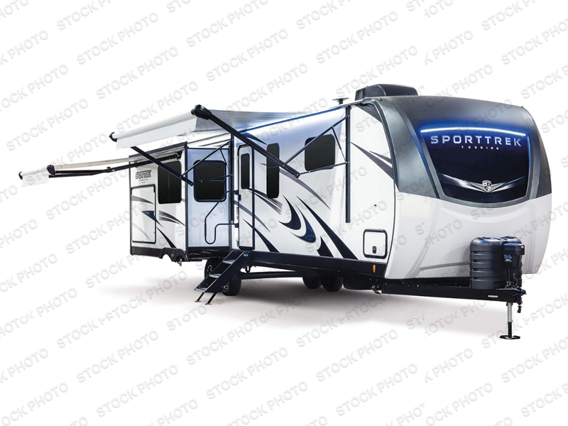 An elegant design and new features come with every one of these Venture RV SportTrek Touring Edition travel trailers! The NXG Huck bolt frame holds these units together and a walkable roof covers them. Heads will turn down the highway and at the campsite with an upgraded graphics package and a painted fiberglass front cap with integrated LED light. The exterior pass-through storage area has slam latch baggage doors with magnetic catches so you don't have to worry about them closing on you and a motion activated light to see your items clearly even at night. Luxury abounds throughout these units, especially with the mandatory Interior Luxury package which comes solid surface kitchen countertops, designer valances with fabric nightshades, two 30" frameless fireplaces, and Beauflor wood plank flooring that is easy to clean. Come find your favorite model today!
