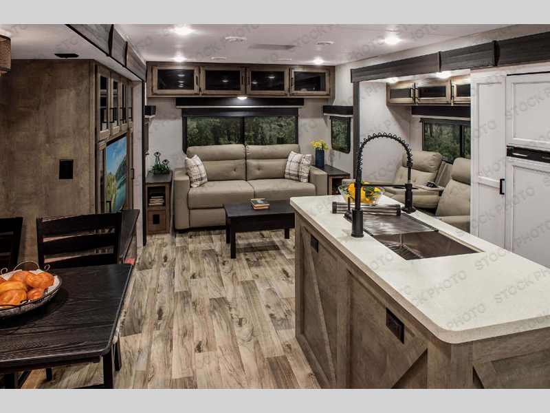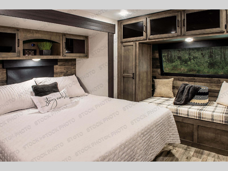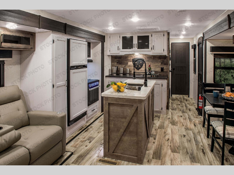 Pack your bags and hitch up this travel trailer for a great weekend camping trip! The front private bedroom has a 70" x 80" Sleep Tight king bed slide to lay your head at night, a dresser with a 30" frameless fireplace, a window seat with shelves on either side for your books, and a wardrobe with washer and dryer prep. Freshen up each morning in the full bathroom with the 30" x 36" shower then head to the kitchen to fry up some eggs on the three burner cooktop and pour a cold glass of orange juice stored in the 10 cu. ft. refrigerator. The kitchen island will make your meal prepping easier and the table and chairs offer a comfortable place to enjoy your meals or play card games. You could even cook your meals at the exterior campfire café and set up a table underneath one of the two power awnings!