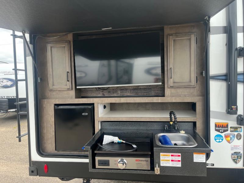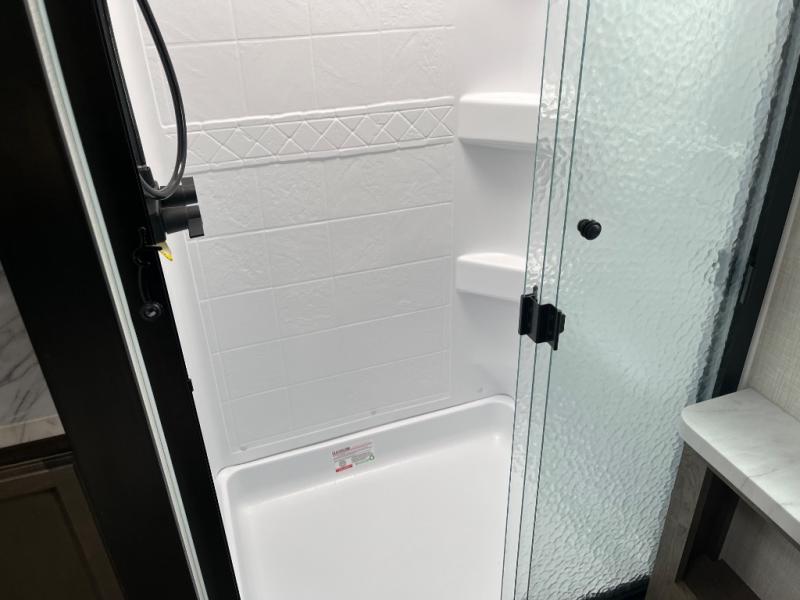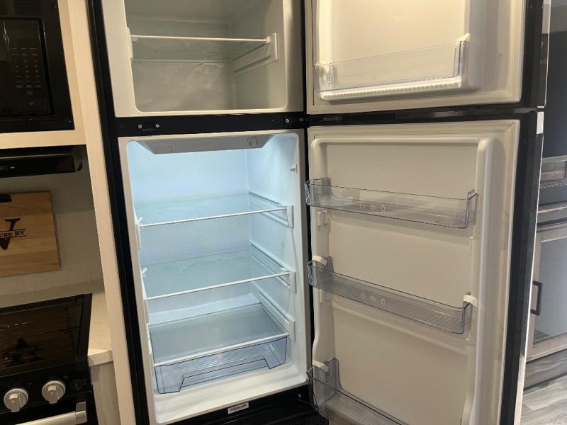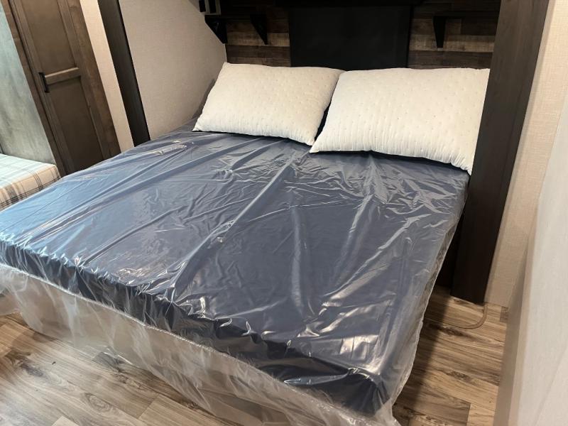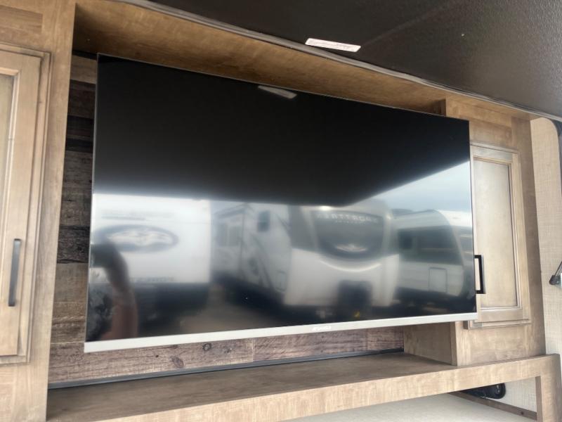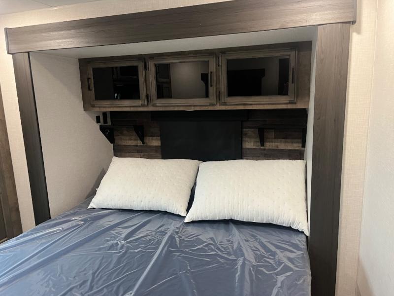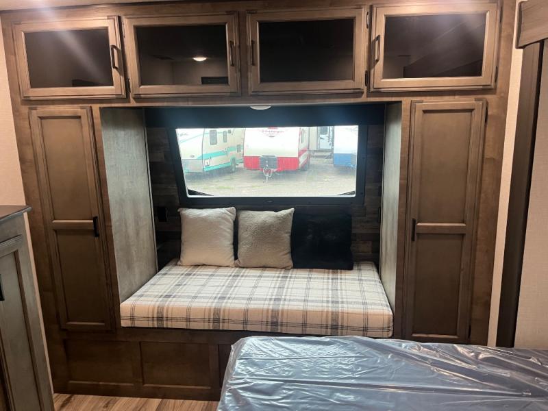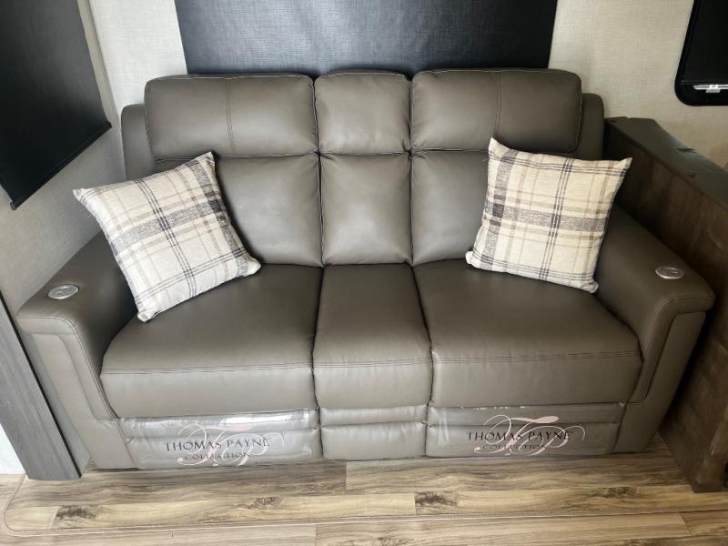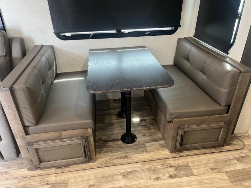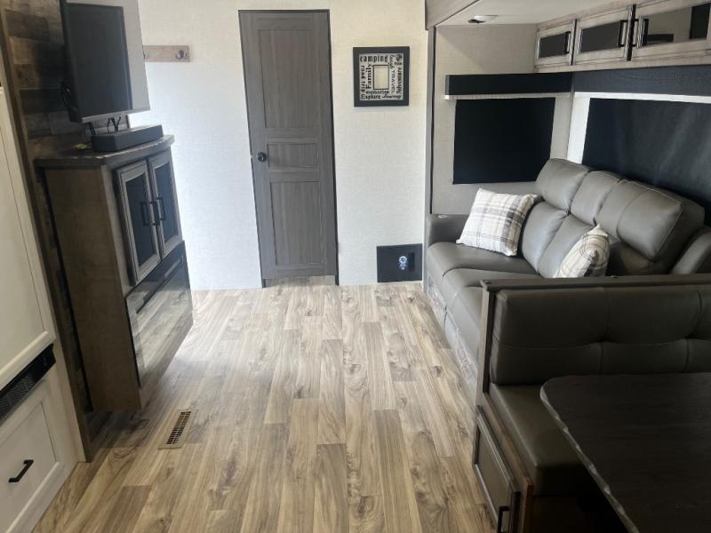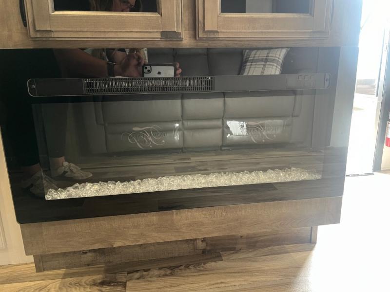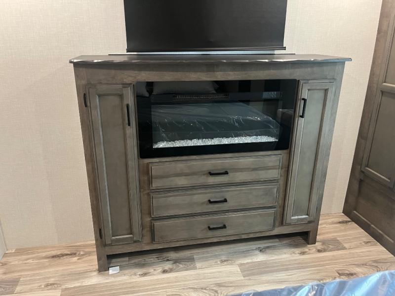 Pack your bags for an adventure of a lifetime with your spouse in this travel trailer! The front private bedroom has a 70" x 80" Sleep Tight king bed slide for more interior space, a dresser with a 30" frameless fireplace and TV, and a window seat to read a book with a view. Freshen up each morning in the rear full bathroom with the 30" x 36" shower and store your linens in the three door linen closet then head to the fully equipped kitchen to fry up some eggs on the three burner cooktop. The 42" grand dinette offers a comfortable place to enjoy your meals, play card games, and even transform into an extra sleeping space. Grab a snack from the walk-in pantry with coat hooks and relax on the 70" tri-fold sofa bed across from the entertainment center with a 30" frameless fireplace!
