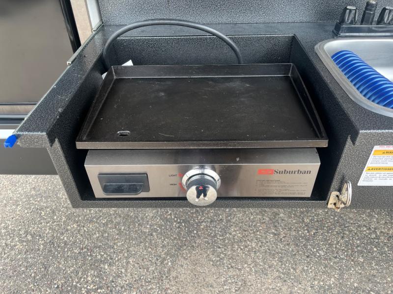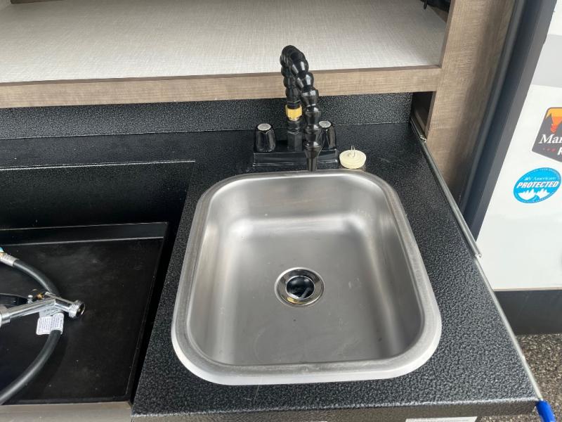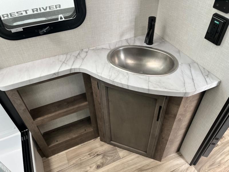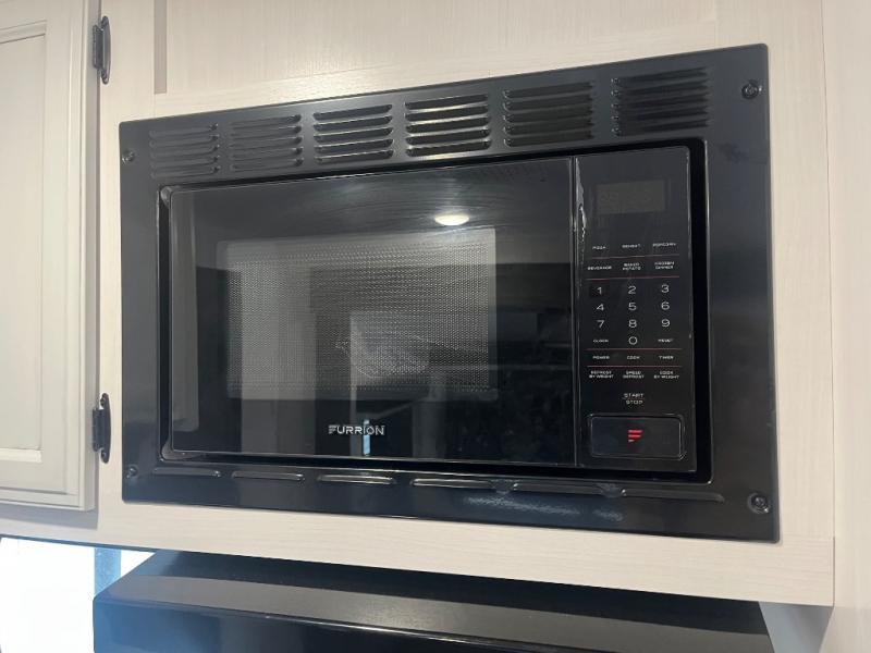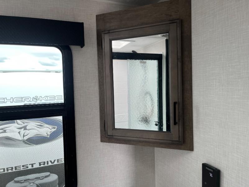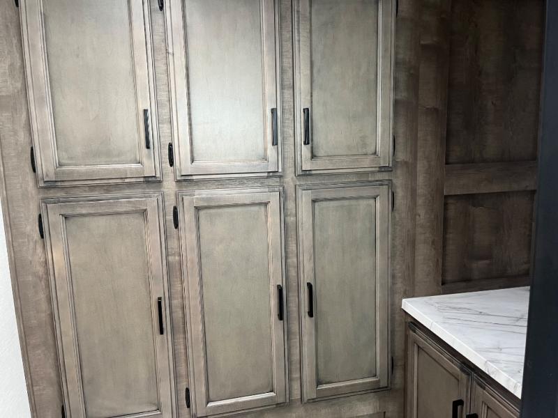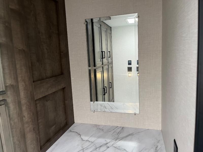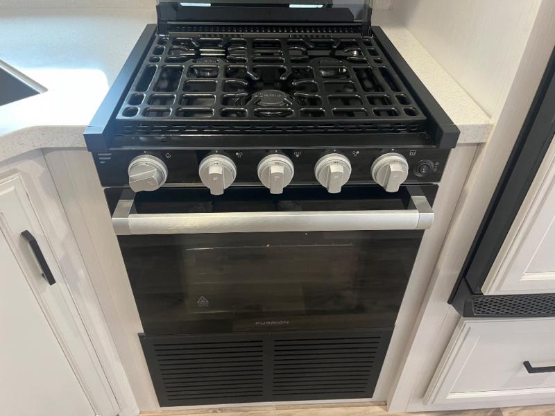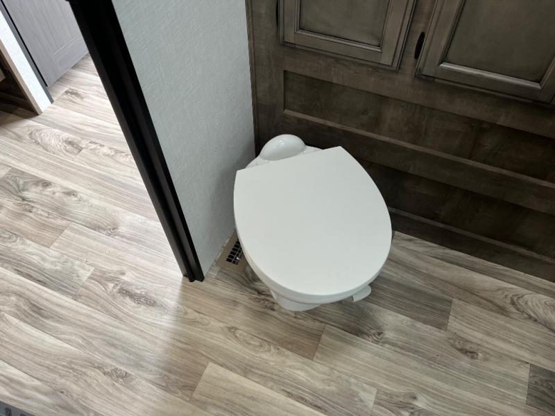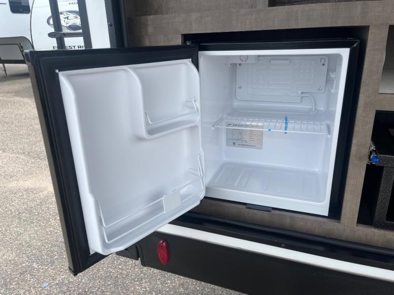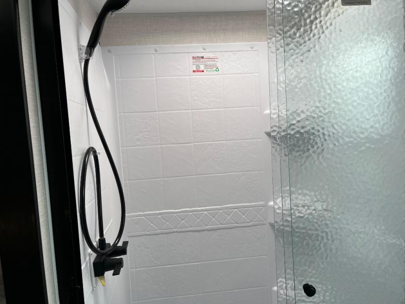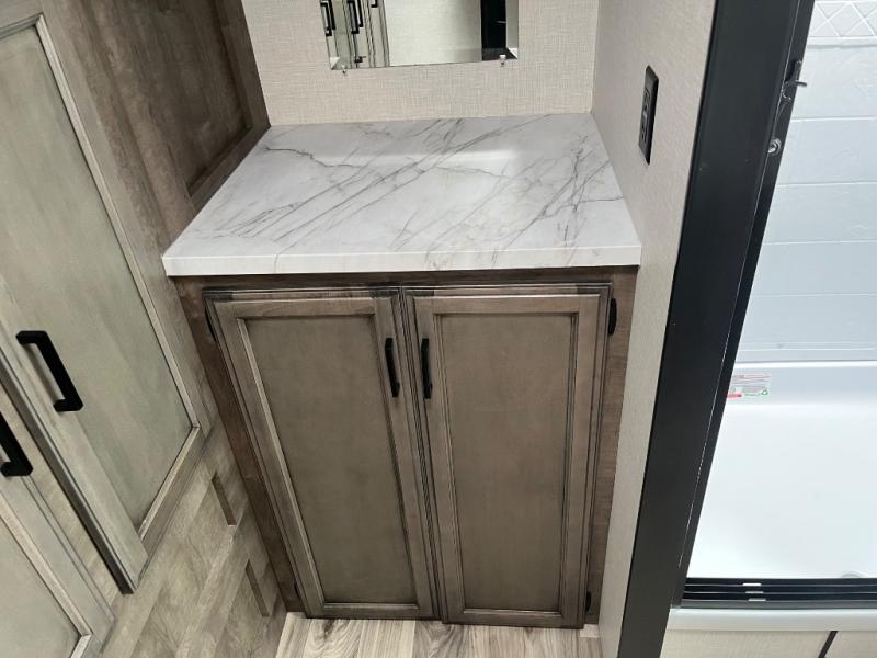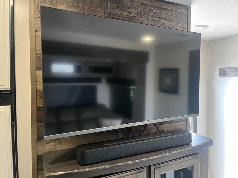 Pack your bags for an adventure of a lifetime with your spouse in this travel trailer! The front private bedroom has a 70" x 80" Sleep Tight king bed slide for more interior space, a dresser with a 30" frameless fireplace and TV, and a window seat to read a book with a view. Freshen up each morning in the rear full bathroom with the 30" x 36" shower and store your linens in the three door linen closet then head to the fully equipped kitchen to fry up some eggs on the three burner cooktop. The 42" grand dinette offers a comfortable place to enjoy your meals, play card games, and even transform into an extra sleeping space. Grab a snack from the walk-in pantry with coat hooks and relax on the 70" tri-fold sofa bed across from the entertainment center with a 30" frameless fireplace!