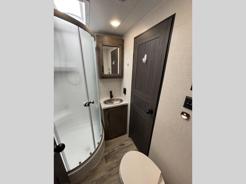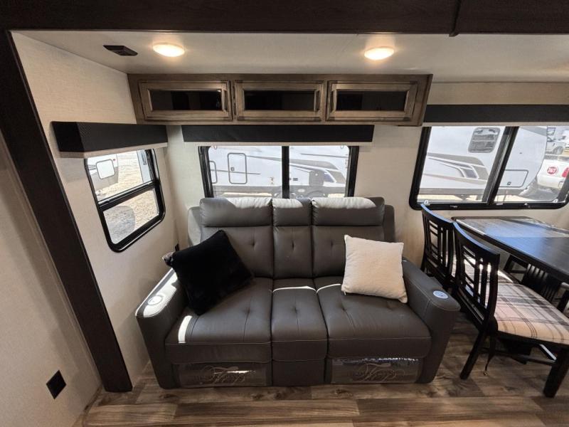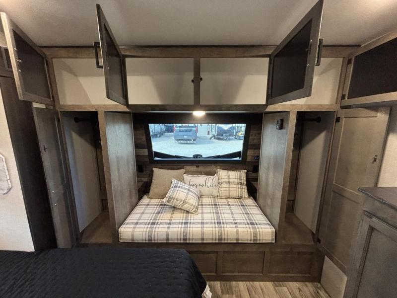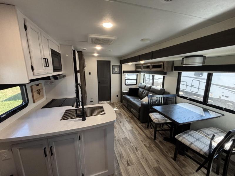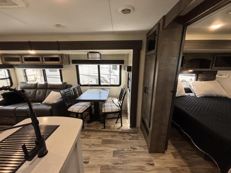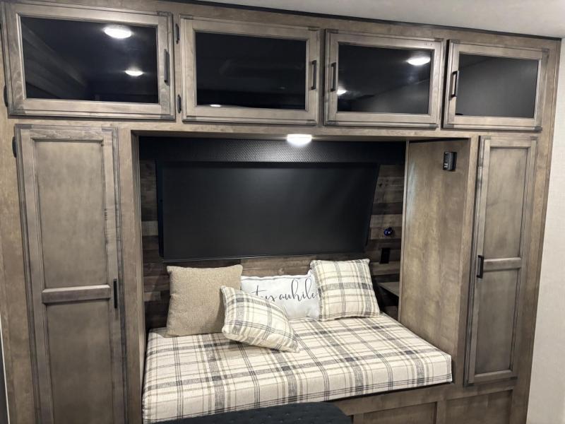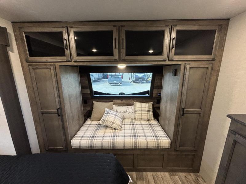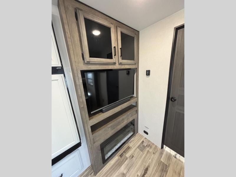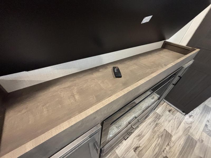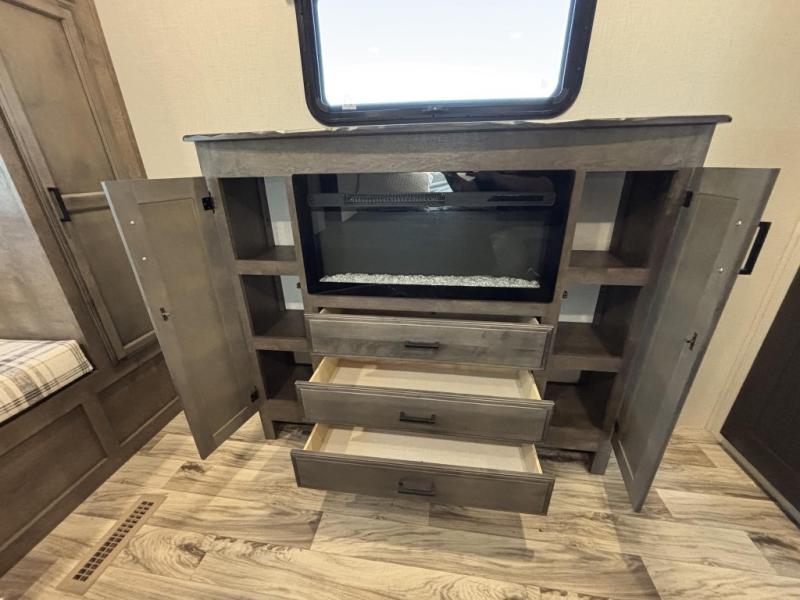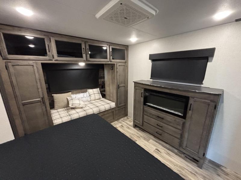 Sleep tight in this travel trailer with the 70" x 80" Sleep Tight king bed in the front private bedroom! The bedroom also has a dresser with a 30" frameless fireplace and TV, as well as a window seat for a view of your beautiful surroundings as you read a book. The chef can prepare their best meals inside with the three burner cooktop and 10 cu. ft. refrigerator or head to the exterior campfire café with a refrigerator, a griddle, and a sink for clean up while staying protected from the 20' power awning. Enjoy your meals at the table and chairs then relax on the 70" sofa to let your food settle while you watch a movie or the 30" frameless fireplace at the entertainment center. The full rear bathroom has a 34" radius shower to freshen up in each morning, a linen closet for your towels, and a closet that has a dresser with a mirror and washer and dryer prep!