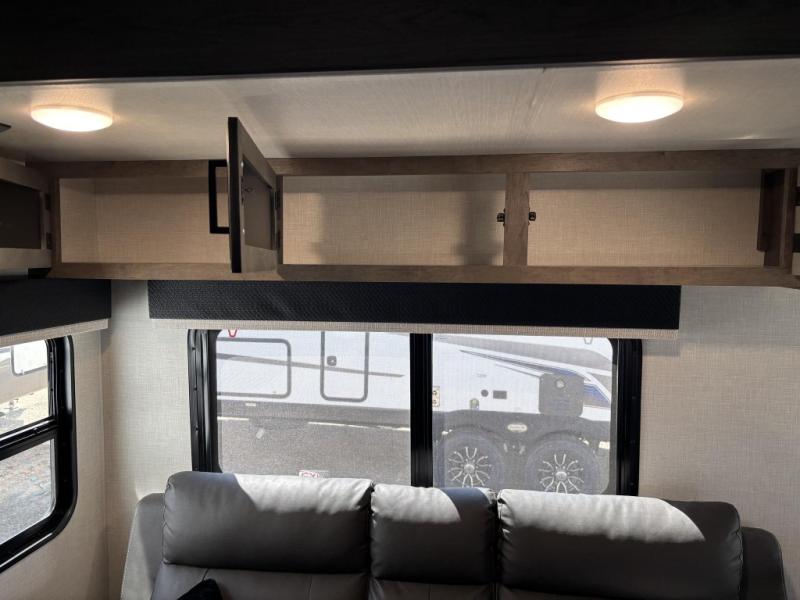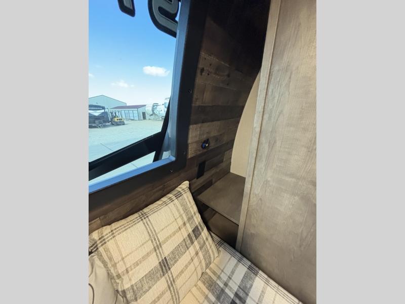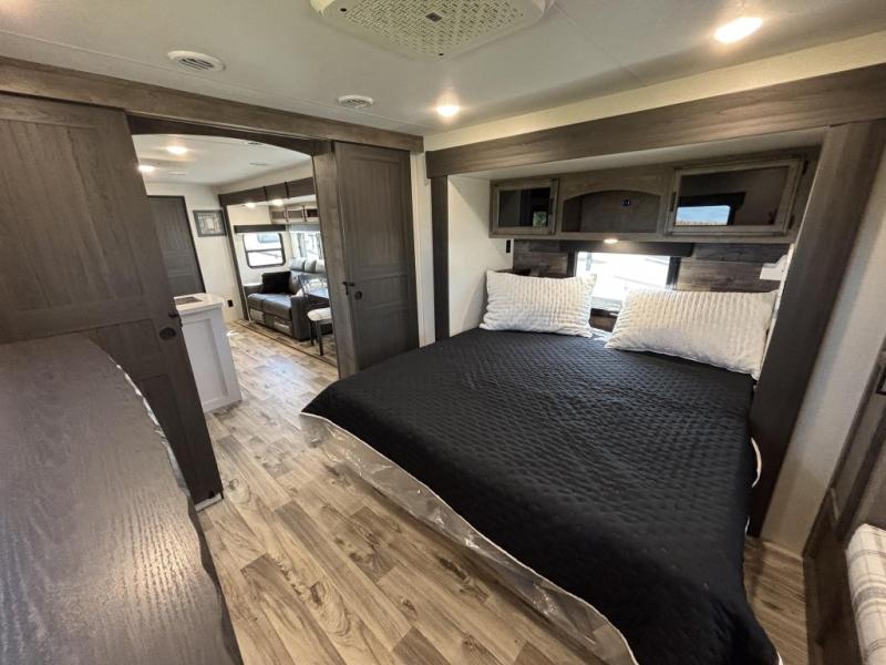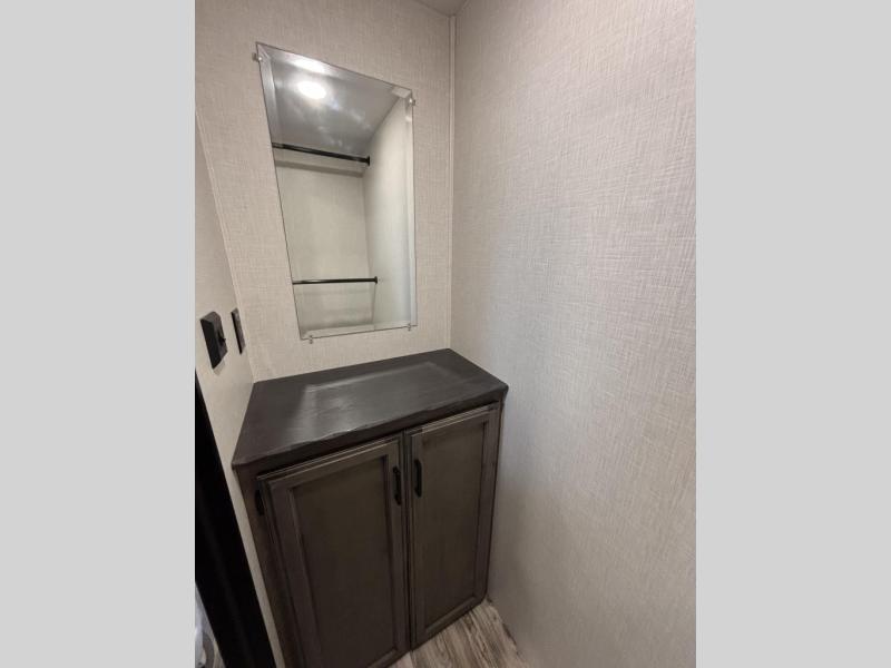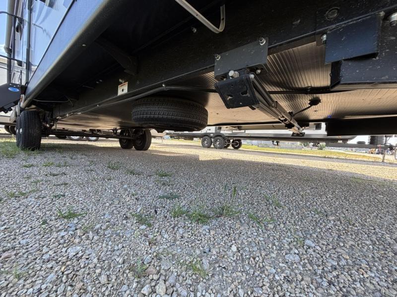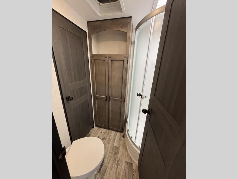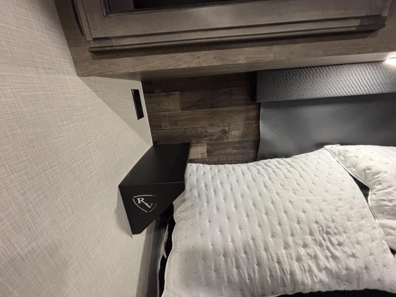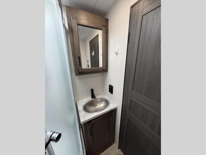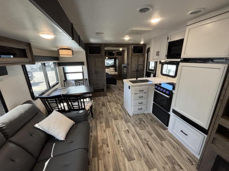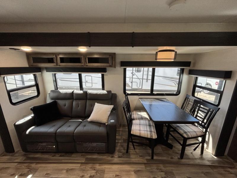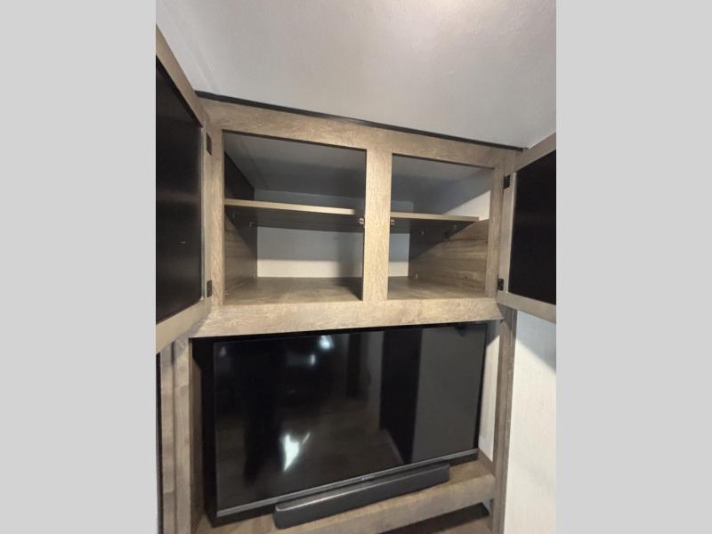 Sleep tight in this travel trailer with the 70" x 80" Sleep Tight king bed in the front private bedroom! The bedroom also has a dresser with a 30" frameless fireplace and TV, as well as a window seat for a view of your beautiful surroundings as you read a book. The chef can prepare their best meals inside with the three burner cooktop and 10 cu. ft. refrigerator or head to the exterior campfire café with a refrigerator, a griddle, and a sink for clean up while staying protected from the 20' power awning. Enjoy your meals at the table and chairs then relax on the 70" sofa to let your food settle while you watch a movie or the 30" frameless fireplace at the entertainment center. The full rear bathroom has a 34" radius shower to freshen up in each morning, a linen closet for your towels, and a closet that has a dresser with a mirror and washer and dryer prep!