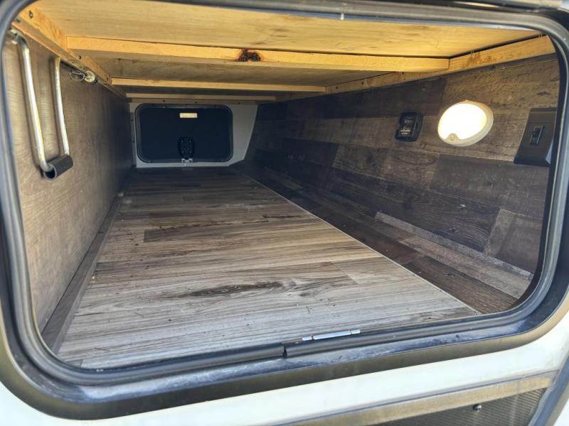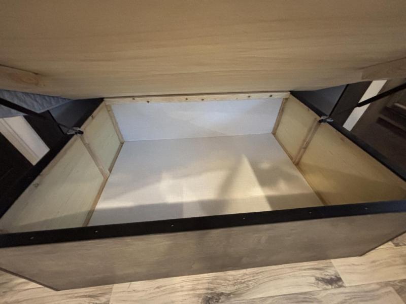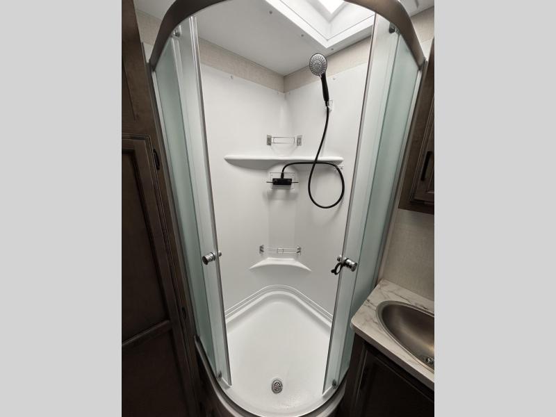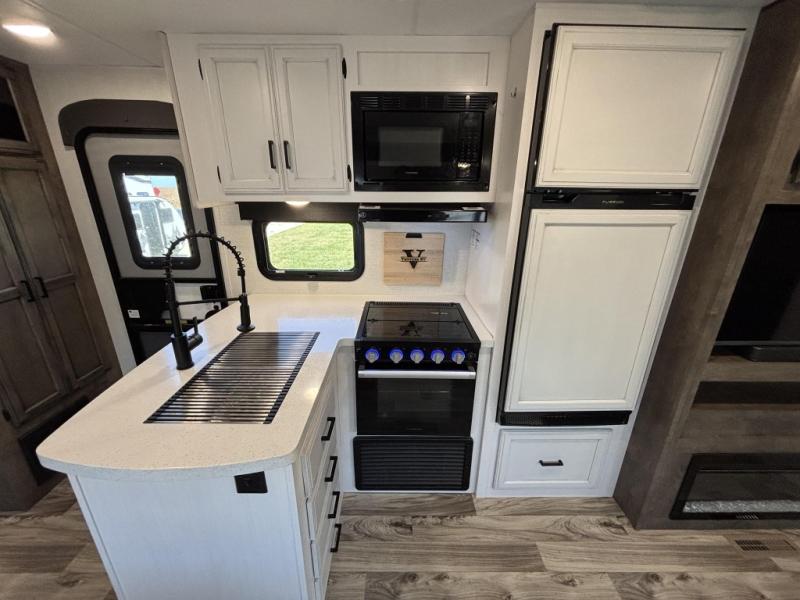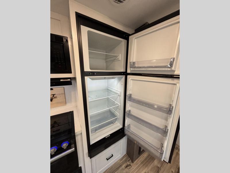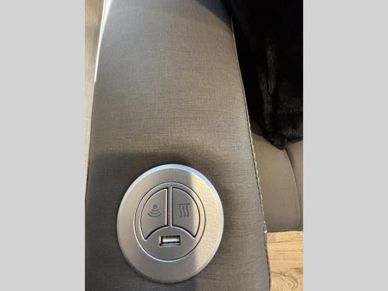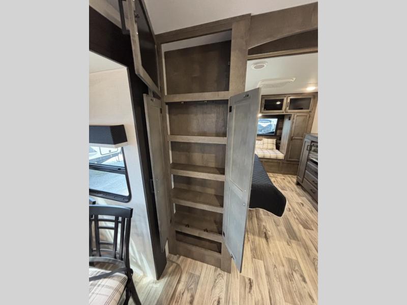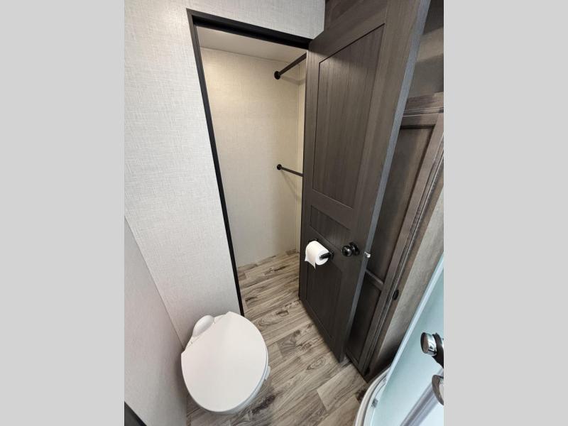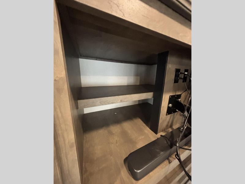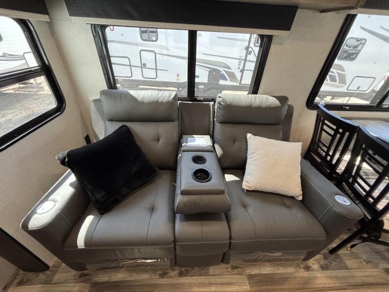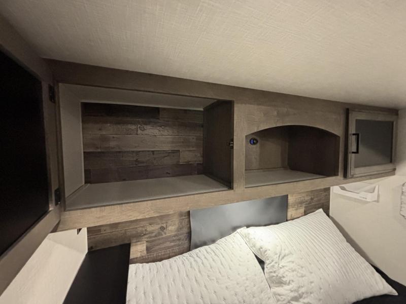 Sleep tight in this travel trailer with the 70" x 80" Sleep Tight king bed in the front private bedroom! The bedroom also has a dresser with a 30" frameless fireplace and TV, as well as a window seat for a view of your beautiful surroundings as you read a book. The chef can prepare their best meals inside with the three burner cooktop and 10 cu. ft. refrigerator or head to the exterior campfire café with a refrigerator, a griddle, and a sink for clean up while staying protected from the 20' power awning. Enjoy your meals at the table and chairs then relax on the 70" sofa to let your food settle while you watch a movie or the 30" frameless fireplace at the entertainment center. The full rear bathroom has a 34" radius shower to freshen up in each morning, a linen closet for your towels, and a closet that has a dresser with a mirror and washer and dryer prep!