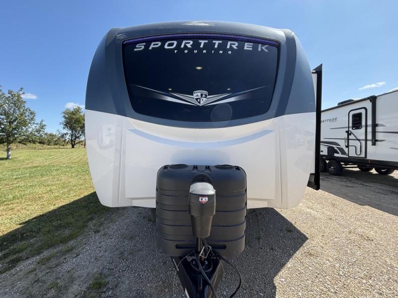 An elegant design and new features come with every one of these Venture RV SportTrek Touring Edition travel trailers! The NXG Huck bolt frame holds these units together and a walkable roof covers them. Heads will turn down the highway and at the campsite with an upgraded graphics package and a painted fiberglass front cap with integrated LED light. The exterior pass-through storage area has slam latch baggage doors with magnetic catches so you don't have to worry about them closing on you and a motion activated light to see your items clearly even at night. Luxury abounds throughout these units, especially with the mandatory Interior Luxury package which comes with solid surface kitchen countertops, designer valances with fabric nightshades, two 30" frameless fireplaces, and Beauflor wood plank flooring that is easy to clean. Come find your favorite model today!