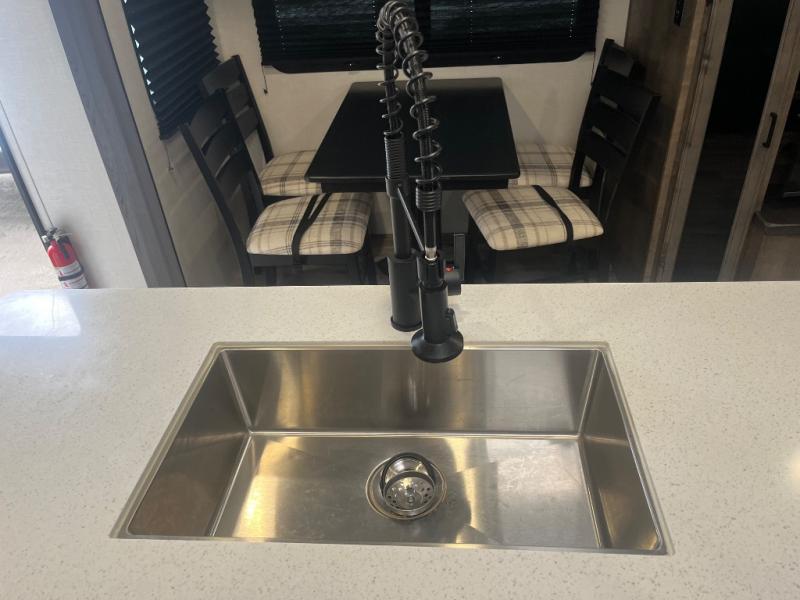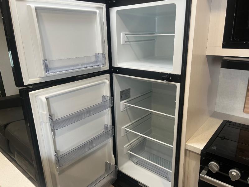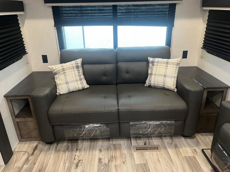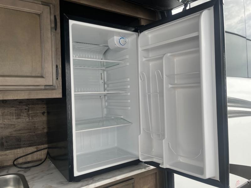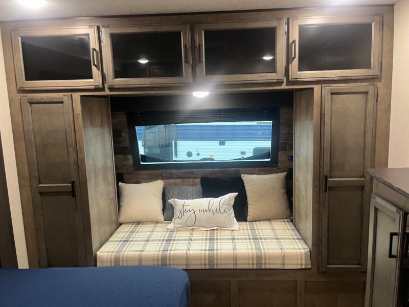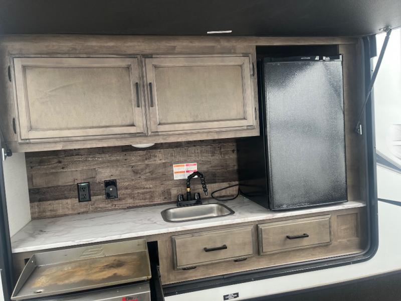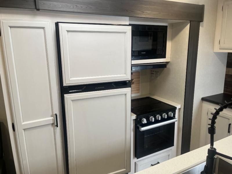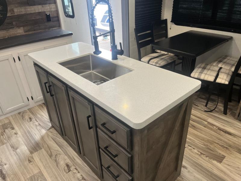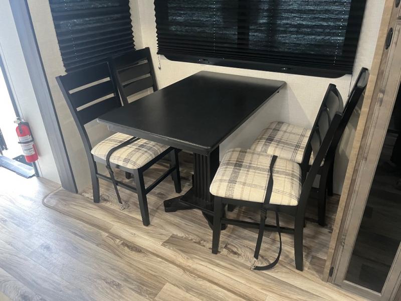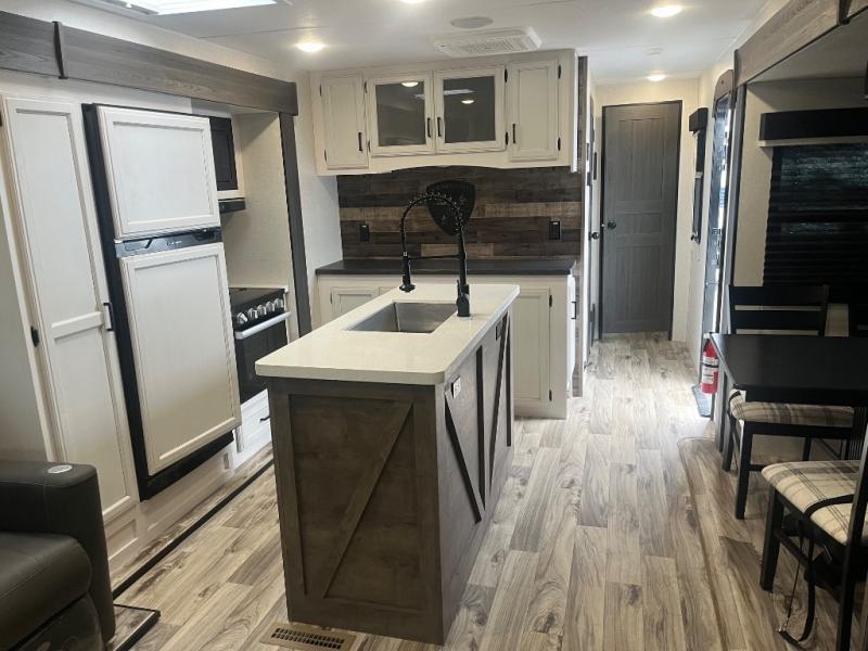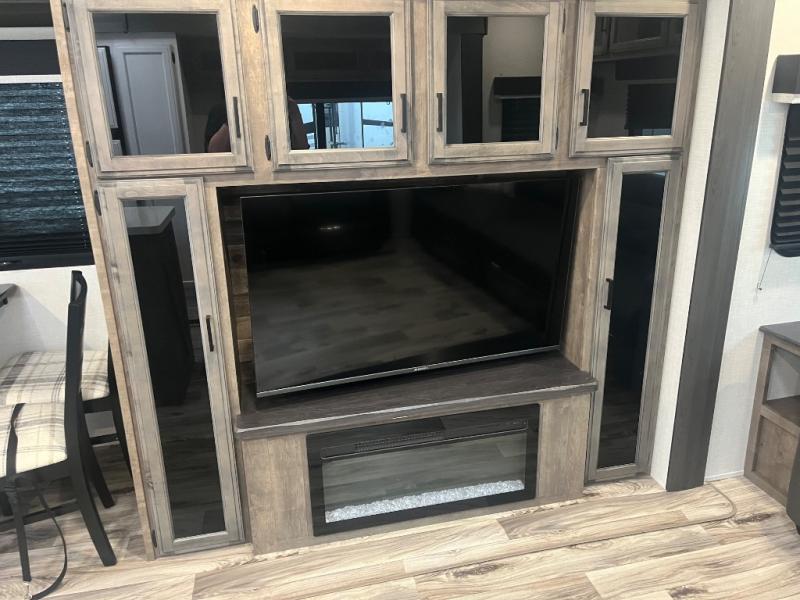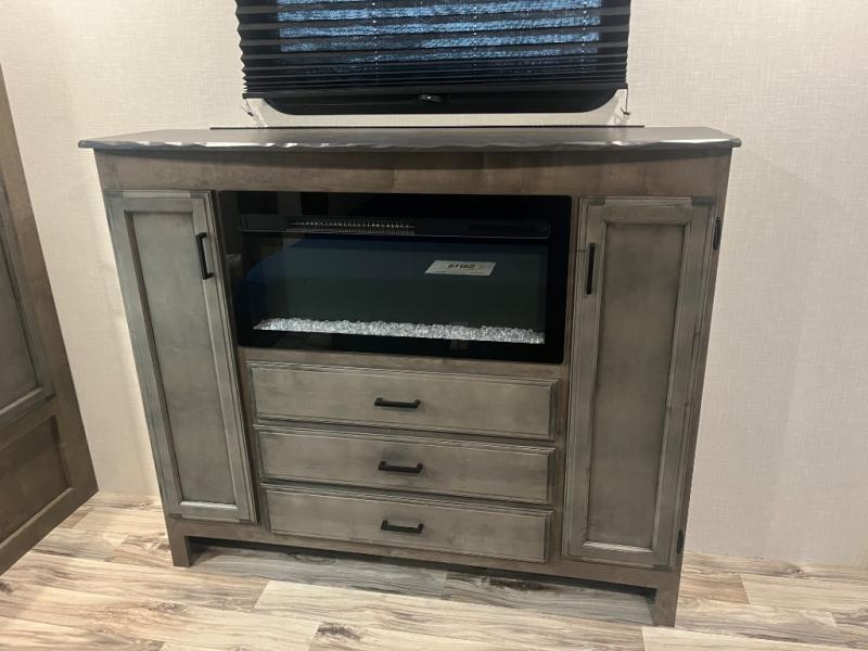 Pack your bags and hitch up this travel trailer for a great weekend camping trip! The front private bedroom has a 70" x 80" Sleep Tight king bed slide to lay your head at night, a dresser with a 30" frameless fireplace, a window seat with shelves on either side for your books, and a wardrobe with washer and dryer prep. Freshen up each morning in the full bathroom with the 30" x 36" shower then head to the kitchen to fry up some eggs on the three burner cooktop and pour a cold glass of orange juice stored in the 10 cu. ft. refrigerator. The kitchen island will make your meal prepping easier and the table and chairs offer a comfortable place to enjoy your meals or play card games. You could even cook your meals at the exterior campfire café and set up a table underneath one of the two power awnings!