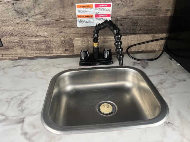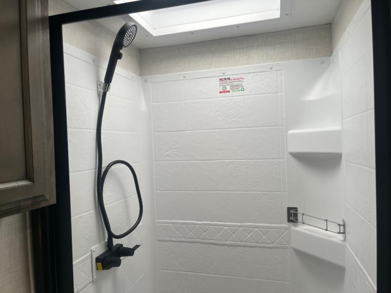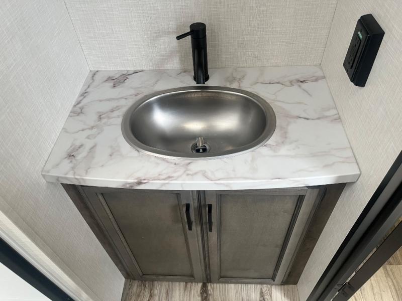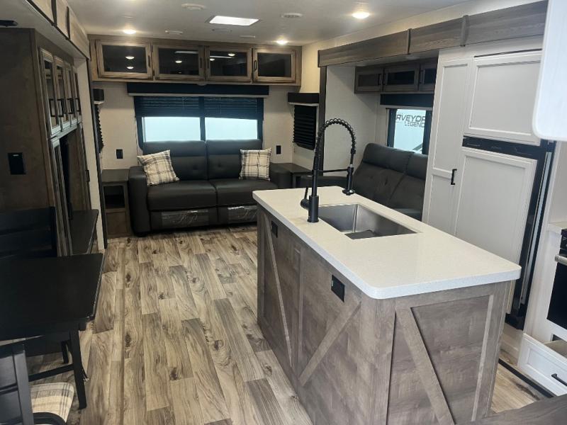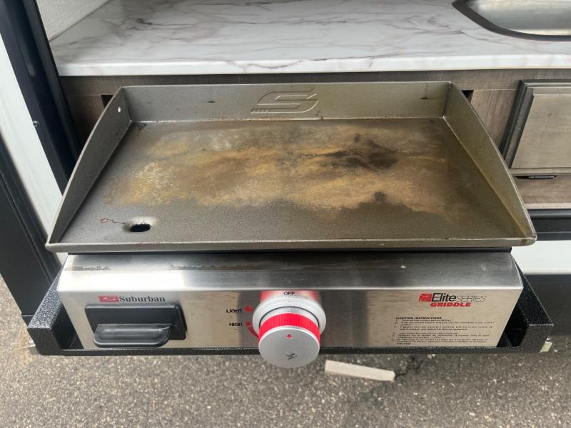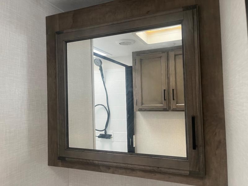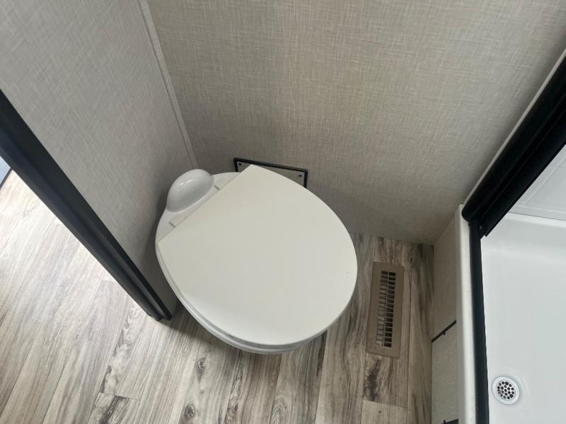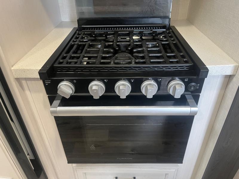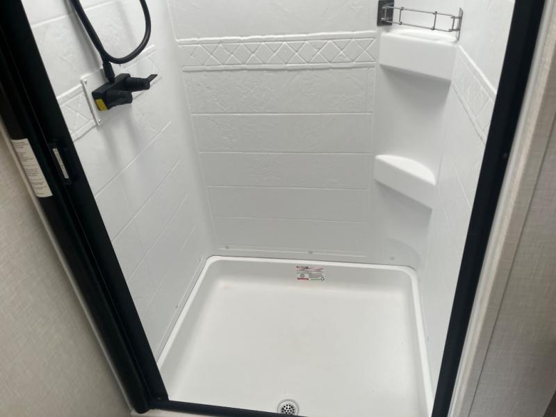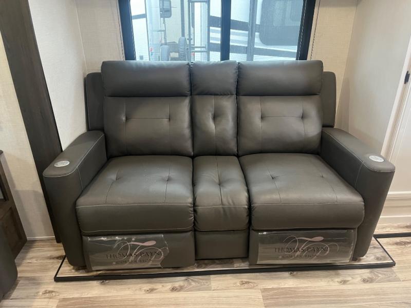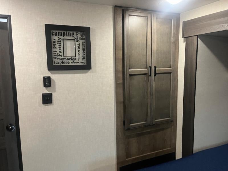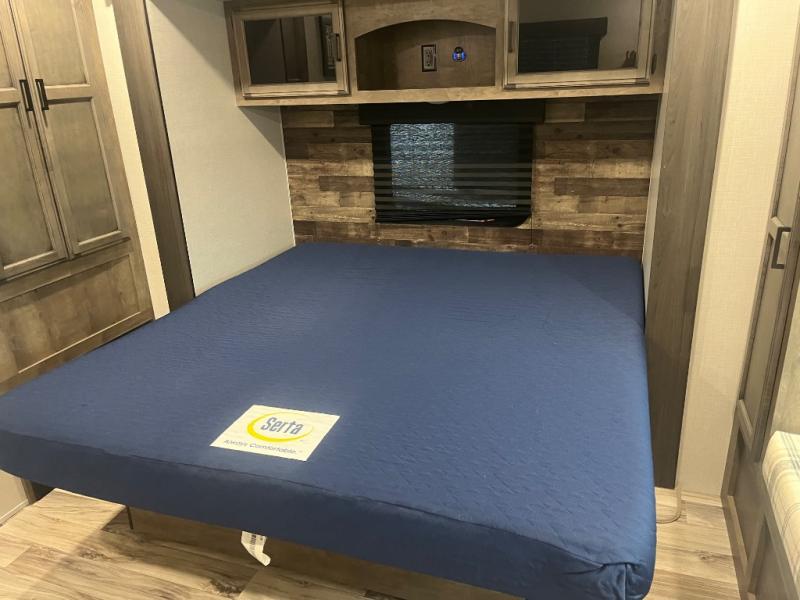 Pack your bags and hitch up this travel trailer for a great weekend camping trip! The front private bedroom has a 70" x 80" Sleep Tight king bed slide to lay your head at night, a dresser with a 30" frameless fireplace, a window seat with shelves on either side for your books, and a wardrobe with washer and dryer prep. Freshen up each morning in the full bathroom with the 30" x 36" shower then head to the kitchen to fry up some eggs on the three burner cooktop and pour a cold glass of orange juice stored in the 10 cu. ft. refrigerator. The kitchen island will make your meal prepping easier and the table and chairs offer a comfortable place to enjoy your meals or play card games. You could even cook your meals at the exterior campfire café and set up a table underneath one of the two power awnings!