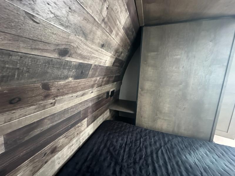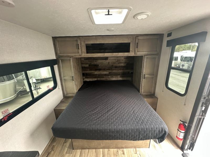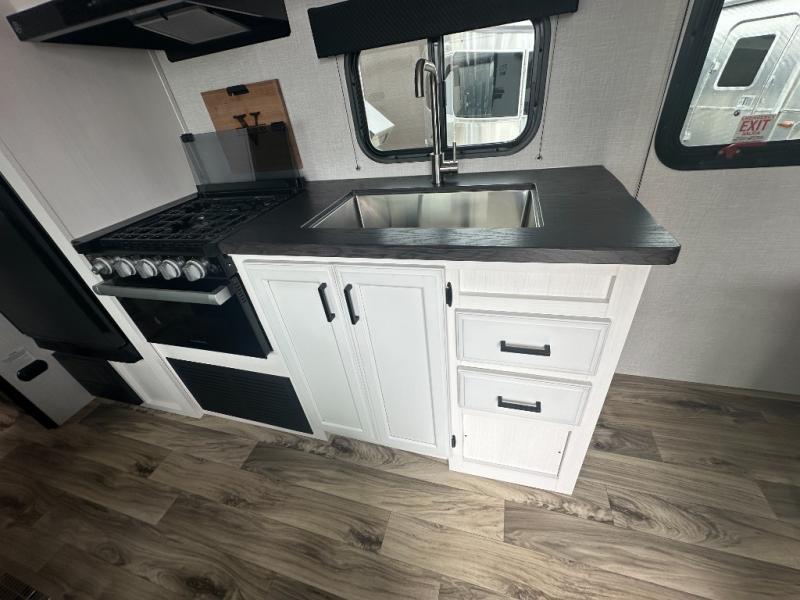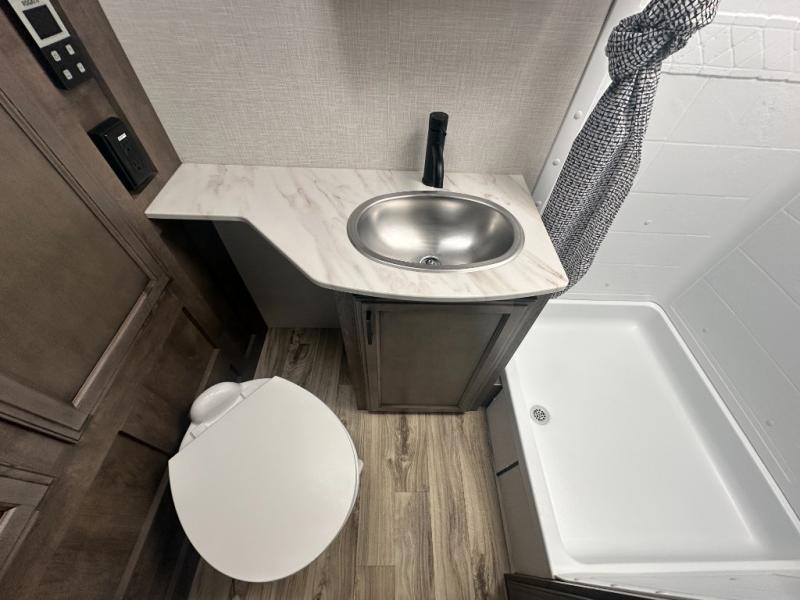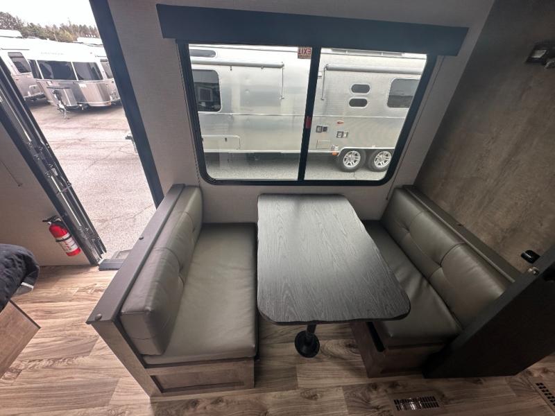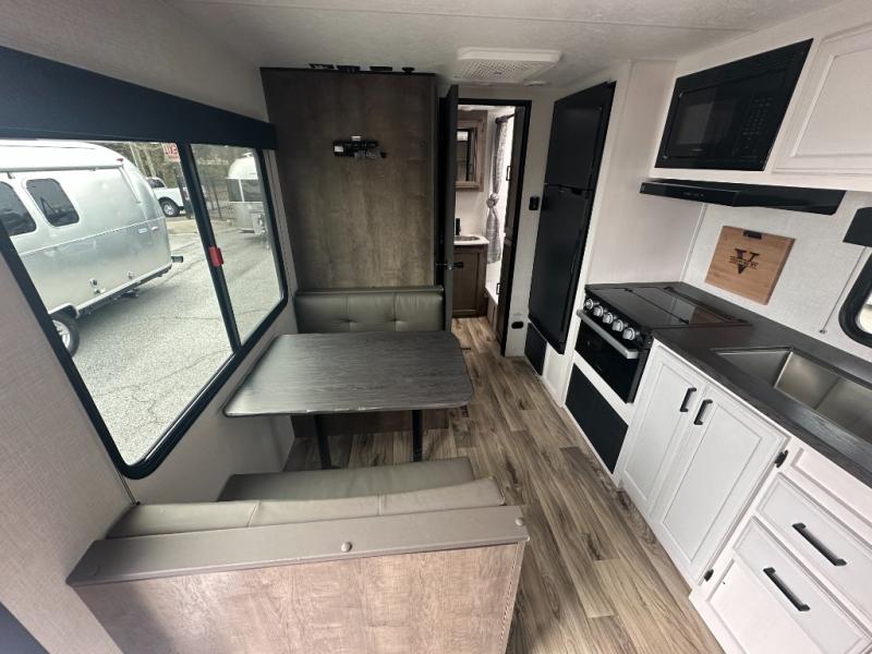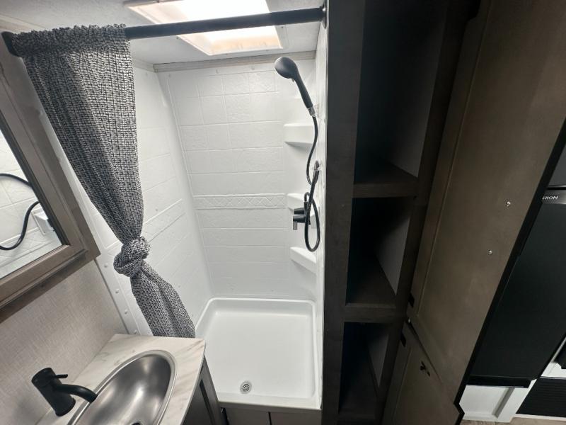 If you want to experience nature while not sacrificing creature comforts, this travel trailer is for you! The full rear bath includes a 30" x 36" shower with a motion-activated nightlight and a linen closet to keep towels organized. You will love sleeping on the Sleep Tight queen bed with dual wardrobes and shelves on either side of the bed, and the booth dinette lets one or two little ones sleep here. It will be so easy to whip up breakfast on the Furrion oven with a three burner cooktop or make instant oatmeal in the microwave oven. There is also a 10 cu. ft. 12V refrigerator and a pantry for food storage, and don't overlook the exterior with its refrigerator, 16' awning, and flip-up solid steps!
