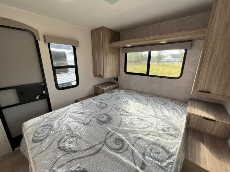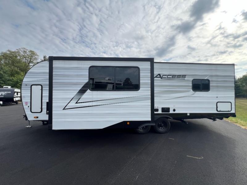 This single slide Access travel trailer features a front kitchen layout, a large roadside slide, and a private bedroom beyond a walk-through full bath. It also features both front and rear pass-through storage, as well as dual entry doors! You will find the main combined living area and kitchen open and spacious thanks to the slide. Cook your family their favorite meals with the appliances inside, dine at the 72" x 41" dinette where you can add an optional TV above to enjoy from the theater seating opposite. A convenient walk-through bath is spacious enough for two to get ready at once since it is the full width of the trailer. Next, head through space saving sliding doors to the rear private bedroom with its own access to the outside through the second entry. Here a queen bed awaits for a great nights rest. This bedroom offers plenty of storage in bedside wardrobes, a closet just off the foot of the bed, in under bed storage for extra blankets and larger items, plus so much more!