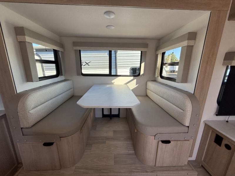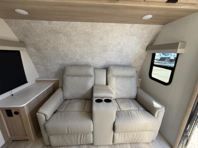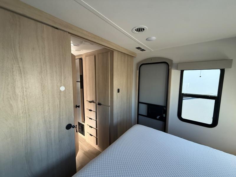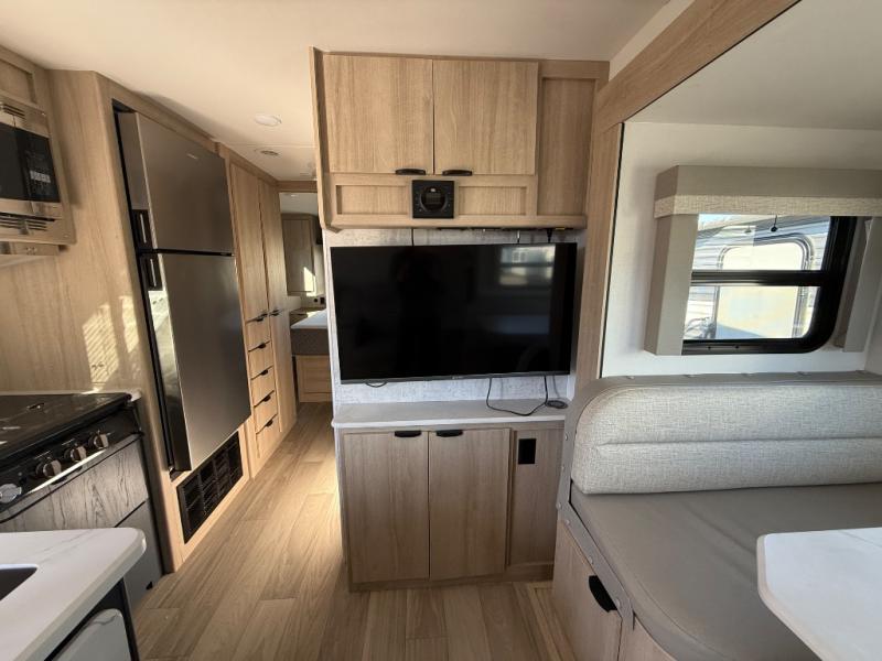 Dual entry doors will provide a smooth flow of traffic in and out of this cozy travel trailer, so come take a look! The front living area includes a tri-fold sofa with two end tables/cabinets, a booth dinette slide out, and a Smart TV to watch your favorite shows. There are two pantries for added storage and a flip-up counter in the kitchen for extra counter space. This model includes a full bath to clean up each day, and a wardrobe right across the hall to store towels. And check out the rear private bedroom with a queen bed, dual wardrobes and nightstands, and its own exterior entry door for convenience!