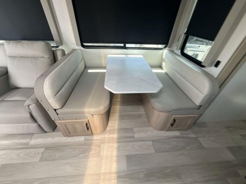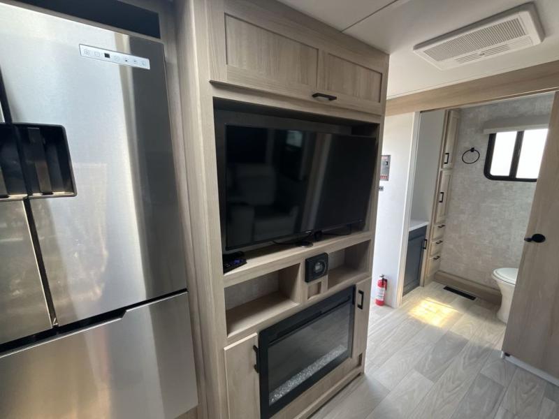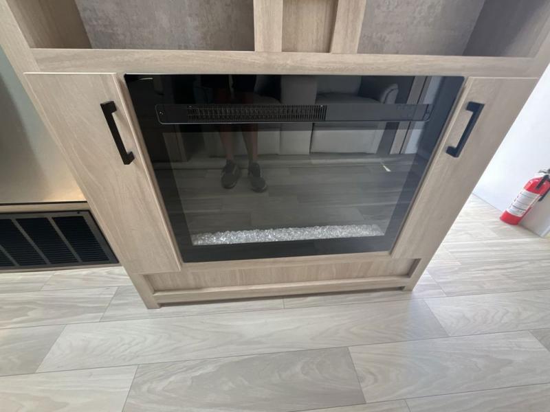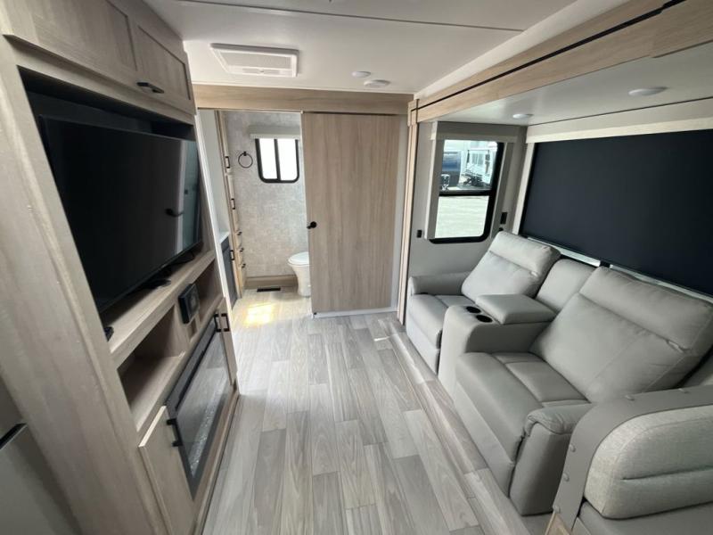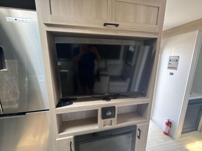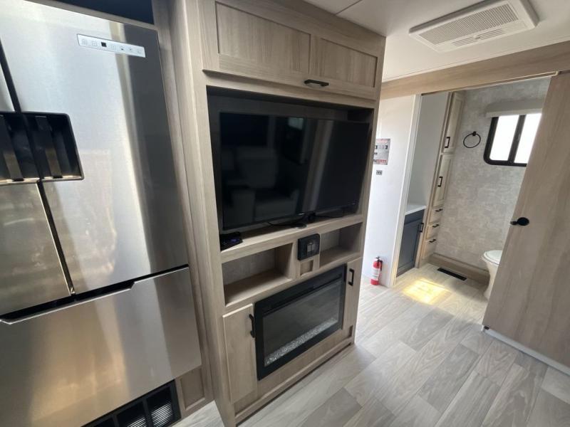 Convenience and comfort are found throughout as you return to your own accommodations after exploring the campgrounds. There are two entry doors so that you can choose to either enter the front private bedroom or the main living area. When you choose to enter through the main entrance, you will be met with a walk-in pantry to your right and a full rear bathroom to your left which is quite convenient. Within the main living area there is a large slide that has a tri-fold sofa and booth dinette across from the kitchen area. You will love sitting back on these pieces of furniture while you watch the Smart TV within the entertainment center across from you.