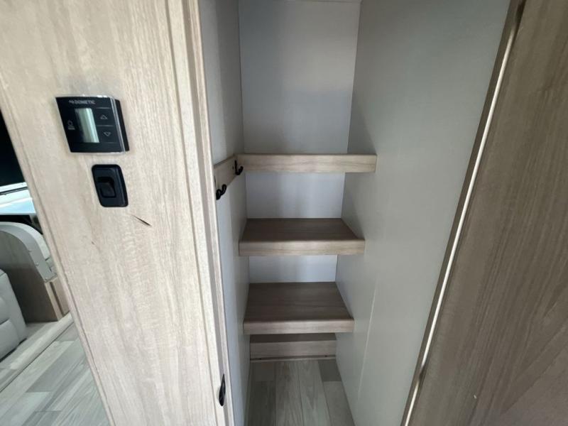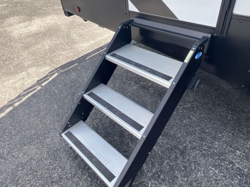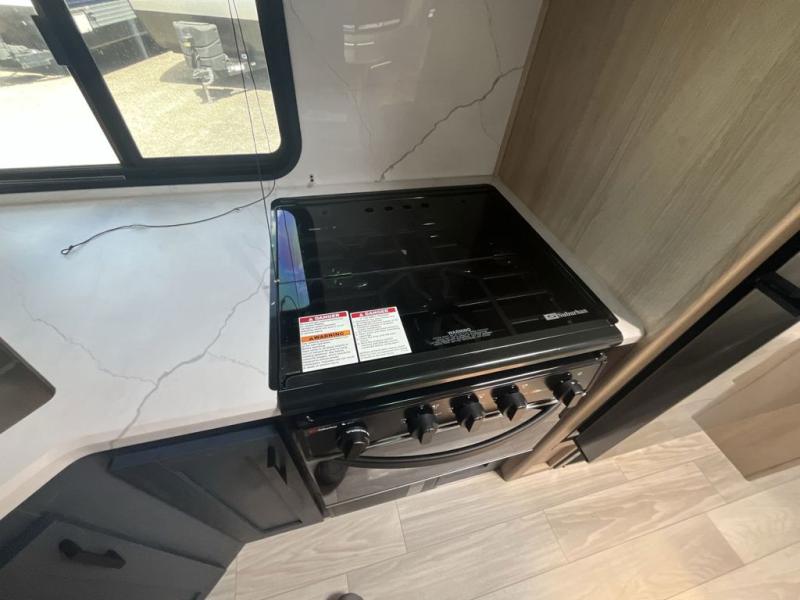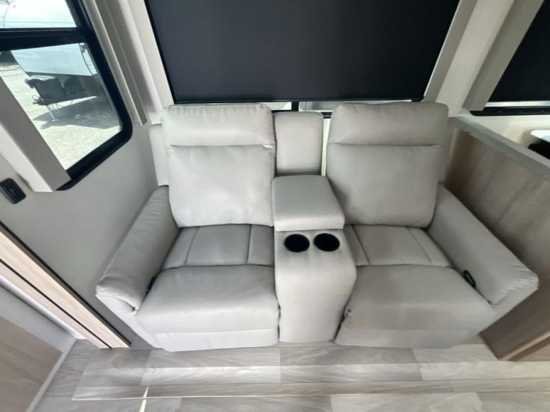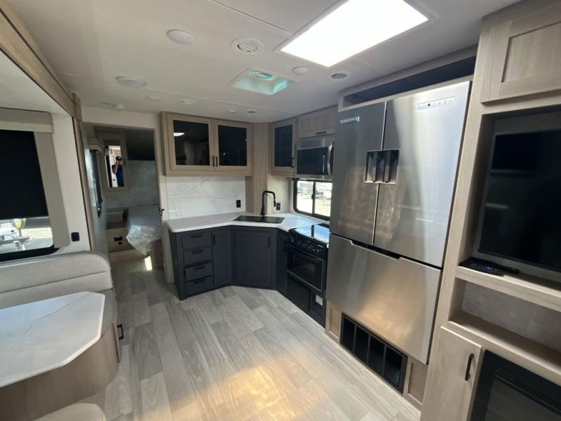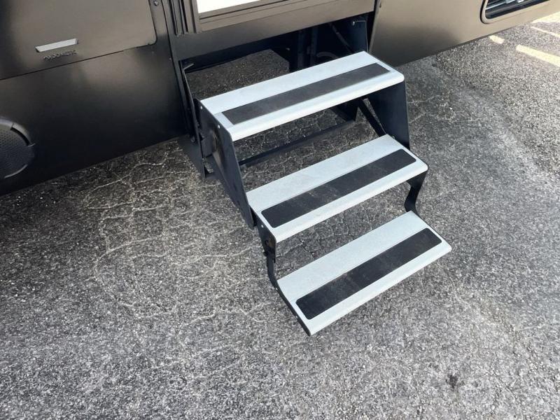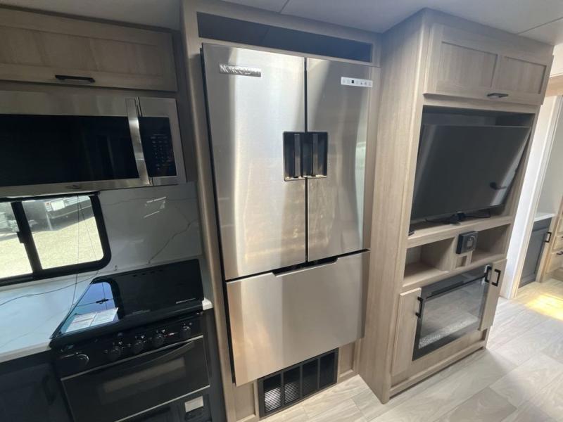 Convenience and comfort are found throughout as you return to your own accommodations after exploring the campgrounds. There are two entry doors so that you can choose to either enter the front private bedroom or the main living area. When you choose to enter through the main entrance, you will be met with a walk-in pantry to your right and a full rear bathroom to your left which is quite convenient. Within the main living area there is a large slide that has a tri-fold sofa and booth dinette across from the kitchen area. You will love sitting back on these pieces of furniture while you watch the Smart TV within the entertainment center across from you.