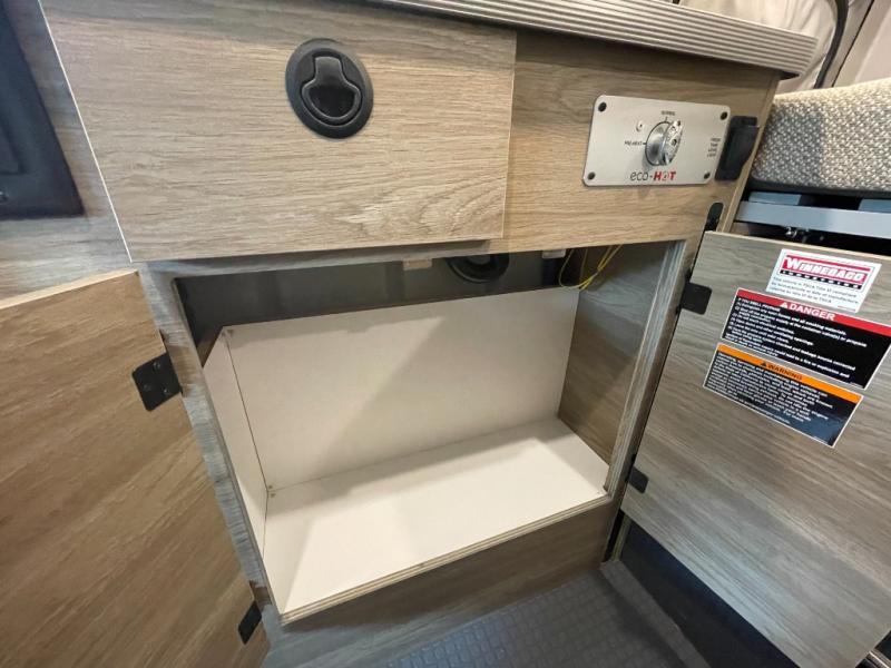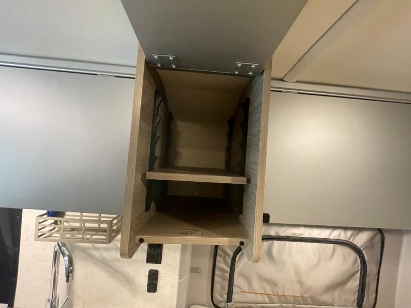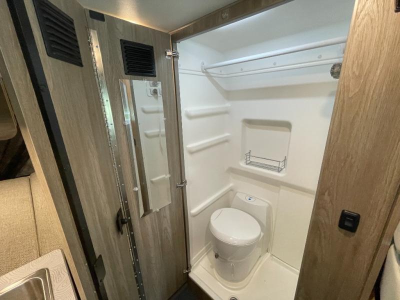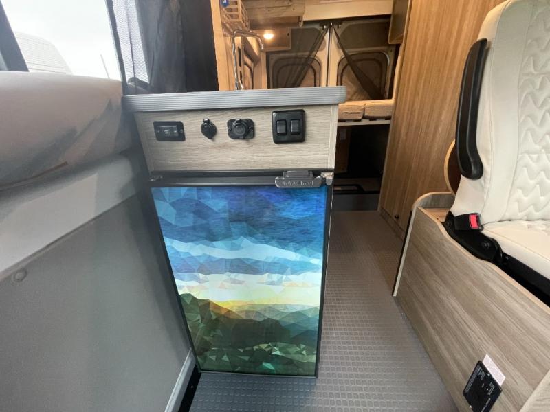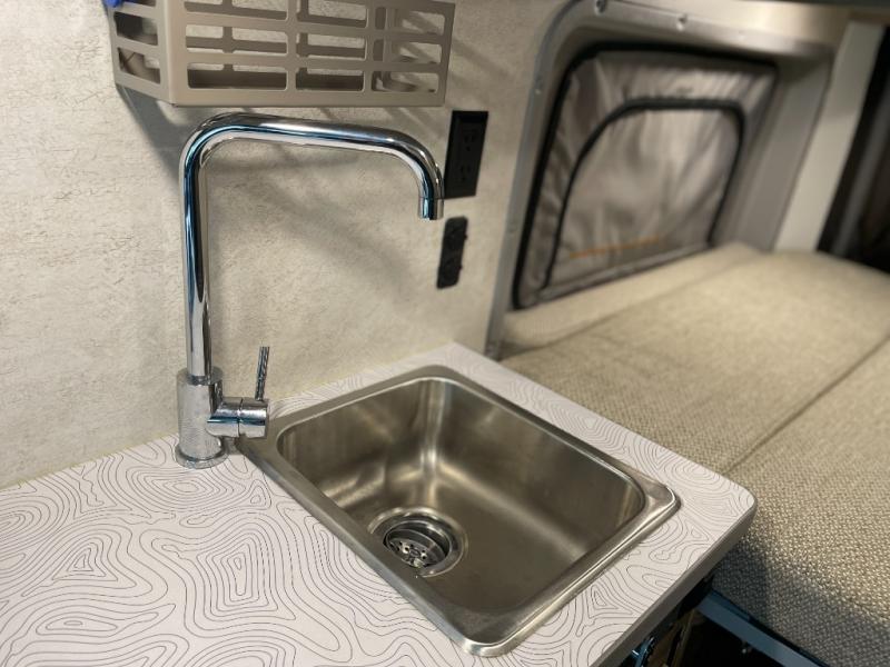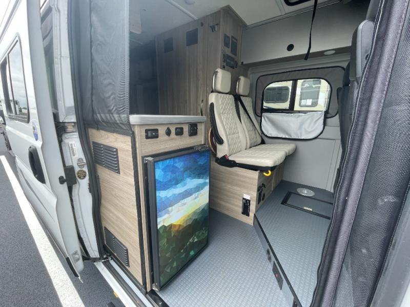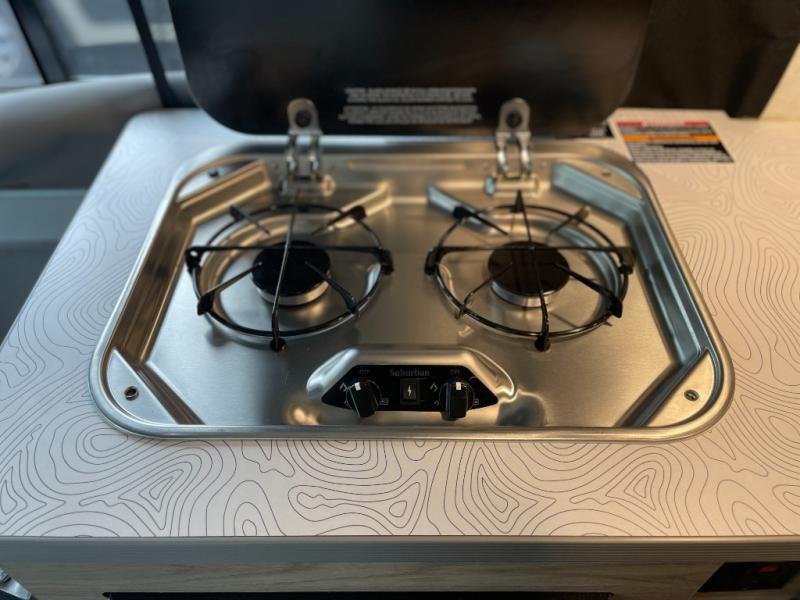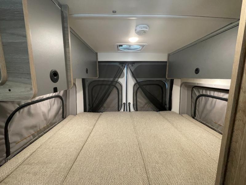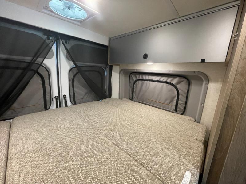 Enjoy a weekend ride in the mountains or make it an overnight stay with versatile sleeping options in this camper van. You'll find the Murphy+ bed in the back will provide a great night's rest, or you can choose the optional sofa/bed with added belted seating if you have more tag-alongs. And of course the little ones will love the pop-top sleeping area to climb into each night. After you've freshened up in the convenient wet bath, prepare breakfast on the two burner range, and the milk and eggs can go back in the 3.0 cu. ft. single door refrigerator/freezer. This model also includes rear double doors with screens to let the breeze in and keep bugs out!