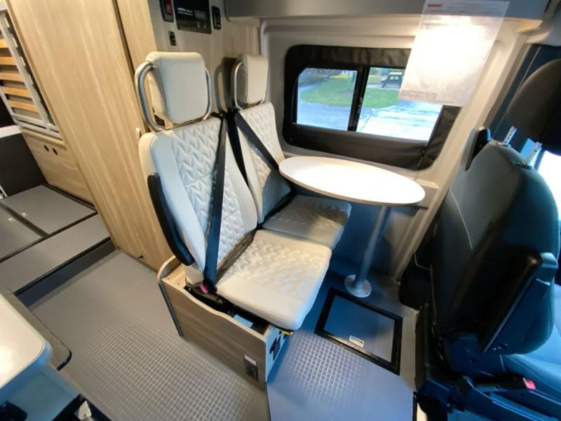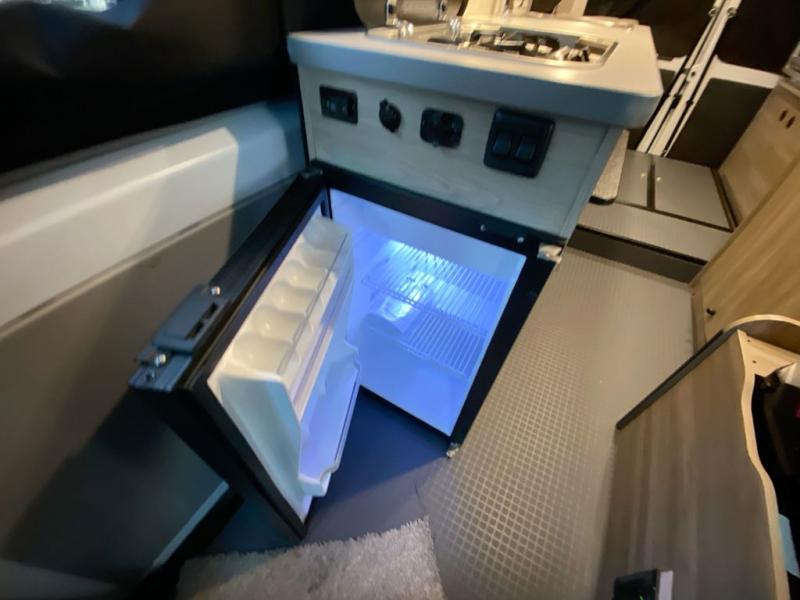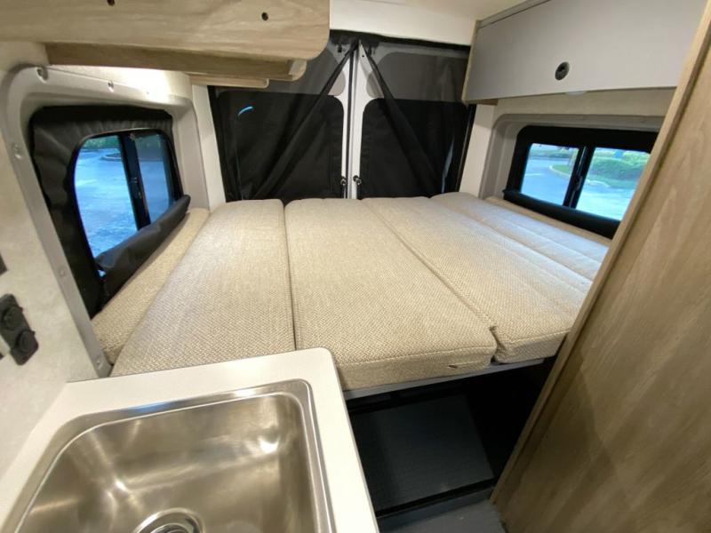 Enjoy a weekend ride in the mountains or make it an overnight stay with versatile sleeping options in this camper van. You'll find the Murphy+ bed in the back will provide a great night's rest, or you can choose the optional sofa/bed with added belted seating if you have more tag-alongs. And of course the little ones will love the pop-top sleeping area to climb into each night. After you've freshened up in the convenient wet bath, prepare breakfast on the two burner range, and the milk and eggs can go back in the 3.0 cu. ft. single door refrigerator/freezer. This model also includes rear double doors with screens to let the breeze in and keep bugs out!