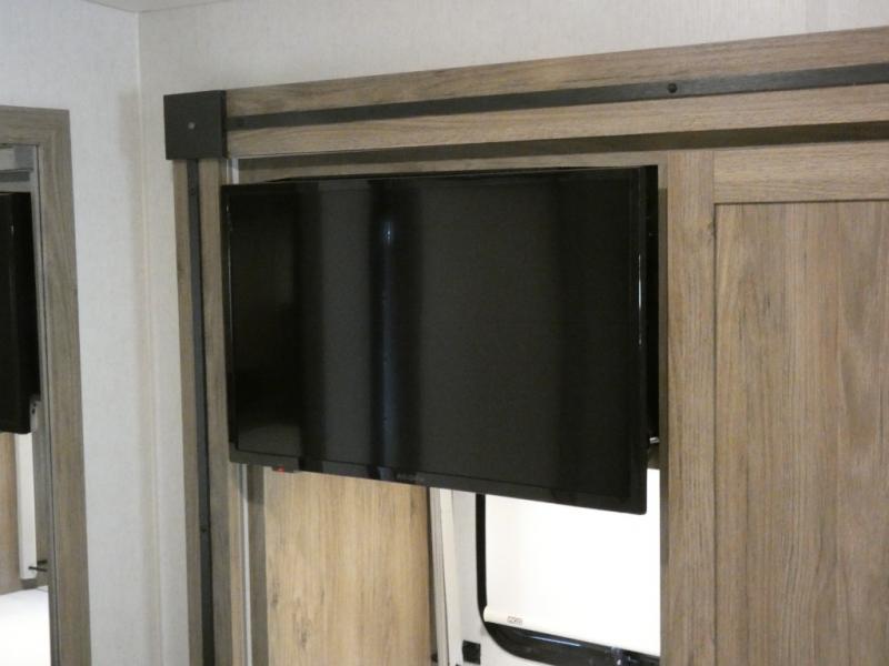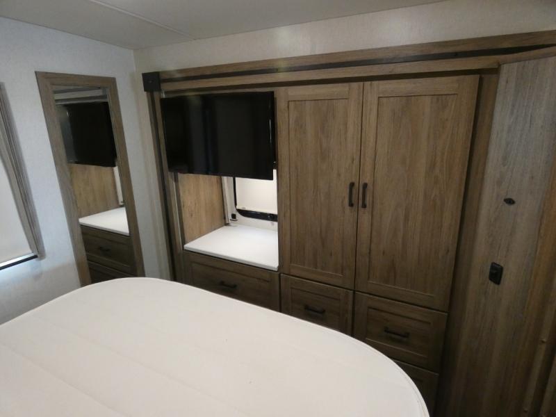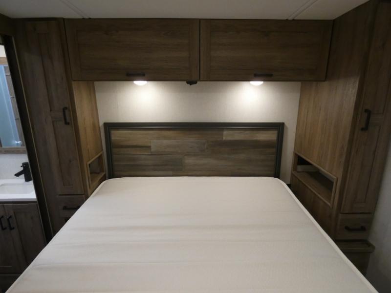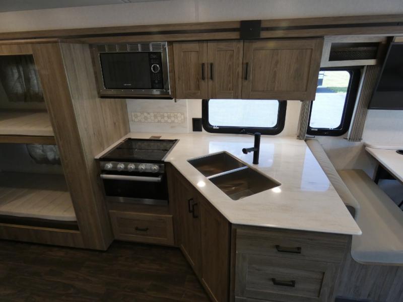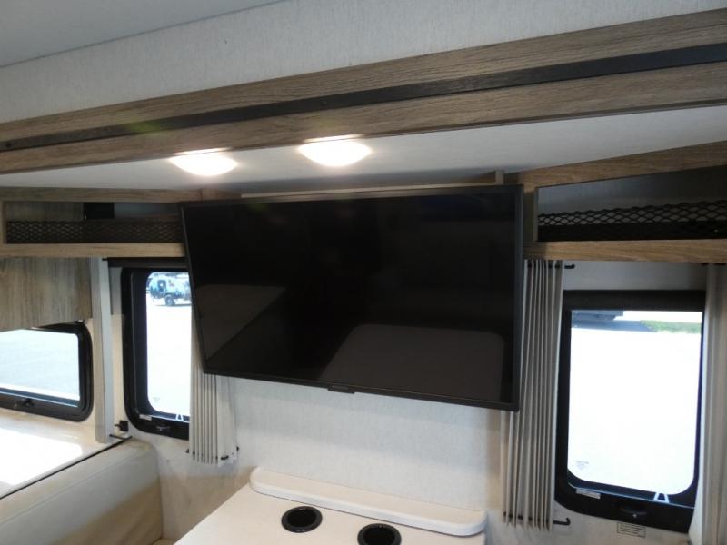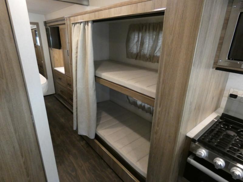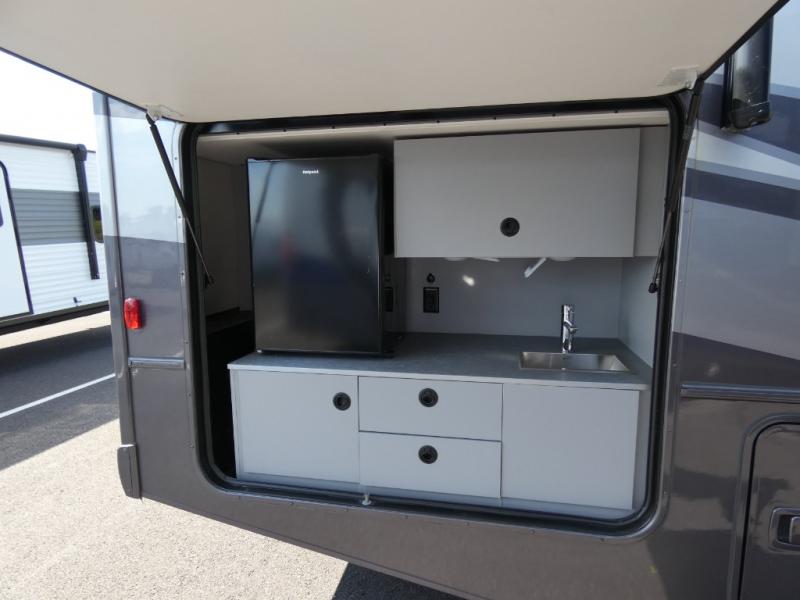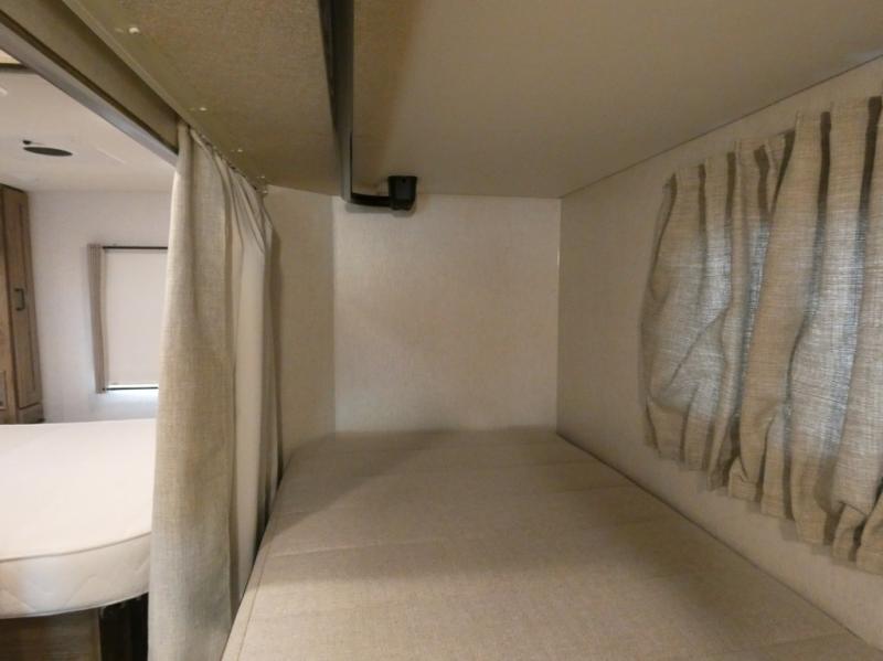 You will feel right at home in this motorhome! The rear private bedroom has a 60" x 75" queen bed with nightstands on either side, a wardrobe for your clothes, and an entrance into the dual entry bathroom. Across from the bathroom is a set of 30" x 73" bunk beds for the kids. The chef will have an easy time preparing delicious meals in the fully equipped kitchen, and they can be enjoyed at the 42" x 73" dinette with Hi-Lo table. The 40" x 66" sofa bed is not only great for relaxing while watching a movie on the 39" LCD HDTV, but also for transforming into an extra sleeping space. This model also includes the Tailgate Package with LP quick-connect, a stainless steel sink, a paper towel holder, a refrigerator, plus more!
