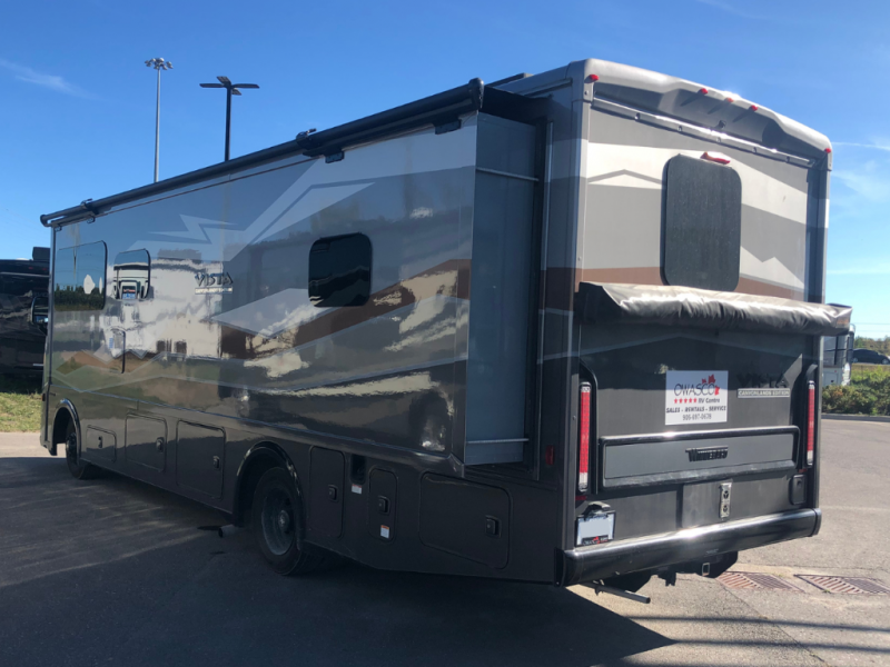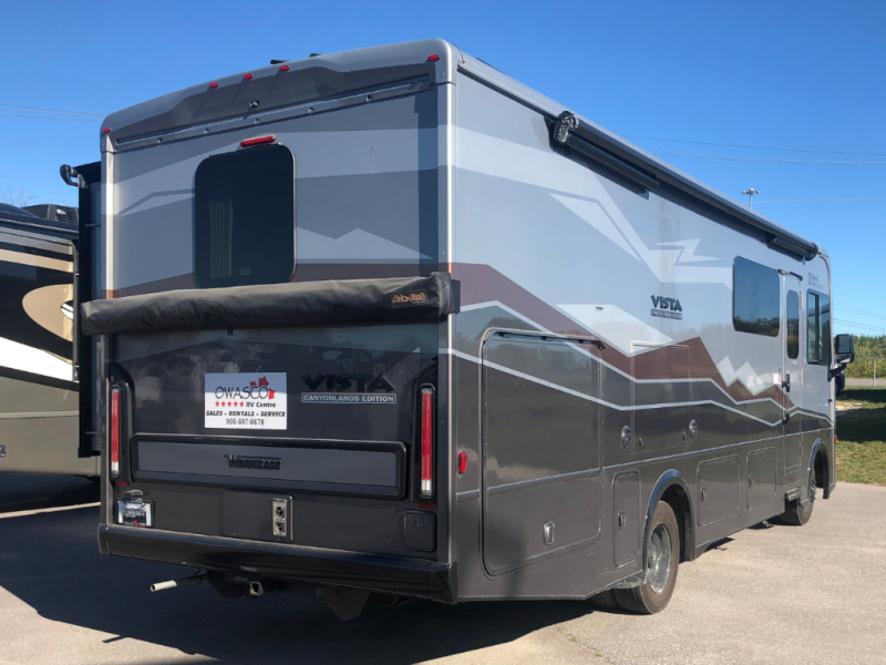 The Winnebago Vista National Park Foundation Limited Edition Class A gas motorhome is designed to fit almost any campsite! You can go off the grid with the upgraded solar energy system which has a standard 320 amp hour lithium-ion battery, a charge controller, and three solar panels for three times the unplugged power. The Batwing awning overlaps the standard armless patio awning for two sides of seamless wraparound protection to enhance your outdoor living. Speaking of enhanced outdoor living, the exterior kitchen included in the Tailgate package comes with a refrigerator, a sink, and a quick connect LP hose for a portable stove or grill, plus more convenient accessories. The outdoors are brought inside through the frameless tinted windows and the beautiful Salinas oak cabinets. Come check it out today!