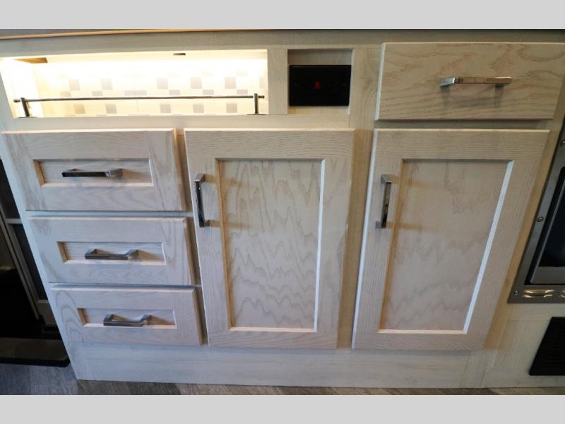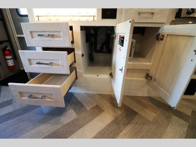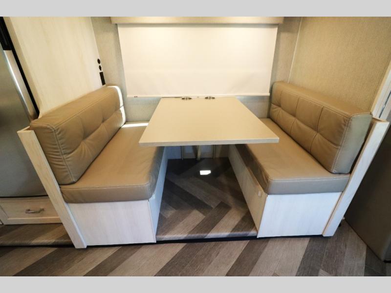 Spacious full-wall slideout, Dream Dinette (40×70), optional theater seating with pedestal table, and large galley windows enhance livability.
