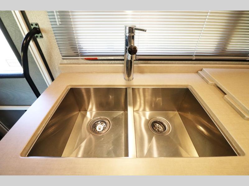 Exterior perks: full-body premium Sandstone paint or Tungsten silver; fiberglass roof; LED-lit 15' powered awning; ladder; mud flaps; plenty of basement storage (42–45 cu ft).