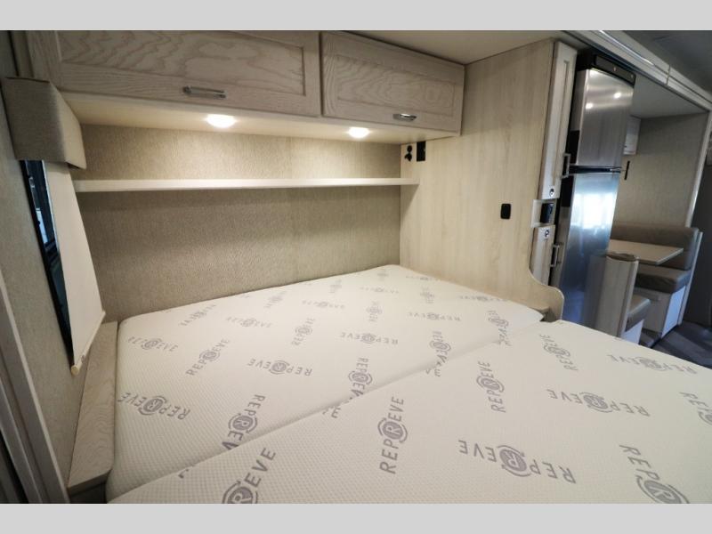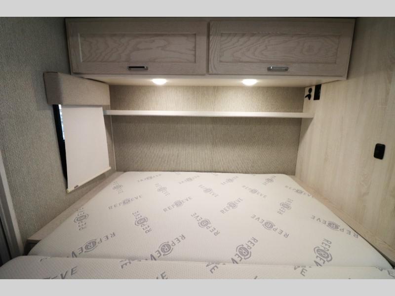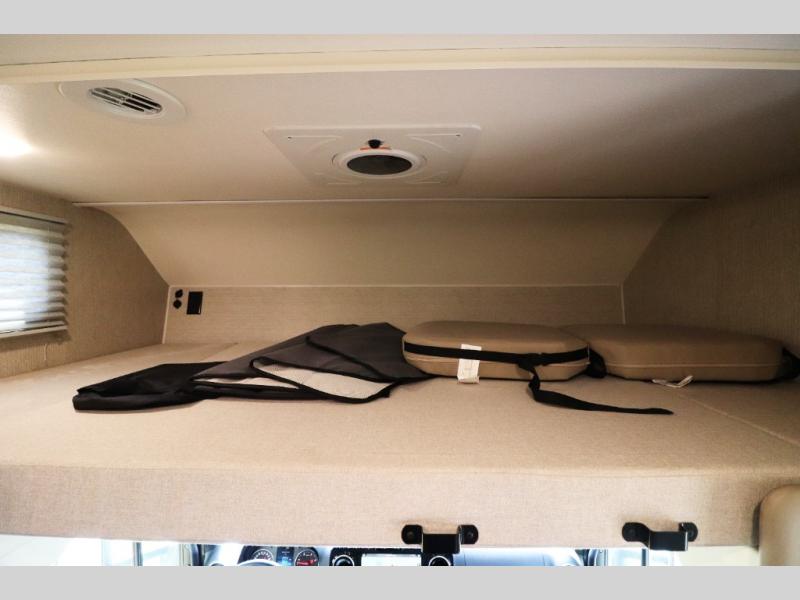 Queen walkaround bed with winnebago WinnSleep foam, plus a 49×87 over-cab bunk to sleep up to 6.