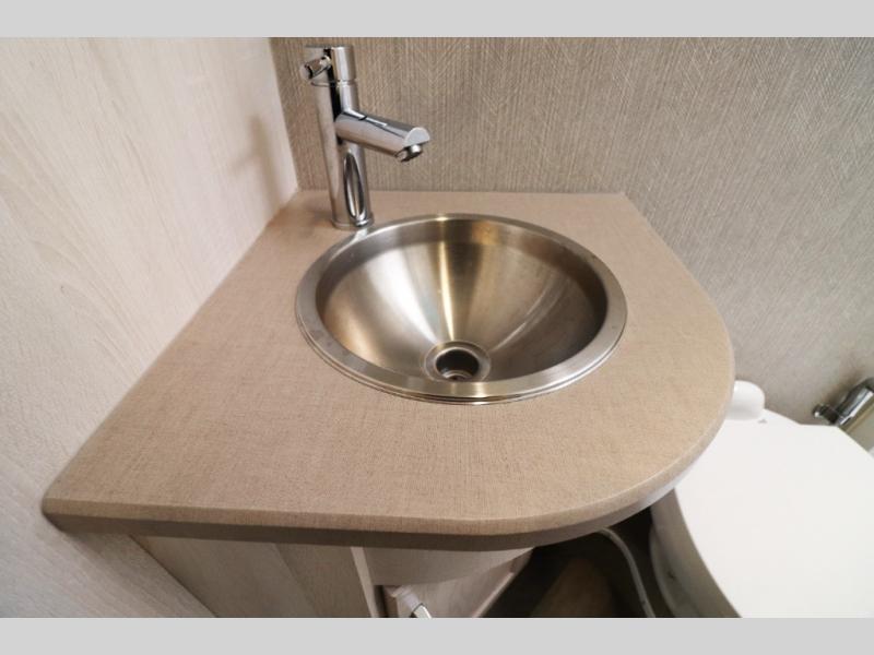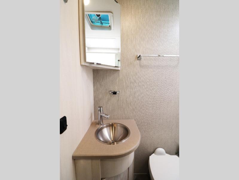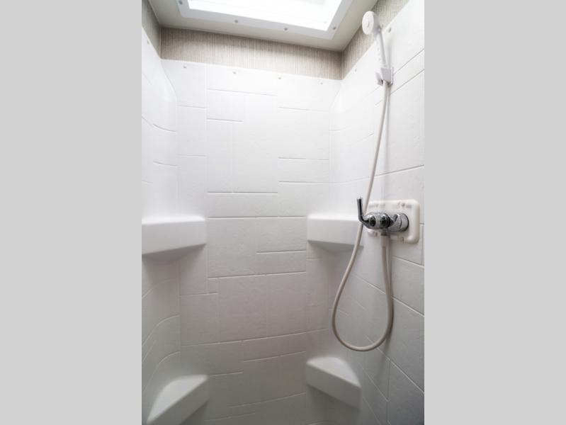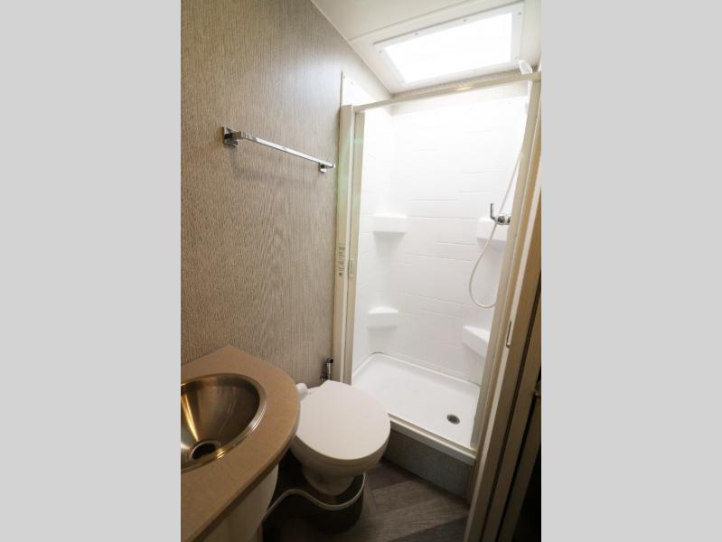 Well-appointed bath: 24×32 shower with skylight, self-cleaning bi-fold door, stainless sink, porcelain toilet, medicine cabinet.