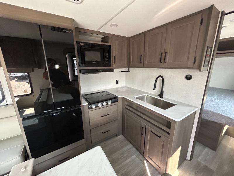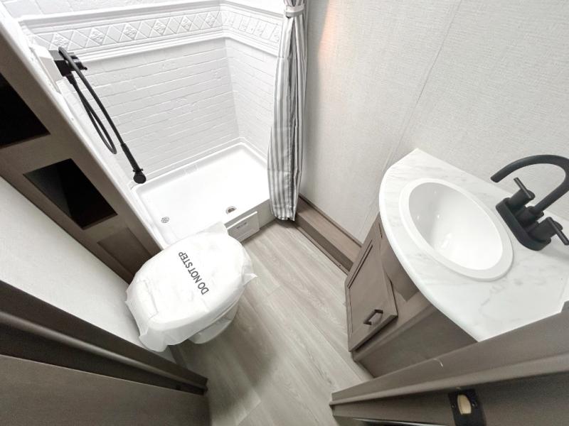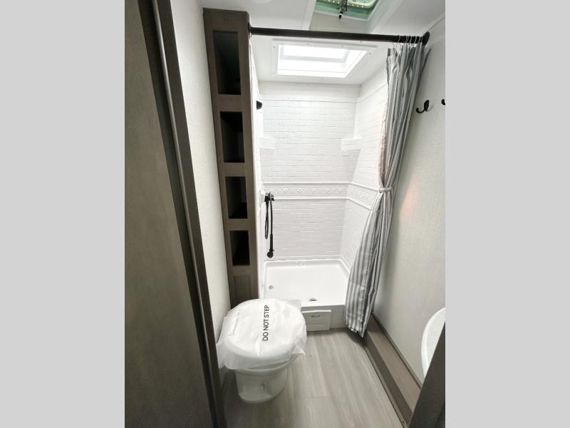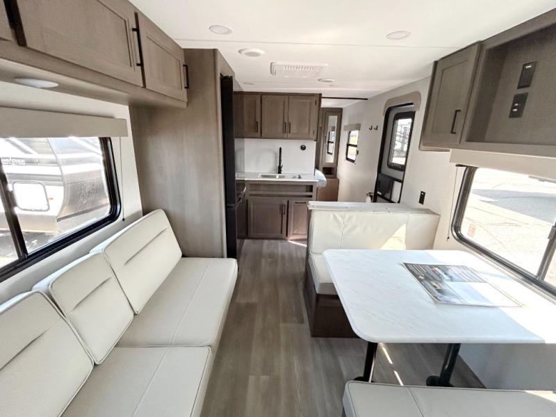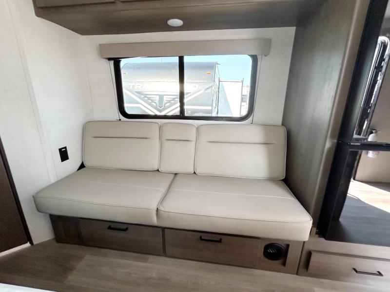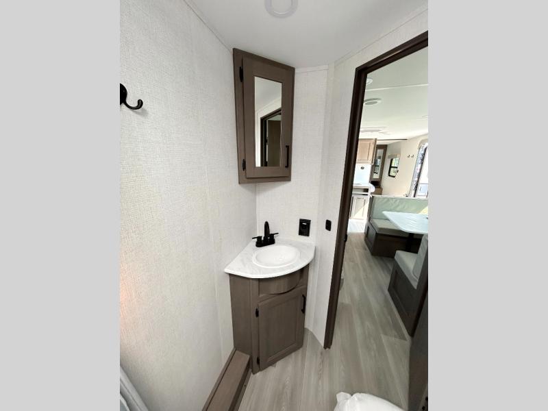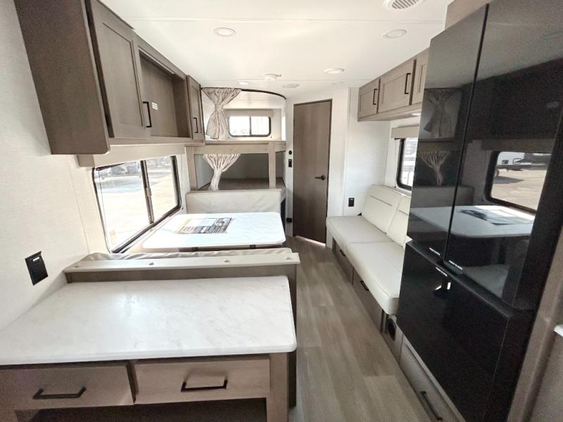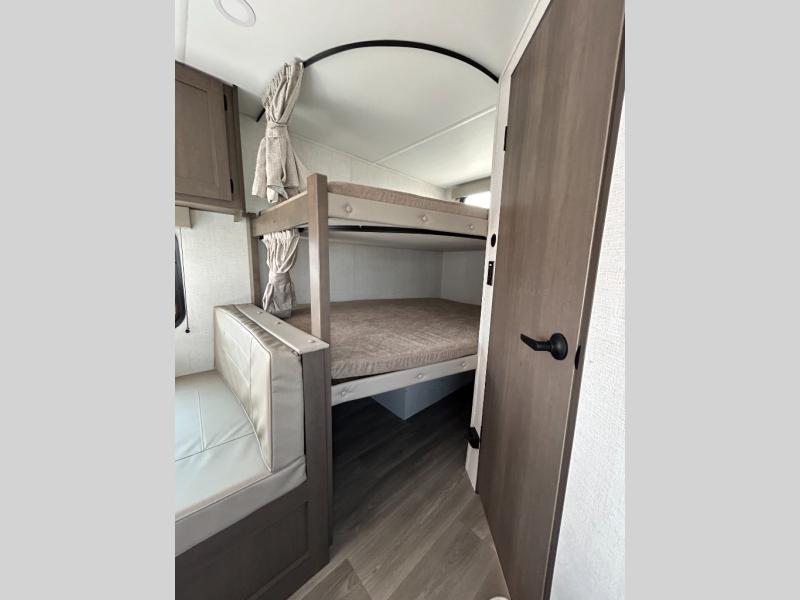 This is the perfect travel trailer if you like to camp with friends and family. Since there are double-size bunks, a queen bed in the front bedroom, plus a booth dinette and sofa, you can sleep eight campers each night! The three burner range and microwave in the kitchen will let you cook meals each day, and the 12V refrigerator will keep your cold items fresh. This model also includes a counter with extra storage underneath, a pull-out trash can storage for convenience, and a full bath to freshen up in each day. And you'll love having your own space in the front bedroom with a privacy curtain, dual wardrobes, and TV prep if you want to add a television!