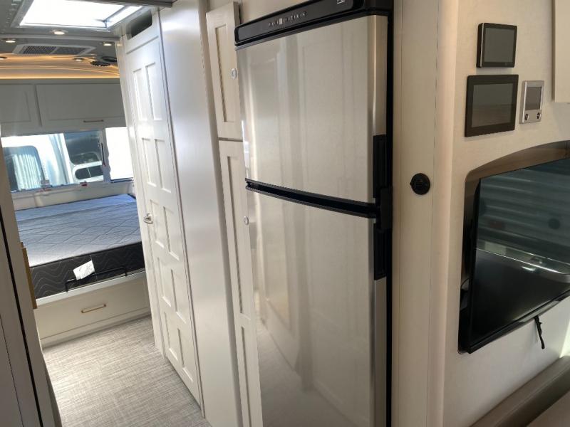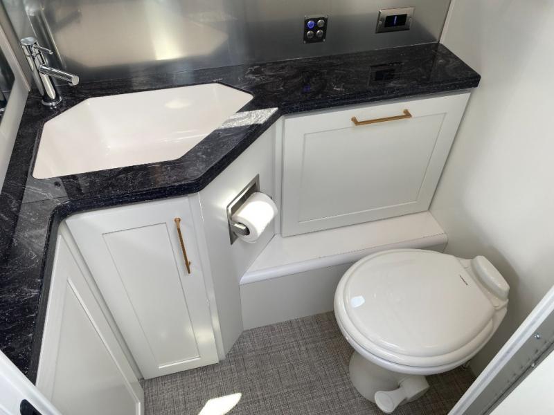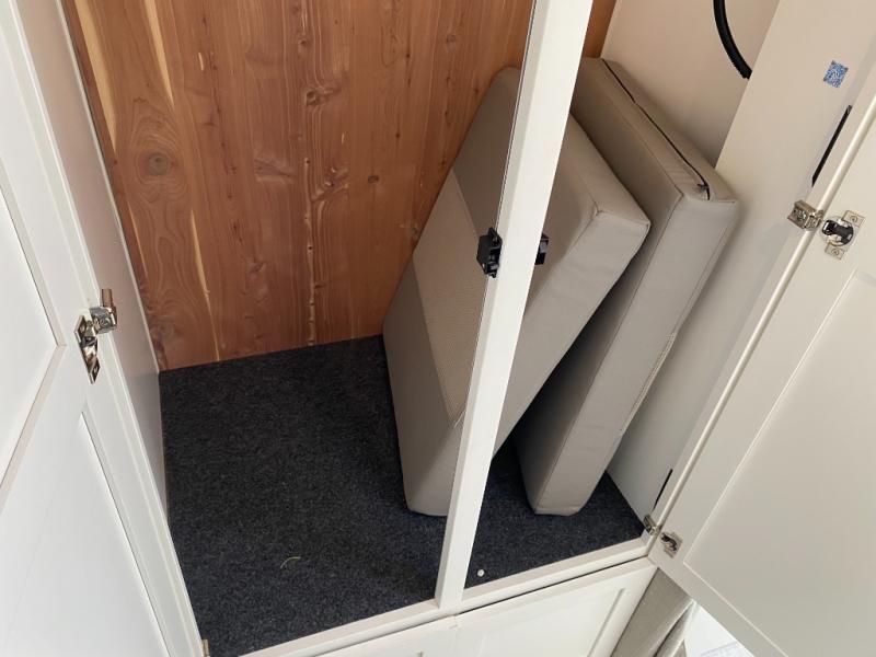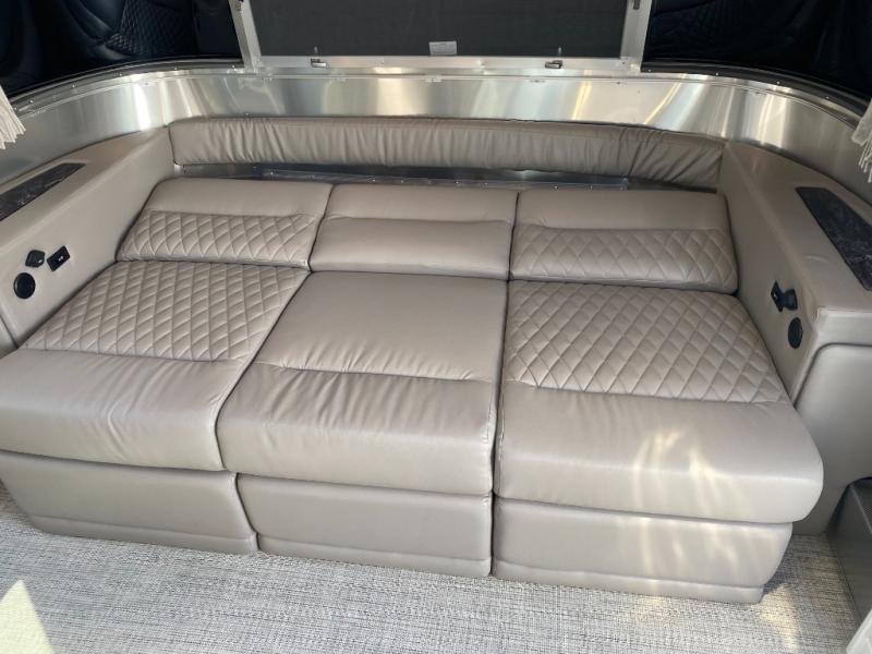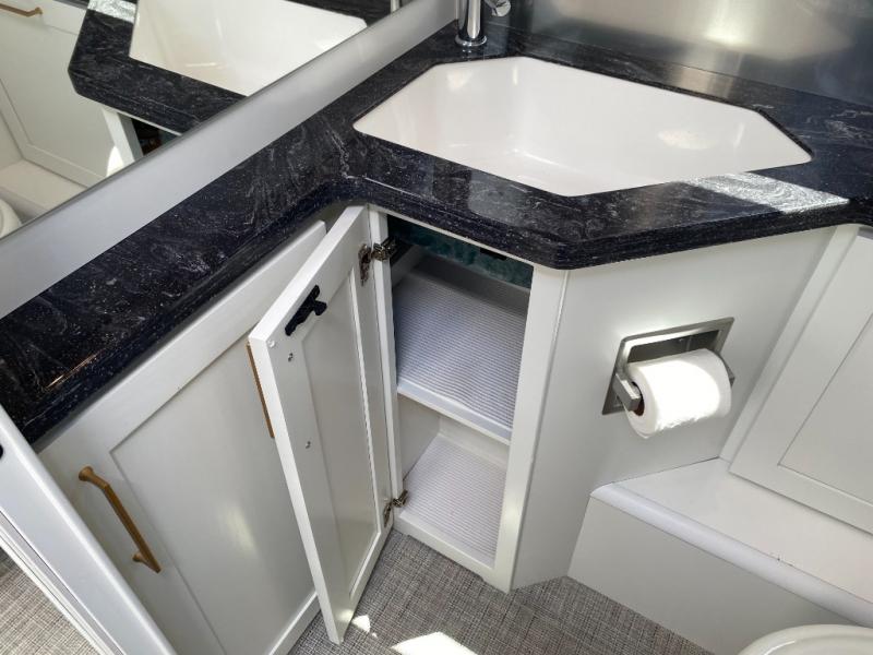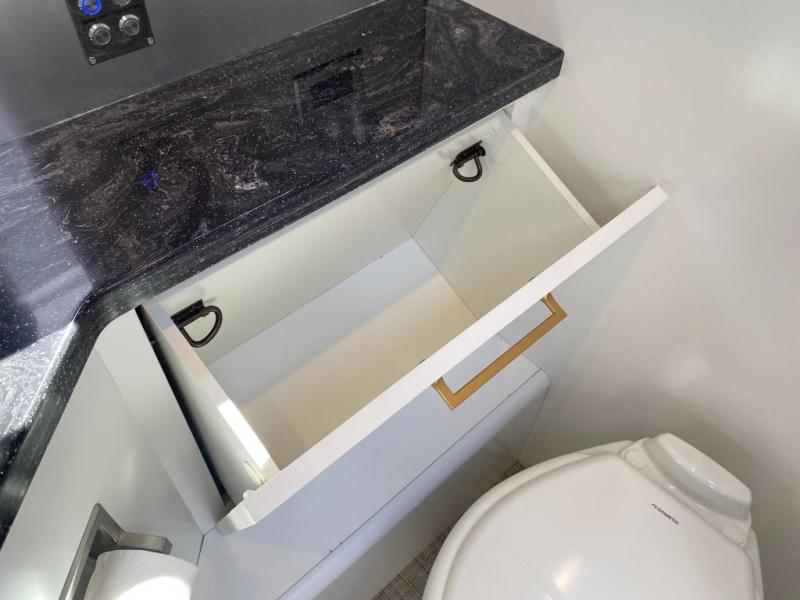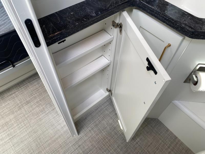 You'll have everything you need for a luxurious stay in this cozy travel trailer. The rear bedroom includes a power queen bed so you can adjust the head if you like to read at night, plus there are nightstands on either side of the bed for your phone, glasses, and a cup of water. You might also like to choose the optional twin beds in place of the queen bed, depending on your needs. The private toilet and vanity features plenty of counter space for your necessities, and the independent shower is just across the hall with its own door for privacy. Your crew will love to relax on the front powered lounge that has a perfect view of the 32" Smart TV with Bluetooth and this space can be converted to sleeping space for your guests, along with the powered dinette.