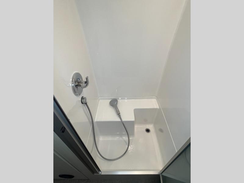 When you enjoy the finer things when traveling, this trailer will provide that for you plus lots of natural lighting and plenty of conveniences. The convertible rear dinette offers a place to dine and socialize for four, and there is a lounging area along the side with a TV on the wall. The table acts as a sturdy base below the cushions when you need some sleeping space. The front bedroom offers more panoramic windows and comfortable twin beds with a view each morning and night. There is floor space in the center and a nightstand for extra storage and charging space. You will find storage for your clothing, and a split bathroom with a half bath on one side and a shower that stands independently across the hall. And the kitchen offers everything you need to make meals including extra counter space and a refrigerator for leftovers. And there is a rear hatch option for this trailer. The Midnight Flamingo optional upgrade is also available on this model for even more striking style and functional upgrades!