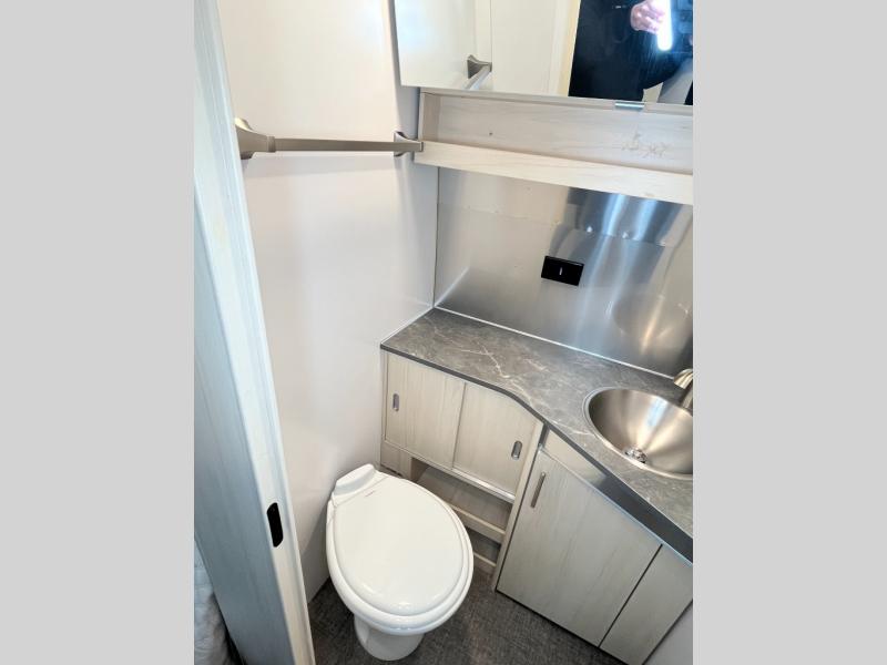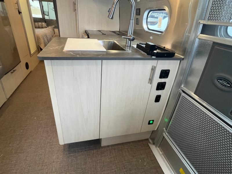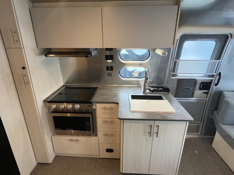 With each Flying Cloud travel trailer by Airstream, there are two axles, and each is built for ease of towing, plus there is a rear-view camera to make reversing and parking easier, and stainless steel front stone guards to protect the lower segments from road debris. The iconic Airstream design is created outside and inside by the semi-monocoque aluminum superstructure, the temperature reducing one-piece white aluminum roof, the panoramic front windows, and the stylish aluminum wheels. The interior will have you feeling right at home with handcrafted cabinetry, plenty of storage and counter space, sleek roller blinds and blackout curtains, plus residential style faucets!