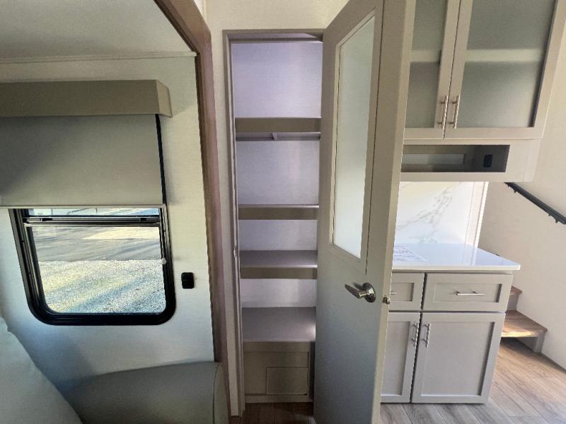 This fifth wheel is ready for adventure when you are! Once you arrive at the campground, you can put out the 16' awning, then start lunch on the exterior griddle. A booth dinette and theater sofa provide seating space inside, and there is a 50" Class HDTV to enjoy movies. The chef will also love the interior kitchen with its ample counter space, and there is plenty of storage with a hutch/pantry, second pantry, and 10 cu. ft. 12V refrigerator. Freshen up in the full bath before heading off to bed in the front private bedroom. Here, you'll find a queen bed, dual nightstands and overhead storage, plus a wardrobe with washer and dryer prep if you choose to add those appliances!