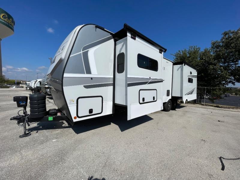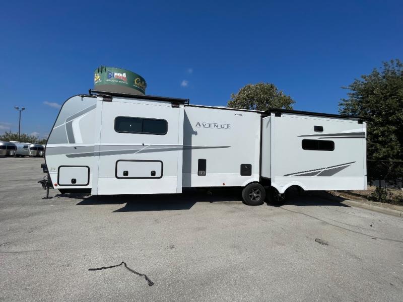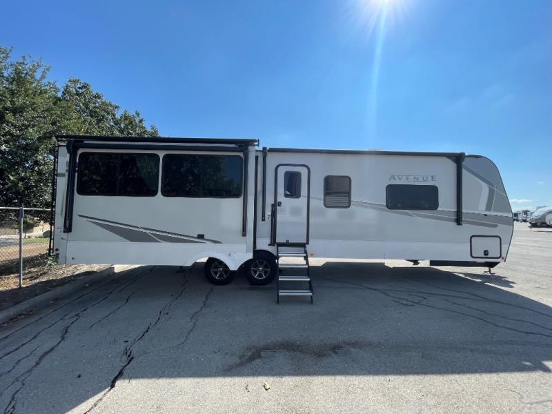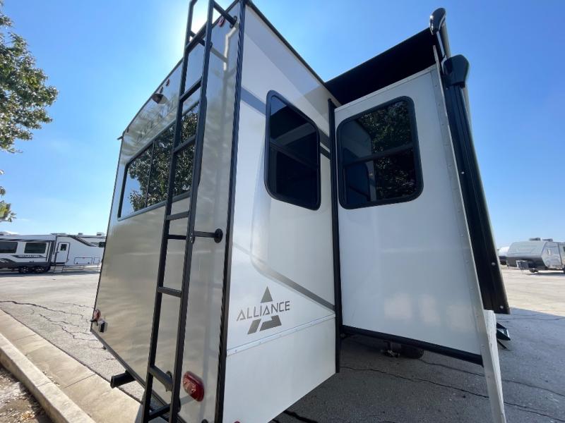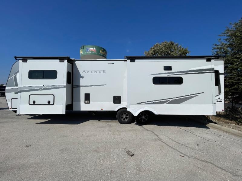 With any Avenue fifth wheel or travel trailer by Alliance RV, you will enjoy more interior space provided by the 8' 5" wide-body construction, and a long list of luxury features. Each is built with Azdel composite sidewalls both inside and out, along with a PVC roof for added strength. There are innovative storage solutions that include hidden storage behind the TV, within end tables and ottomans, and more. Since these units feature no carpet throughout, cleaning will be easier than ever, and there are flush floor slides throughout for seamless living spaces. The Avenue also comes with the OTG Solar Package with a 400 watt solar panel, inverter prep, multiple outlets, and more to keep you charged up!