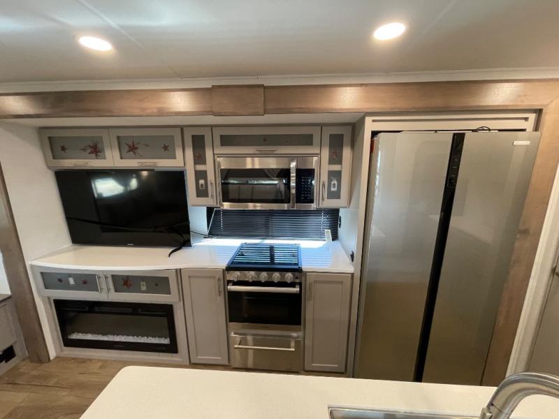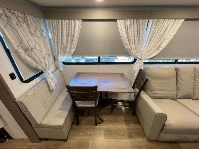 A kitchen island with countertop space makes it easy to prepare meals in this travel trailer! The floating dinette table has two chairs on one side and a movable ottoman with flip up storage on the other side to keep your games or extra table cloths in. You can store your dishes and snacks inside the hutch/pantry or in the second pantry. The front private bedroom has a queen bed slide but can be switched out for the optional king bed if you like. There is also a dresser and large wardrobe with shelving plus washer and dryer prep if you choose to add those appliances. The rear living area features a dual recliner theater seat across from an entertainment center with a 50" class HDTV with hidden storage behind it, and is also on a swing mount for all to see even at the rear sleeper sofa!