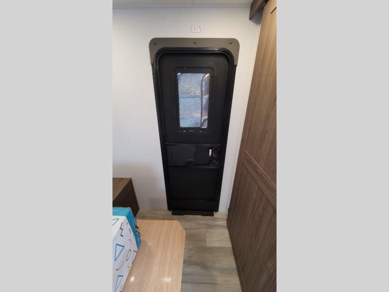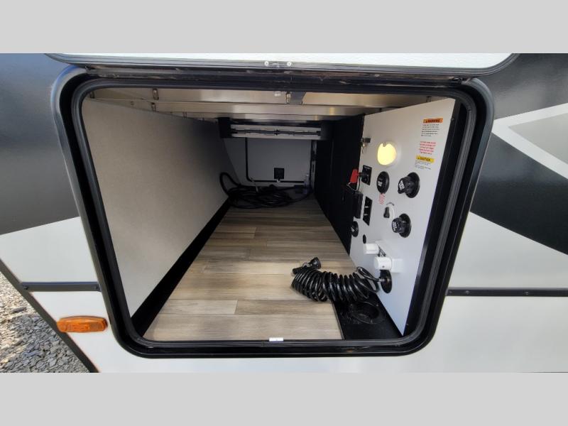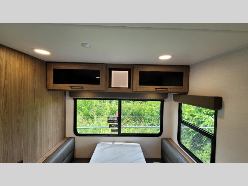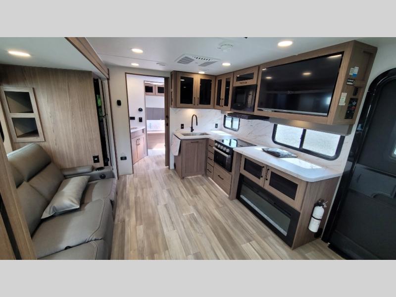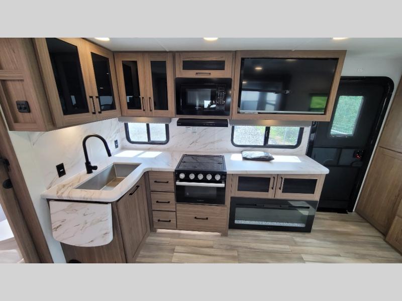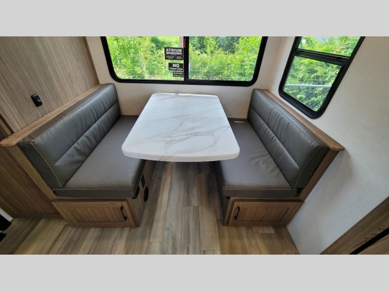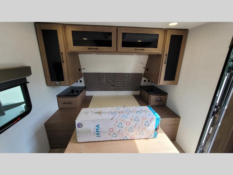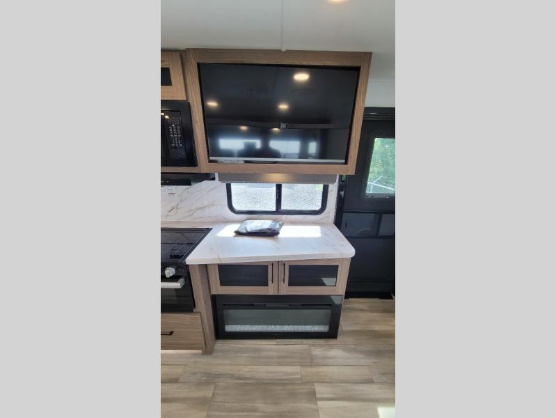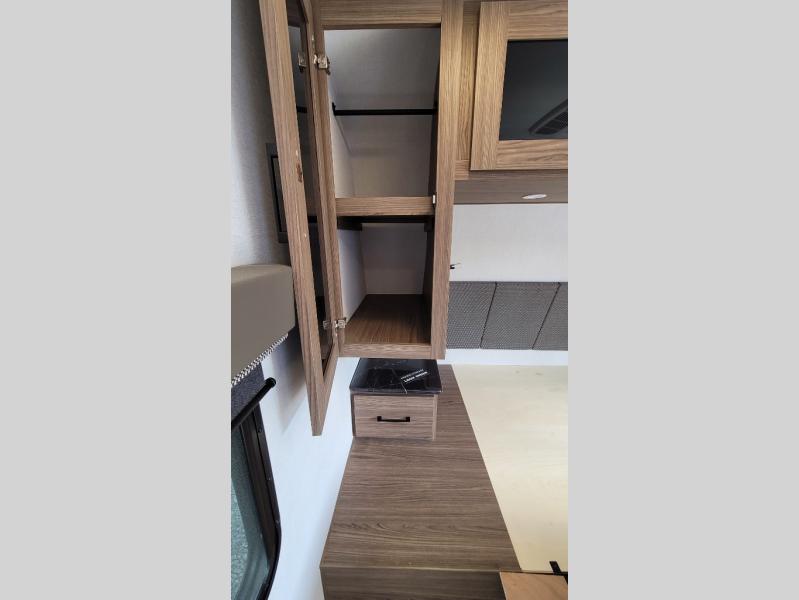 Grab your hiking boots and your sense of adventure for fun camping trips in this single slide out travel trailer. The rear booth dinette includes overhead storage for your things and the sofa slide out is in great view of the 40" HDTV. There is also a fireplace here that will make your space feel more like home plus more storage space, including an entryway pantry and storage above the 10 cu. ft. 12V refrigerator. A walk-through bath will take you to the front master bedroom with a queen bed, wardrobe nightstands, plus its own exterior entry door!