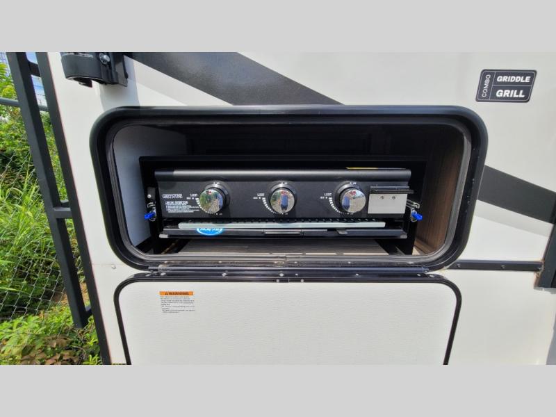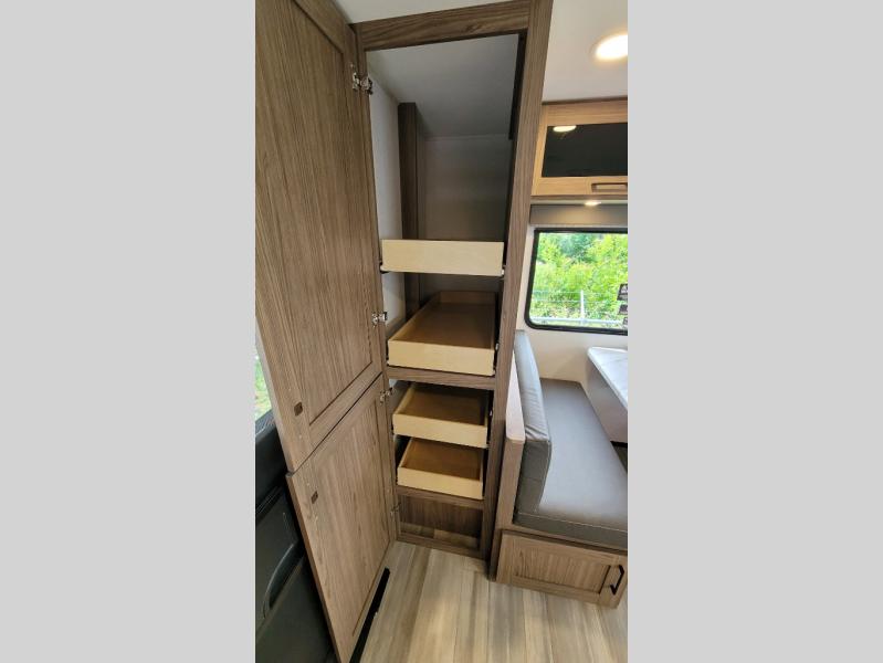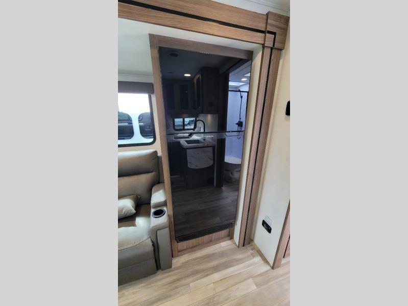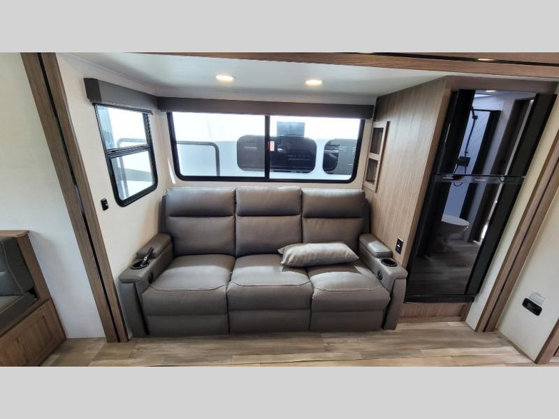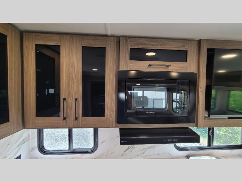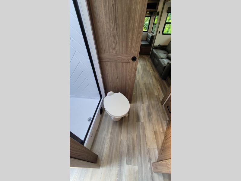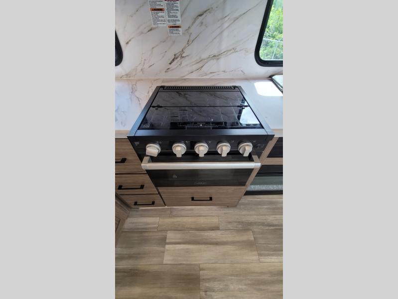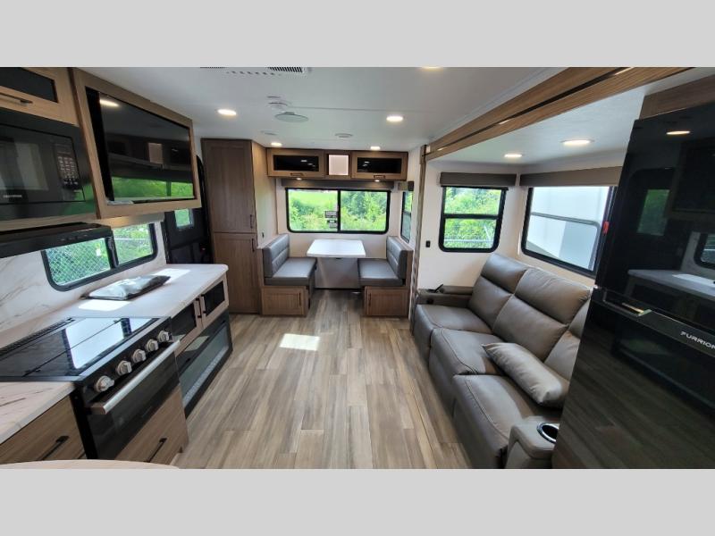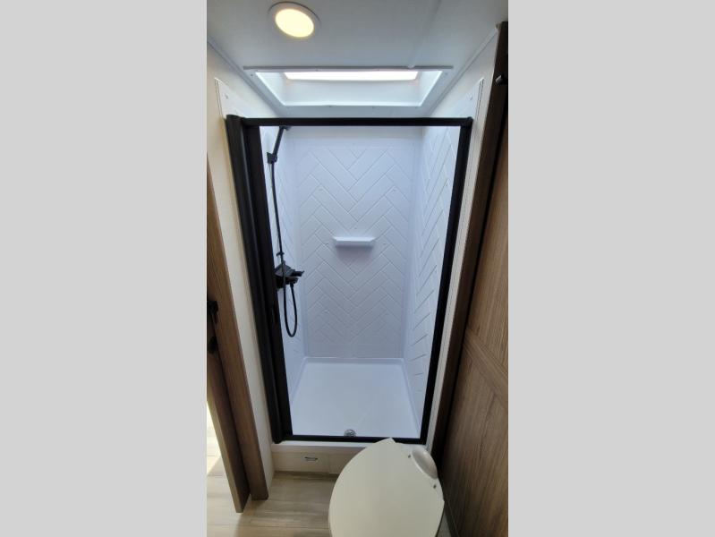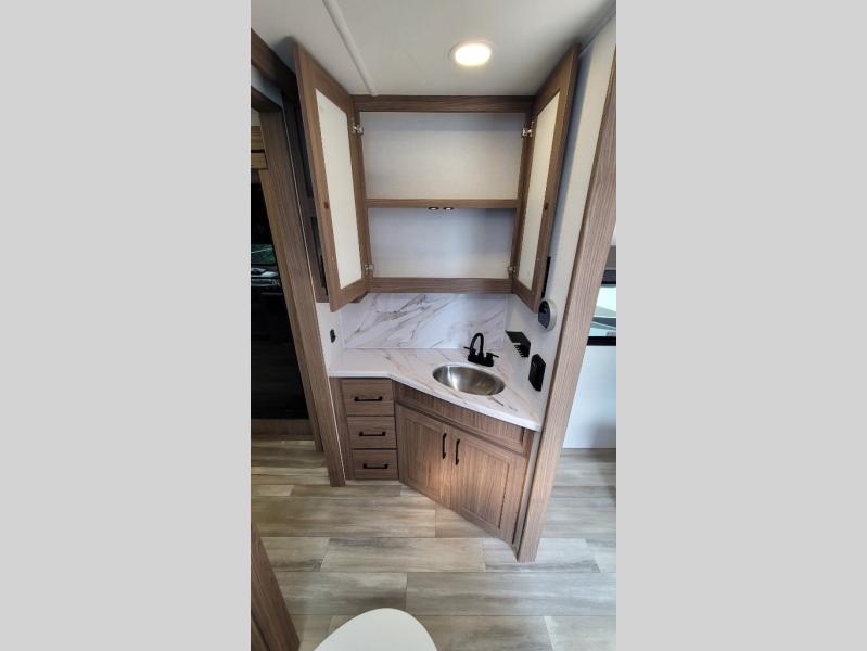 Grab your hiking boots and your sense of adventure for fun camping trips in this single slide out travel trailer. The rear booth dinette includes overhead storage for your things and the sofa slide out is in great view of the 40" HDTV. There is also a fireplace here that will make your space feel more like home plus more storage space, including an entryway pantry and storage above the 10 cu. ft. 12V refrigerator. A walk-through bath will take you to the front master bedroom with a queen bed, wardrobe nightstands, plus its own exterior entry door!