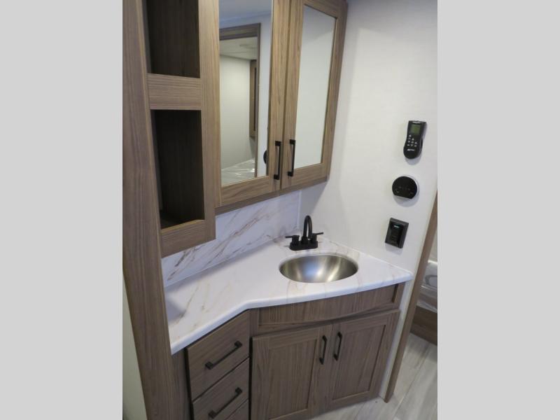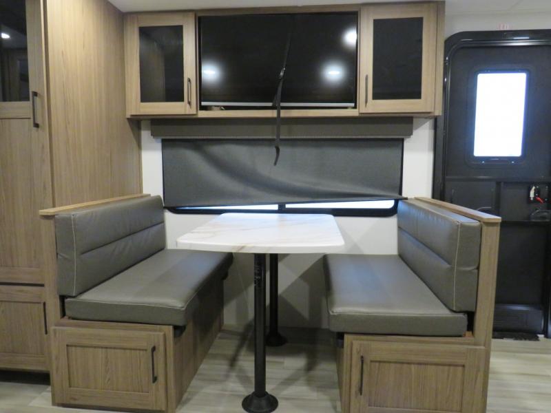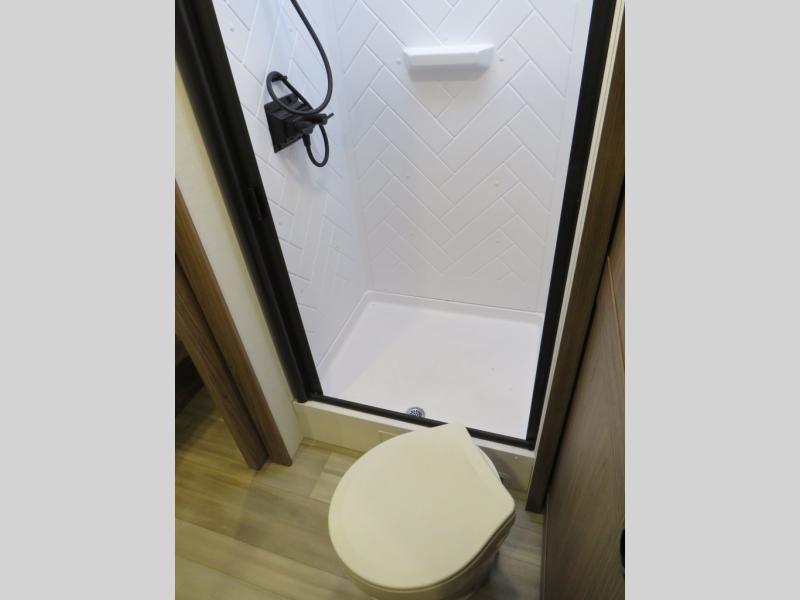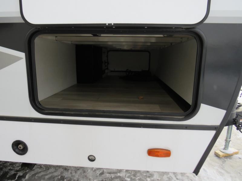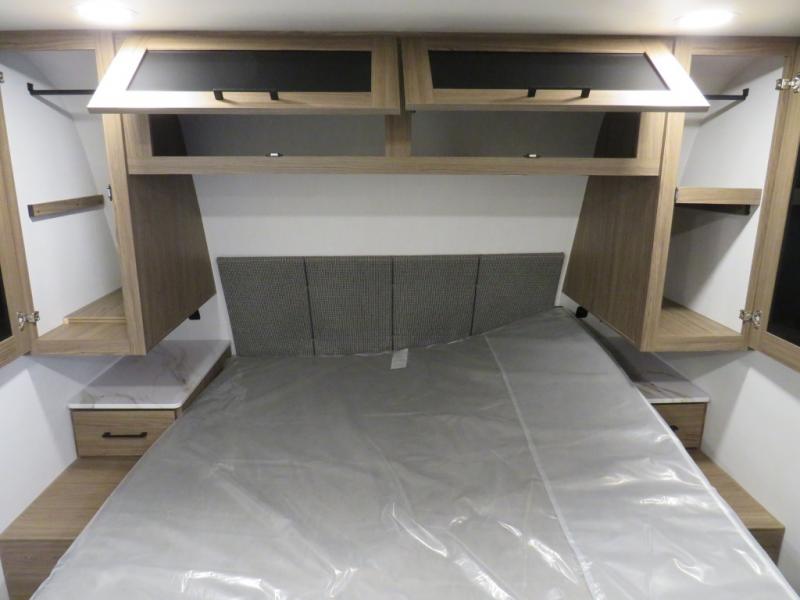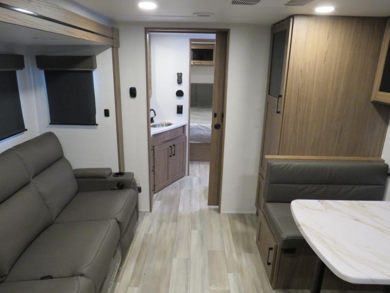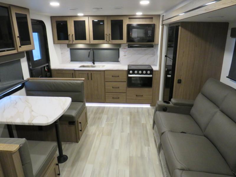 You'll love camping in this rear kitchen travel trailer with generous counter space and overhead storage for spices, dishes, and more. You can dine each day at the booth dinette or relax on the sofa slide out, which will provide more floor space. The spacious walk-thru bath includes a 30" x 36" shower, toilet, and vanity so you can clean up each day. Head to the front master bedroom where you can sleep soundly on the walk-around queen bed with dual nightstands and wardrobes. The second entry door is also found in this room so you can slip out for an early morning run!