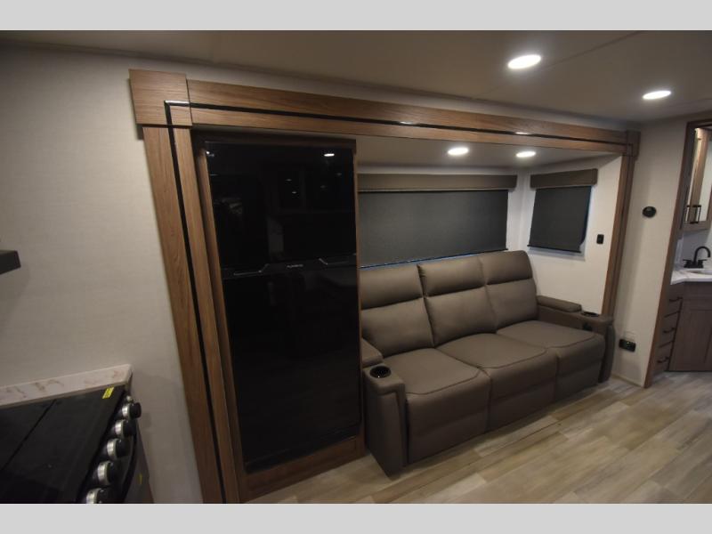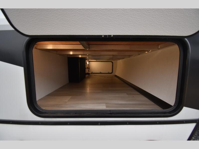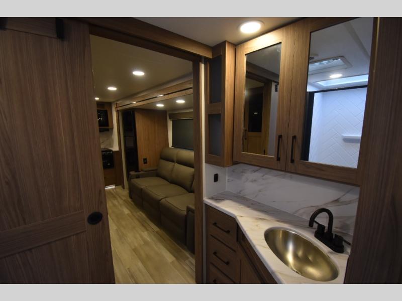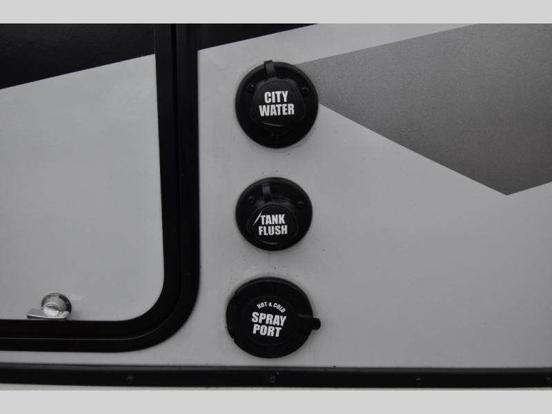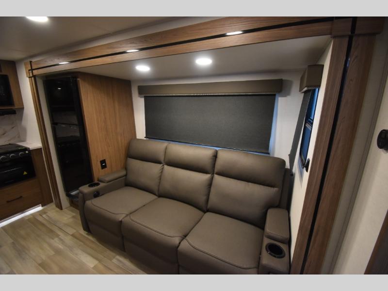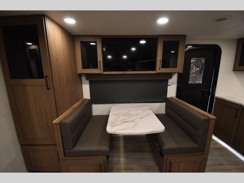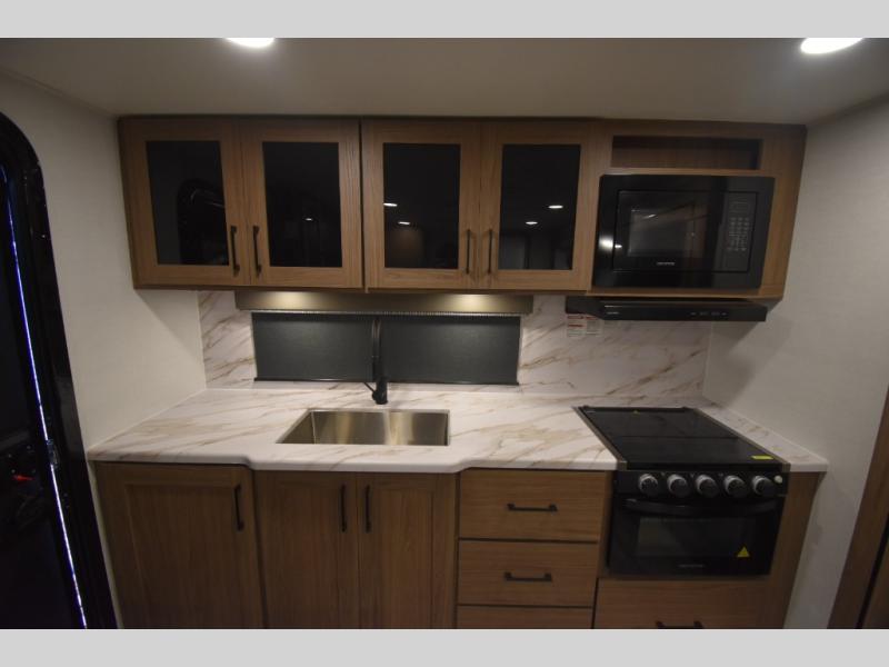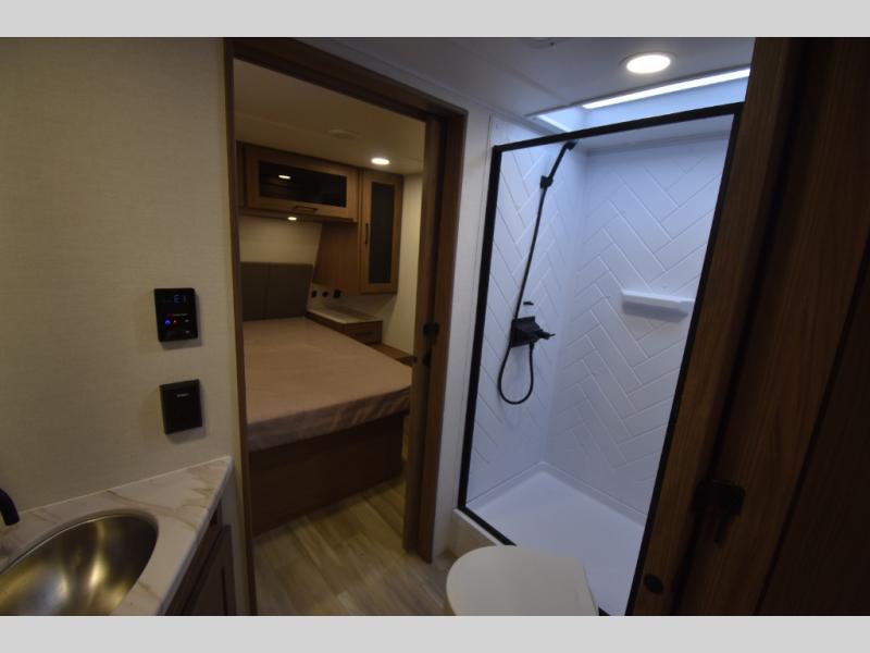 You'll love camping in this rear kitchen travel trailer with generous counter space and overhead storage for spices, dishes, and more. You can dine each day at the booth dinette or relax on the sofa slide out, which will provide more floor space. The spacious walk-thru bath includes a 30" x 36" shower, toilet, and vanity so you can clean up each day. Head to the front master bedroom where you can sleep soundly on the walk-around queen bed with dual nightstands and wardrobes. The second entry door is also found in this room so you can slip out for an early morning run!