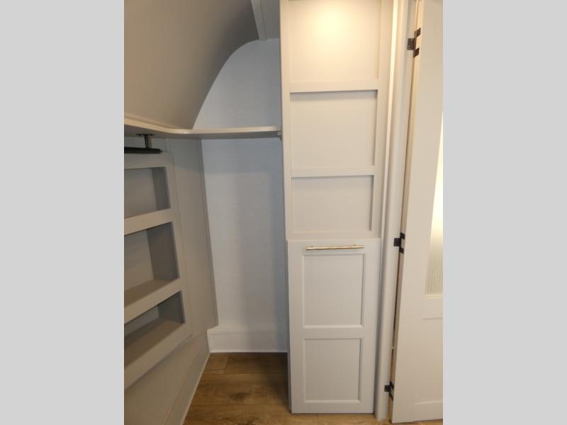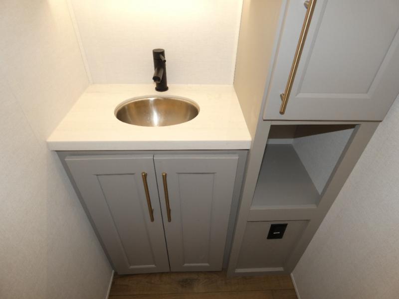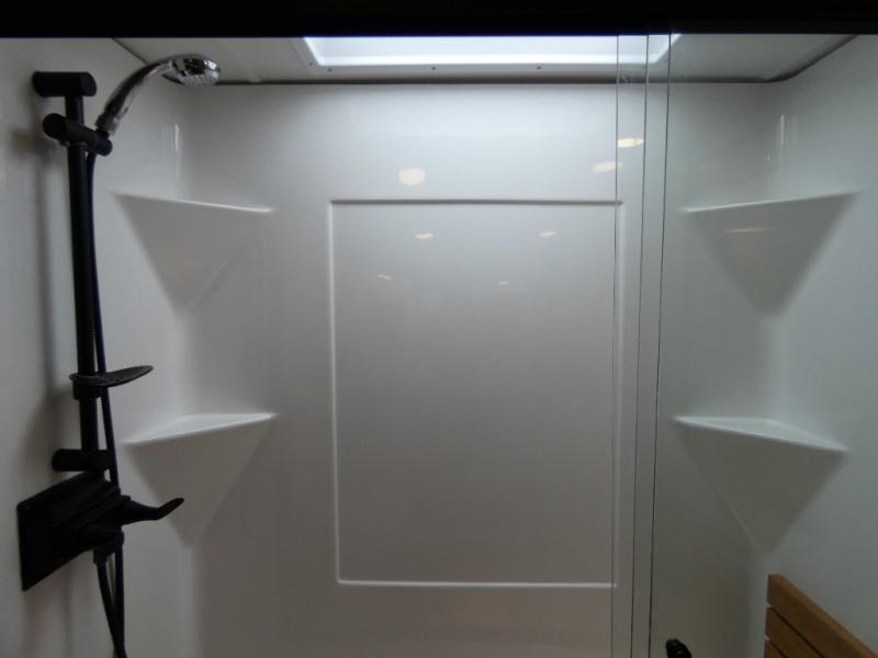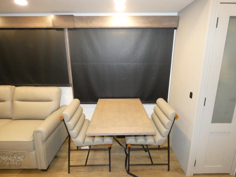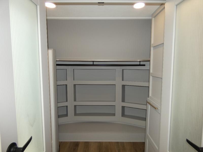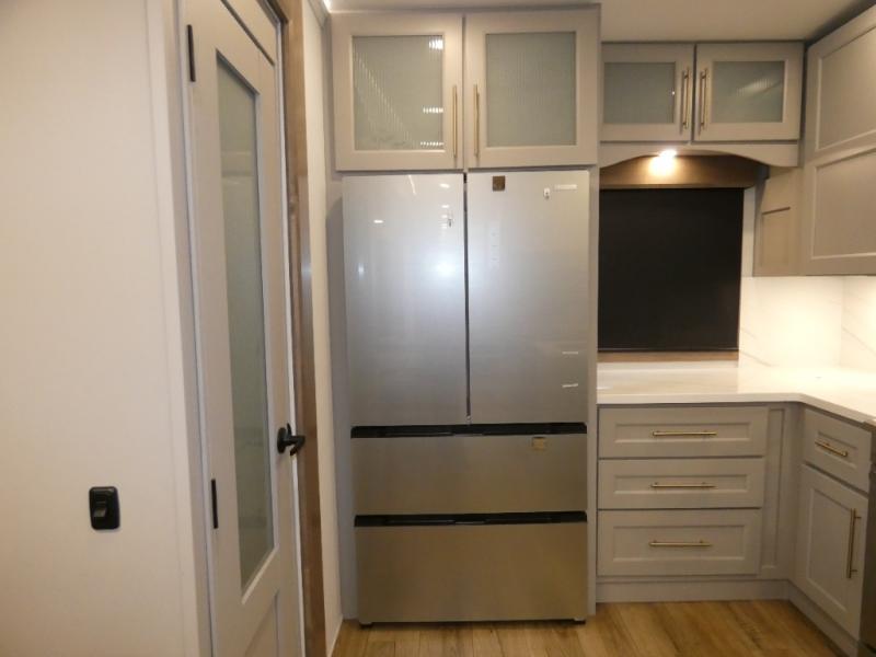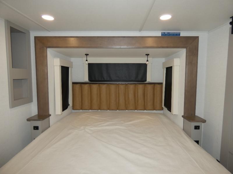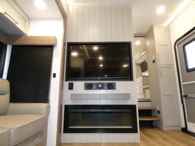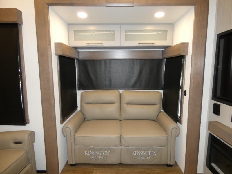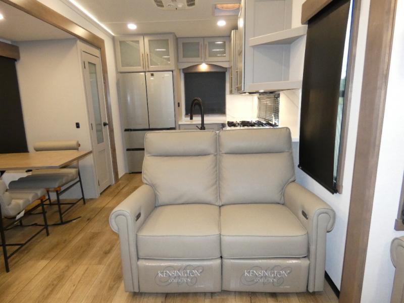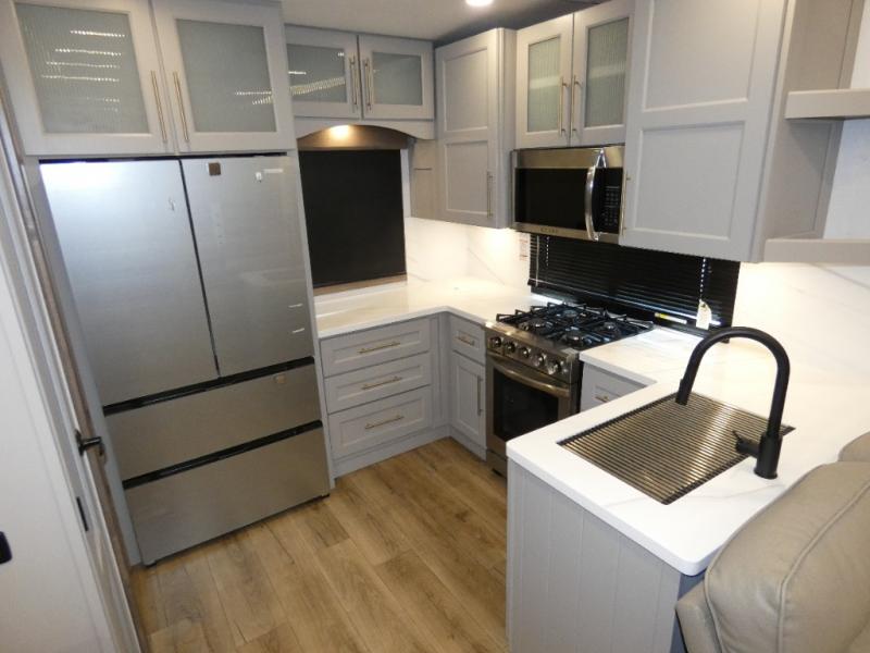 You won't want to camp any other way once you step inside this fifth wheel! the chef will enjoy all of the space in the rear kitchen with ample counter space, a 19 cu. ft. 12 volt residential refrigerator, and a pantry for snacks. Everyone will love to meet in the middle living area that includes dual sleeper sofas and a dual recliner loveseat across from the 50" Smart TV and fireplace. The half bathroom is nearby for quick bathroom breaks too. You will feel right at home in the master suite with a king bed slide to lay your head on at night, a flip top dresser with a Smart TV above it to watch your movies in true comfort, and a seat with storage, plus access to the front full bathroom. Inside the bathroom, you will find a 61" x 30" shower to freshen up in and a walk-in closet with a hamper, shelves, and washer and dryer prep for clean clothes throughout your entire trip!