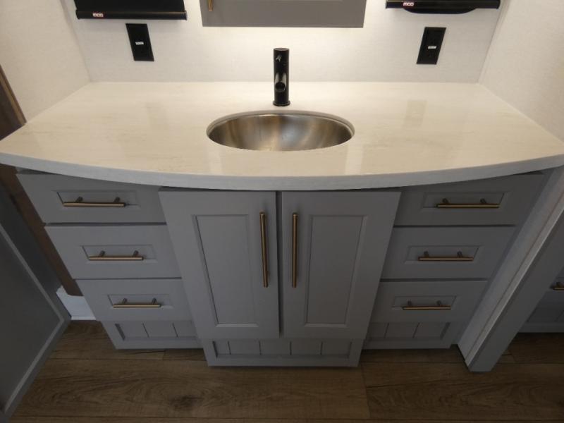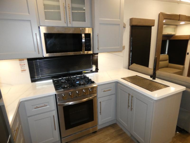 The Paradigm fifth wheels by Alliance RV are functional, high-quality, and luxurious for an unforgettable camping experience. There are three A/C units and a 40K BTU furnace to keep you comfortable year around, and you'll appreciate additional convenient amenities, like the all-in-one enclosed/heated utility center and the color coded and numbered wiring. A Helux Series coil spring pin box comes standard for hassle-free towing, along with Super-G 4,400 lb. rated tires and Dexter 7,000 lb. axles. You'll love the kitchen with its LG solid surface countertops and Lusso range, plus there is LED motion lighting in the pantry and a Maxx fan with a rain sensor to keep everything fresh when making dinner. Each model also includes an HD Smart TV in the living room and bedroom, plus a Winegard Air 360 antenna to keep you connected to the outside world.