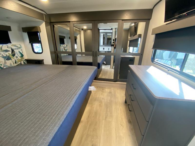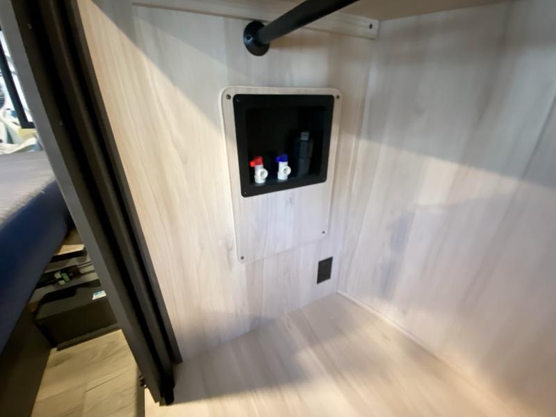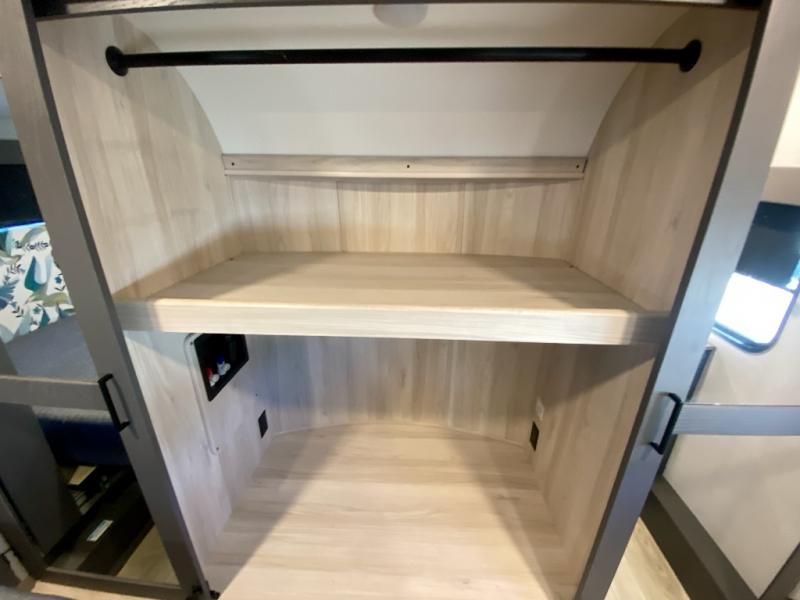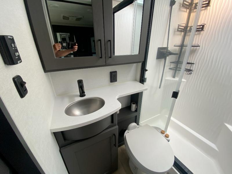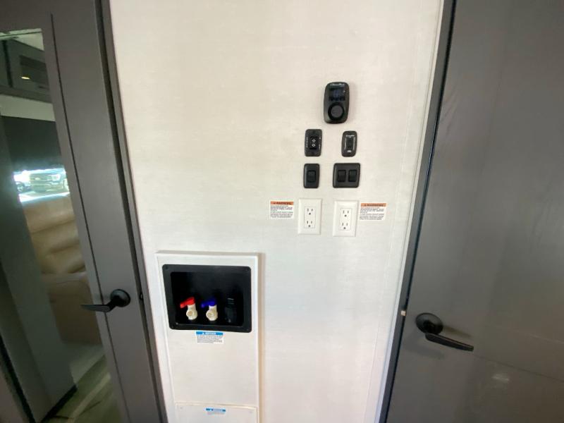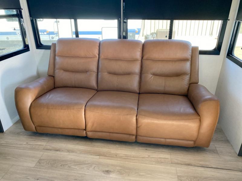 The whole gang will love camping in this toy hauler with a 14' garage for your toys and gear. Once you have arrived at your destination, you can set up the HappiJac roll-over sofas with a queen bed above them, and also a loft which opens to the garage area as well. A half bath is also available off the garage which is an added convenience for those sleeping in this converted area, and for those coming in off the trail so that they do not have to track all through the main unit to use the bathroom. The chef can prepare great meals for their hungry crew with the fully equipped kitchen including a four burner cooktop, a stainless steel 12V refrigerator, large sink, and plenty of countertop prep space. The rest of the gang can be relaxing on the large L-shaped sofa slide watching the 50" HDTV and enjoying the fireplace, or playing a game of cards at the dining table with four chairs. The front private bedroom features a king bed slide for more interior space, a flip top dresser for all of your belongings, and a front wardrobe with washer and dryer prep, plus it has an entrance into the dual entry bathroom!