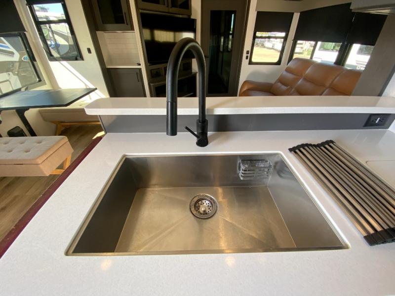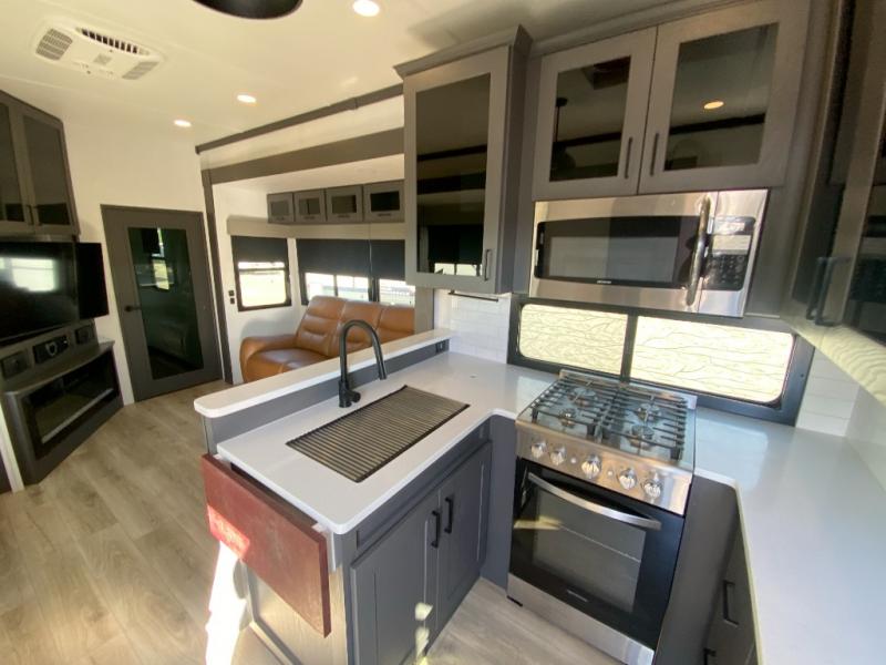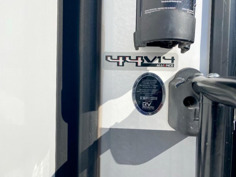 You can bring your toys with you wherever you go with any one of these Alliance RV Valor toy hauler fifth wheels! They are adventure-ready with a quality build from the walk on roof with seamless PVC roof covering to the commercial grade vinyl flooring and MorRyde CRE3000 suspension system. The Performance Running Gear package comes with a 101" wide-body benchmark chassis platform, 7,000 lb. Dexter axles, and a space enhancing drop frame storage compartment to pack in all your riding gear. You can even go off-gridding thanks to the Off the Grid Pack that has two 400 watt solar panels, generator prep, a 40 amp charge controller, and a 100 amp hour lithium iron phosphate battery. Some of the interior comforts you will enjoy are the hardwood cabinet doors and drawers, solid surface kitchen countertops, and commercial grade vinyl flooring with no carpet to make clean up a breeze. The Valor toy haulers are also the Master of 12 Volt with USB charging station throughout, a stainless steel refrigerator, and more 12 volt features to make camping hassle-free!