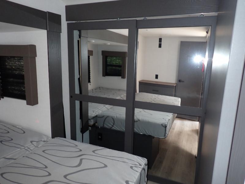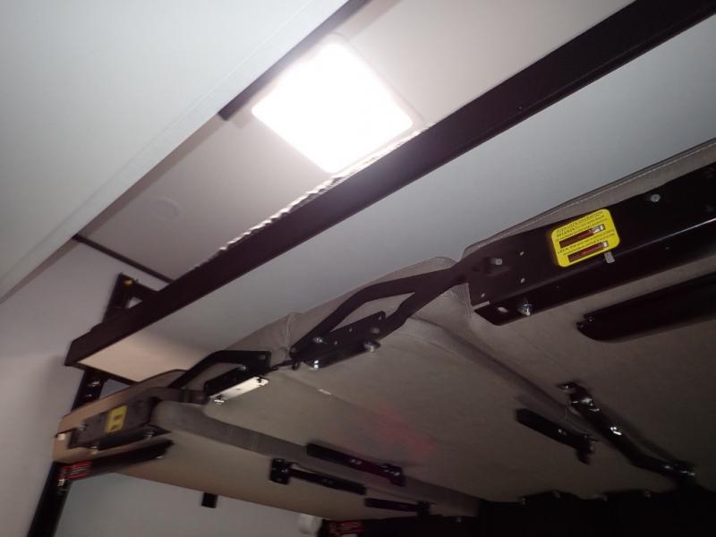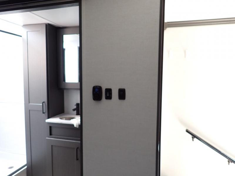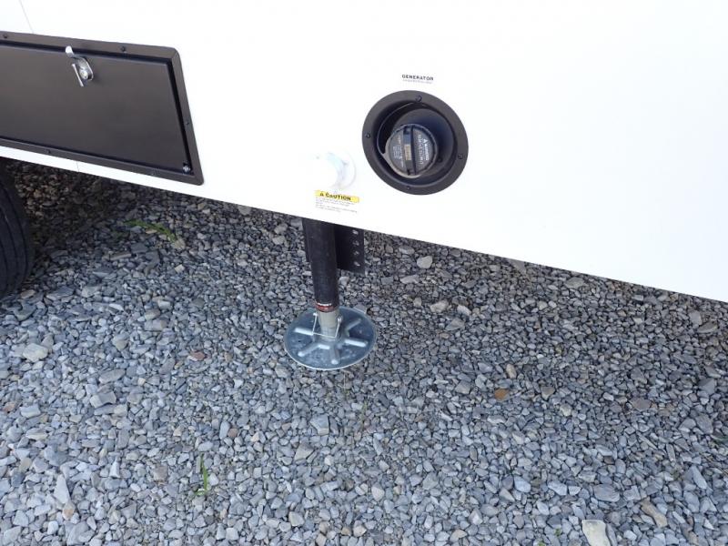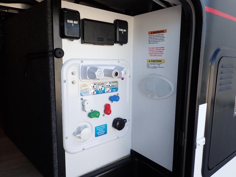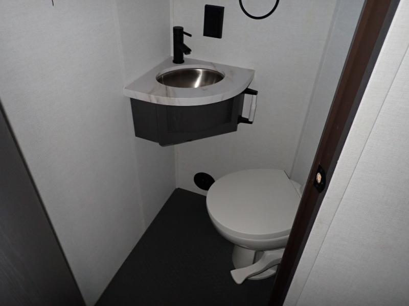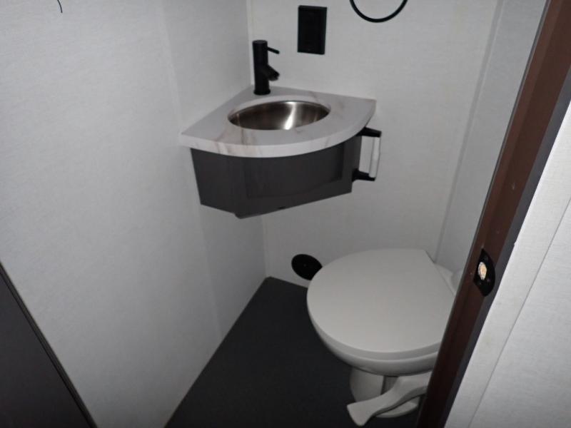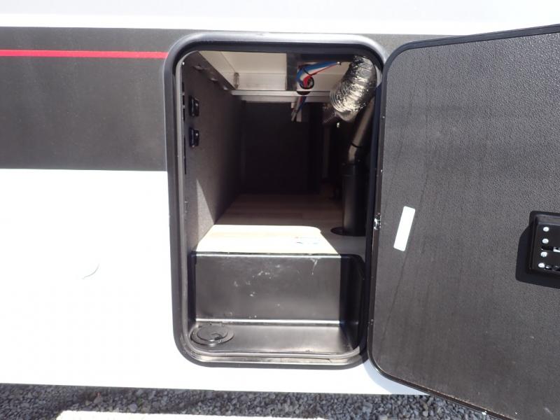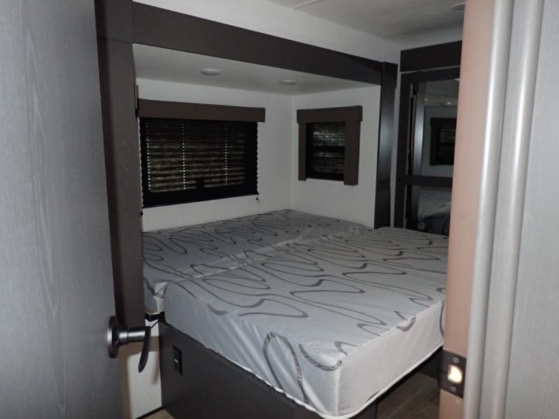 Load up the dirt bikes, pack your bags, and head to the campground in this spacious toy hauler. Once your toys are unloaded using the 7.5' weather resistant ramp door, relax on the HappiJac roll-over sofas with a folding table in between, and this area can become your guests' bedroom at night since there is a drop-down queen bed and a half bath. You will have the master bedroom all to yourselves that includes a king bed slide out with storage below, a spacious closet, and easy access into the dual entry full bath. Everyone can meet in the main living area/kitchen for movie night with the HDTV and sofa slide out, while the chef of makes dinner on the three burner cooktop. There is also a hutch and pantry for storage and a kitchen island for more counter space!