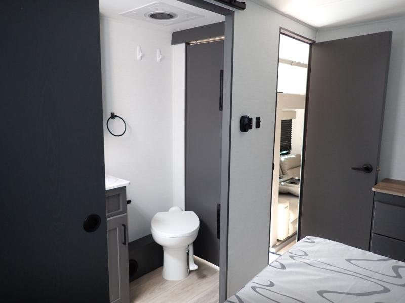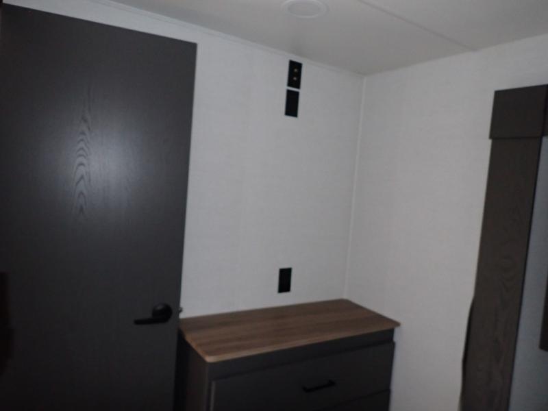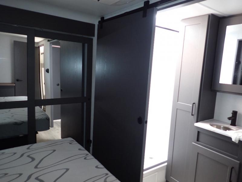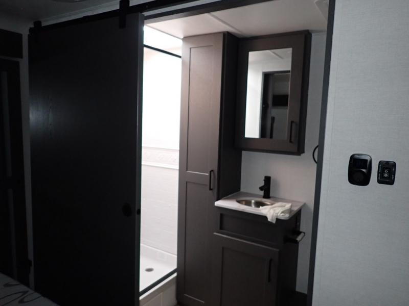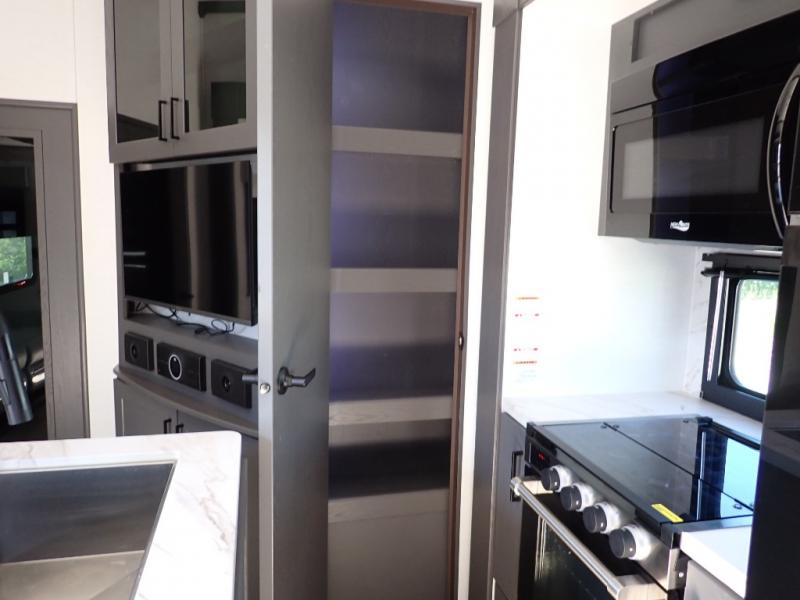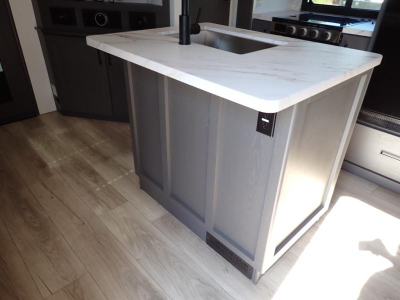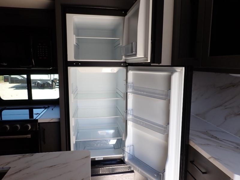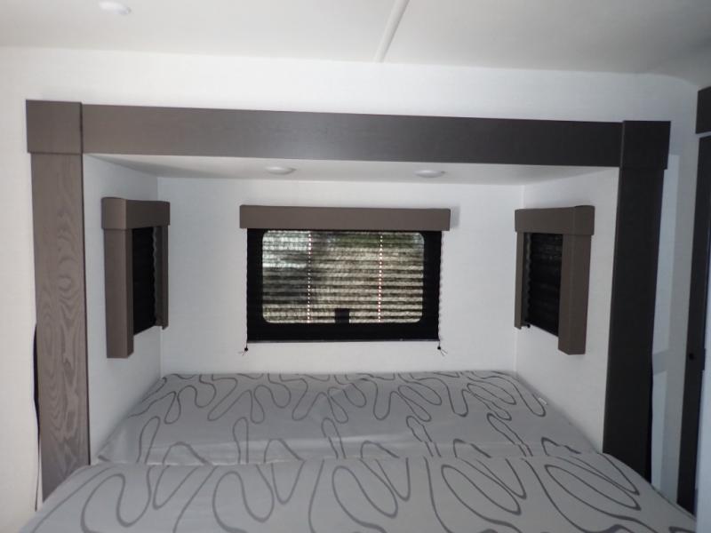 Load up the dirt bikes, pack your bags, and head to the campground in this spacious toy hauler. Once your toys are unloaded using the 7.5' weather resistant ramp door, relax on the HappiJac roll-over sofas with a folding table in between, and this area can become your guests' bedroom at night since there is a drop-down queen bed and a half bath. You will have the master bedroom all to yourselves that includes a king bed slide out with storage below, a spacious closet, and easy access into the dual entry full bath. Everyone can meet in the main living area/kitchen for movie night with the HDTV and sofa slide out, while the chef of makes dinner on the three burner cooktop. There is also a hutch and pantry for storage and a kitchen island for more counter space!