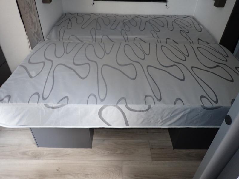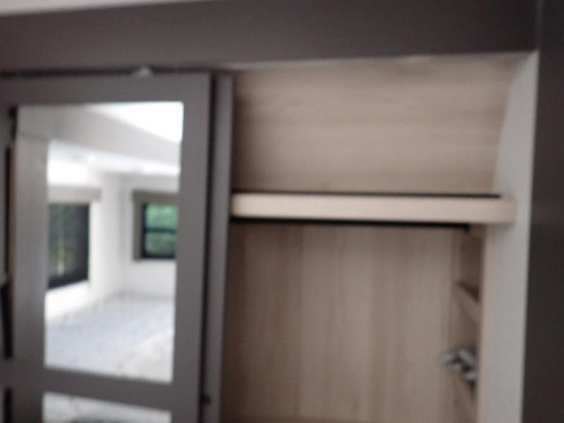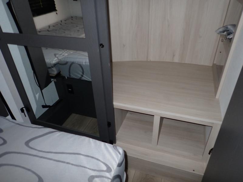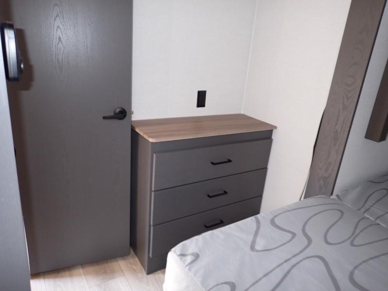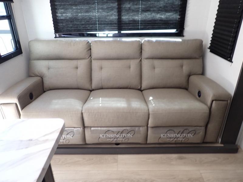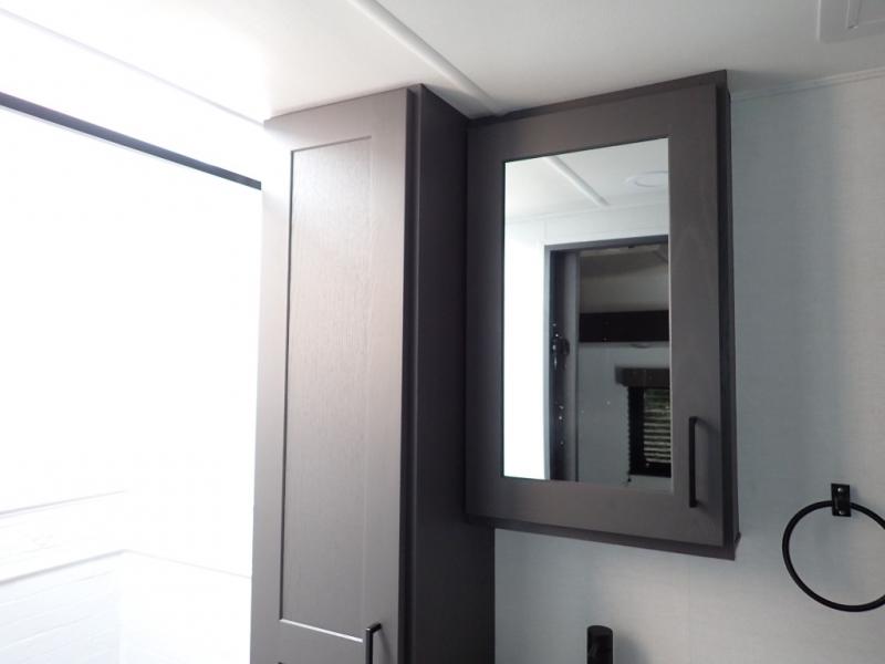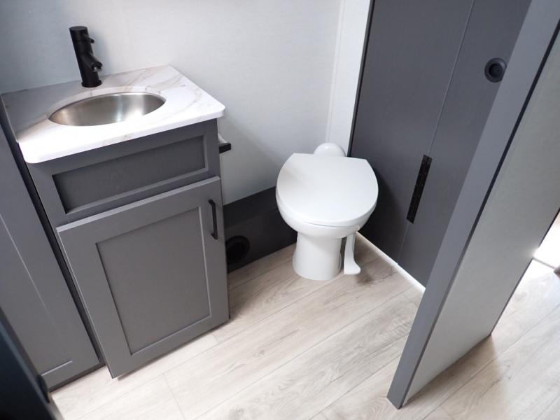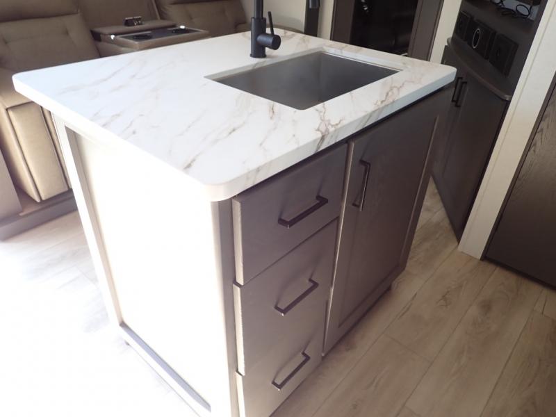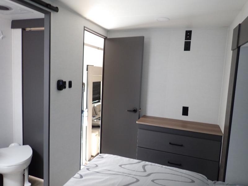 Load up the dirt bikes, pack your bags, and head to the campground in this spacious toy hauler. Once your toys are unloaded using the 7.5' weather resistant ramp door, relax on the HappiJac roll-over sofas with a folding table in between, and this area can become your guests' bedroom at night since there is a drop-down queen bed and a half bath. You will have the master bedroom all to yourselves that includes a king bed slide out with storage below, a spacious closet, and easy access into the dual entry full bath. Everyone can meet in the main living area/kitchen for movie night with the HDTV and sofa slide out, while the chef of makes dinner on the three burner cooktop. There is also a hutch and pantry for storage and a kitchen island for more counter space!