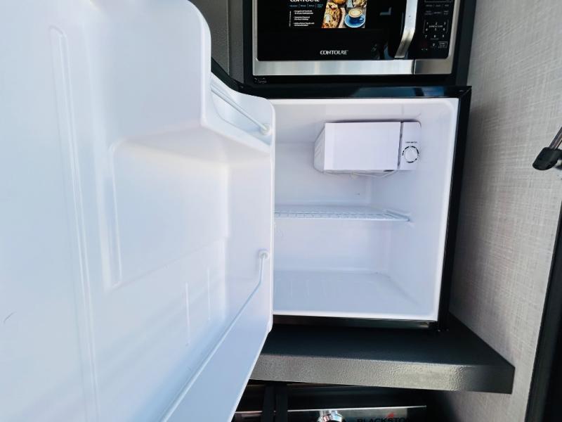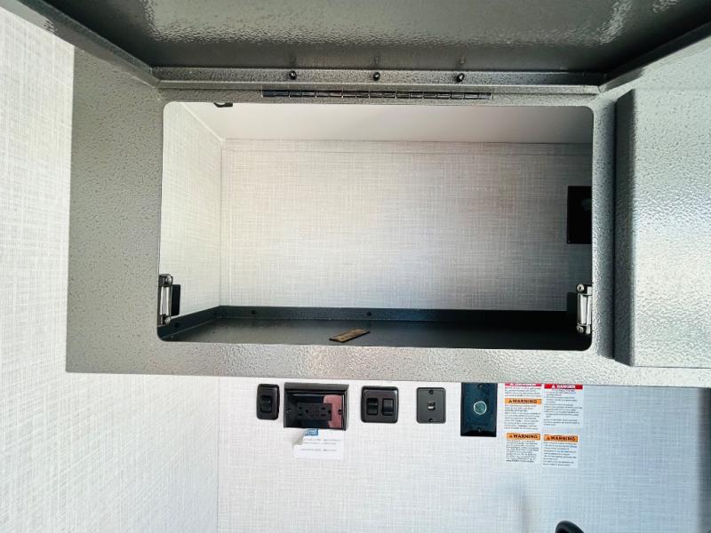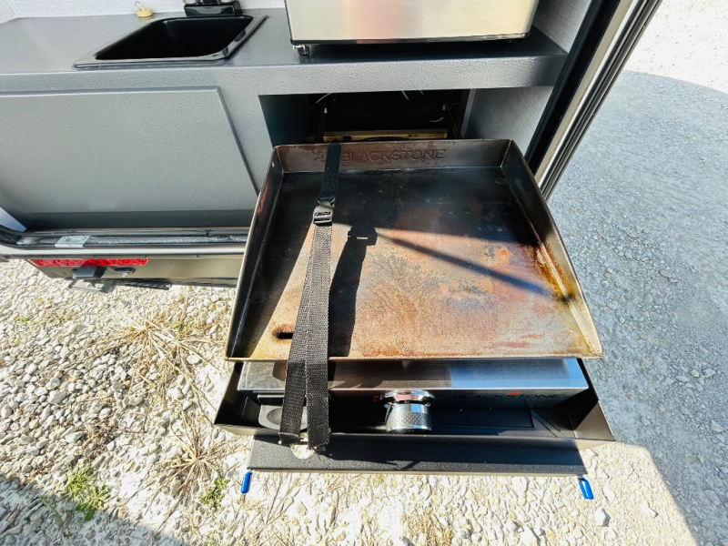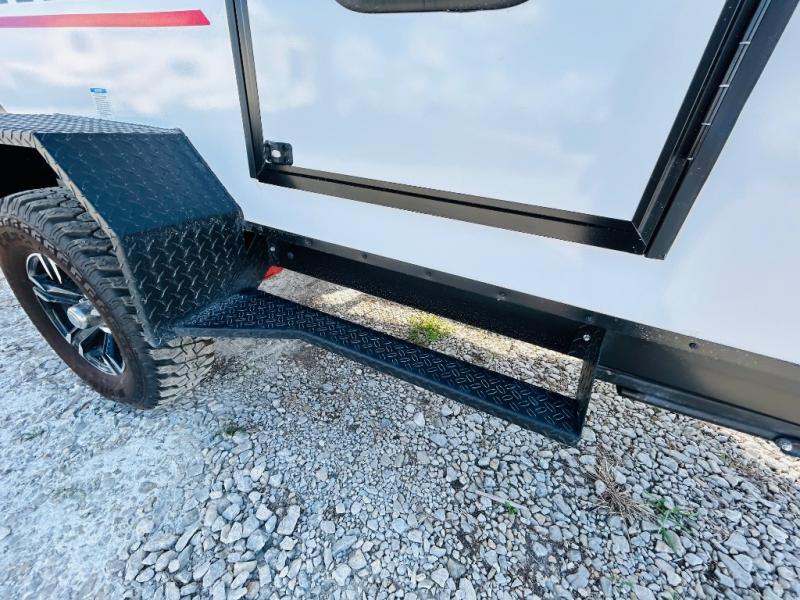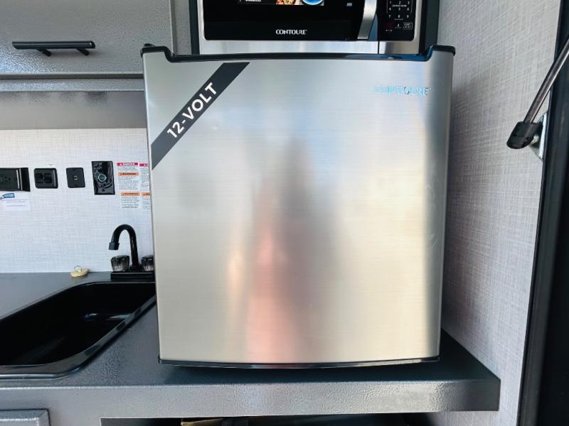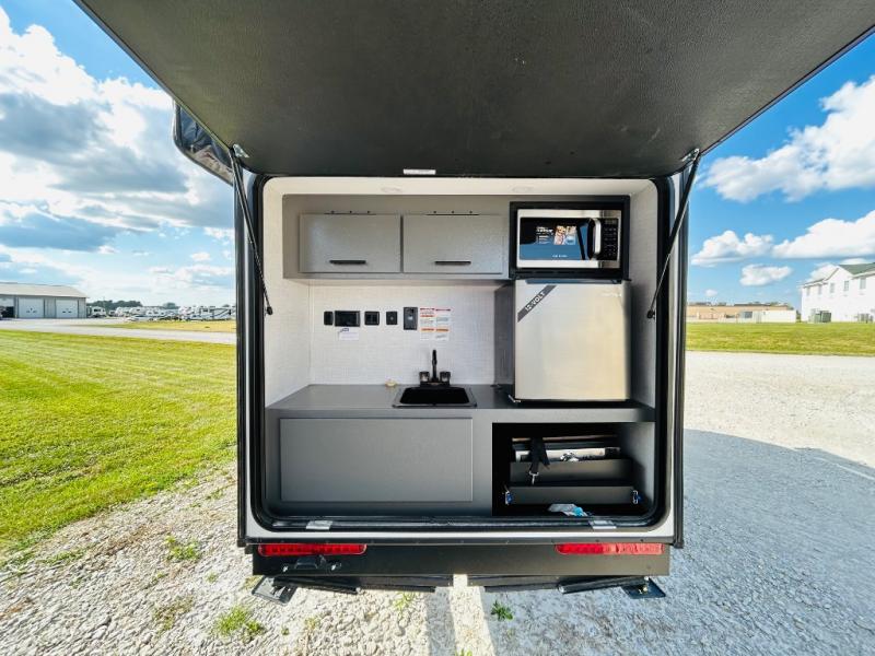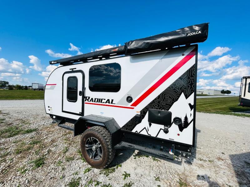 It will be so easy to hitch up and head out in this teardrop trailer! You can sleep two easily since there are comfortable mattresses, and there are storage compartments for your valuables and camp necessities. An outside shower will let you freshen up when you need to, and there is even a portable toilet for added convenience. Within the exterior kitchenette you'll find a microwave, 12V refrigerator and a Blackstone griddle. You'll love the awning included within the Radical Package, along with a high-clearance axle with independent suspension, and Carrera Red Radical graphics!