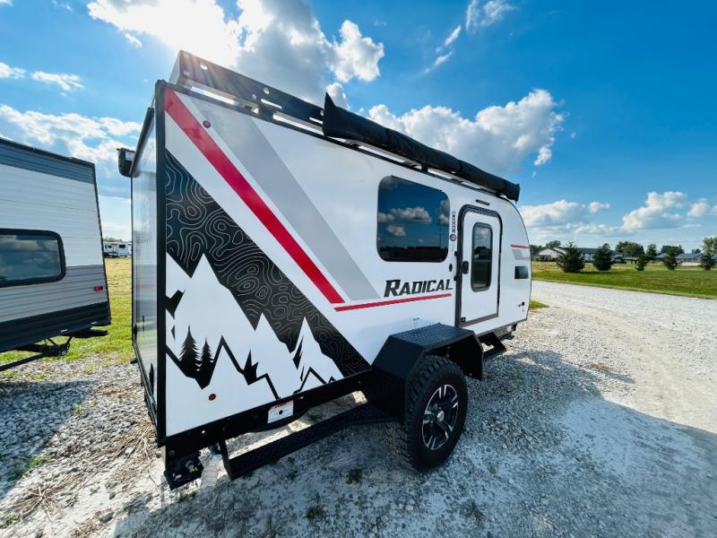 With any Radical teardrop trailer by Bontrager Outdoors, you will find a durable Norco stamped and huck-bolted, powder-coated mainframe and a Torsion-Flex 3,000 lb. independent suspension axle with electric brakes for maximum clearance. There is a multi-purpose gear rack outdoors, along with diamond plate running boards, an awning, and a heavy duty roof rack for camp gear. Multiple 110V, 12V and USB outlets are conveniently located throughout, and you're sure to stay comfortable with the 14,300 BTU Truma Combi heater and 5,000 BTU wall-mounted A/C. And don't overlook the Radical Package that comes with an electric tongue jack, J-cube cushions, quad heavy-duty extendable BAL stabilizing jacks, a bright white fiberglass exterior, and more!