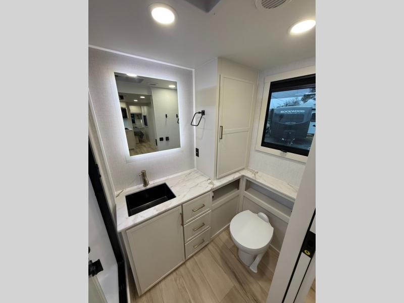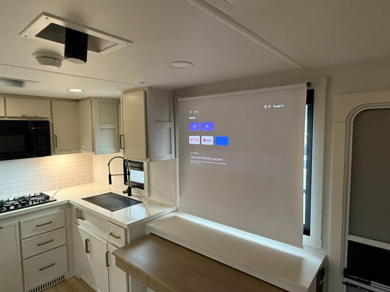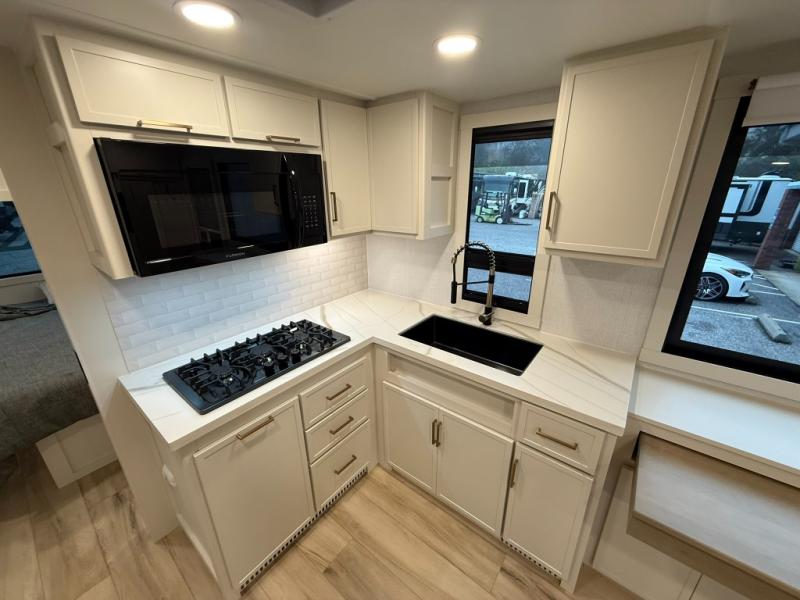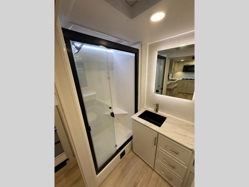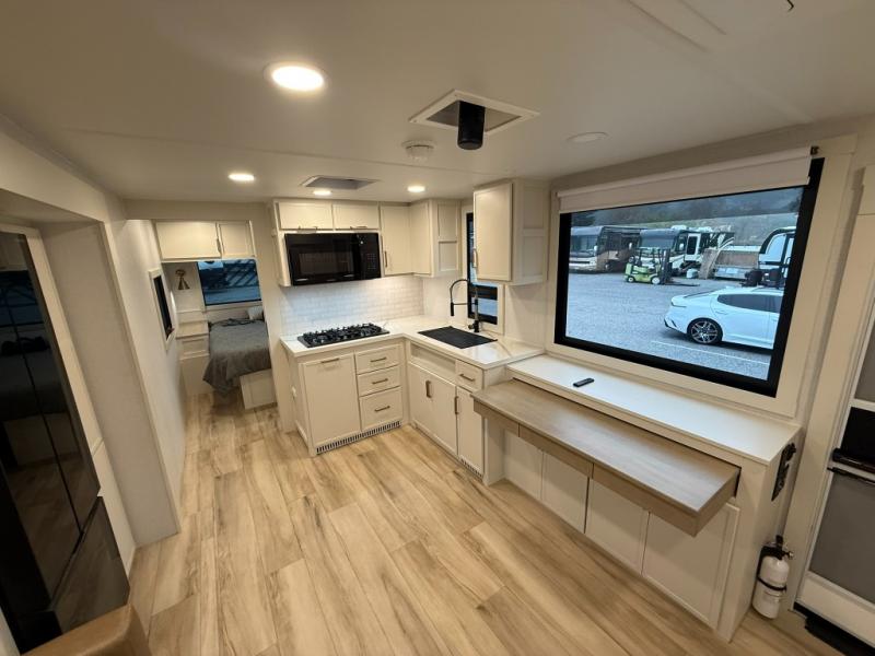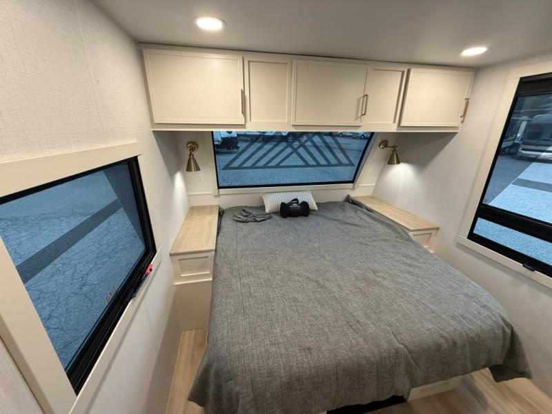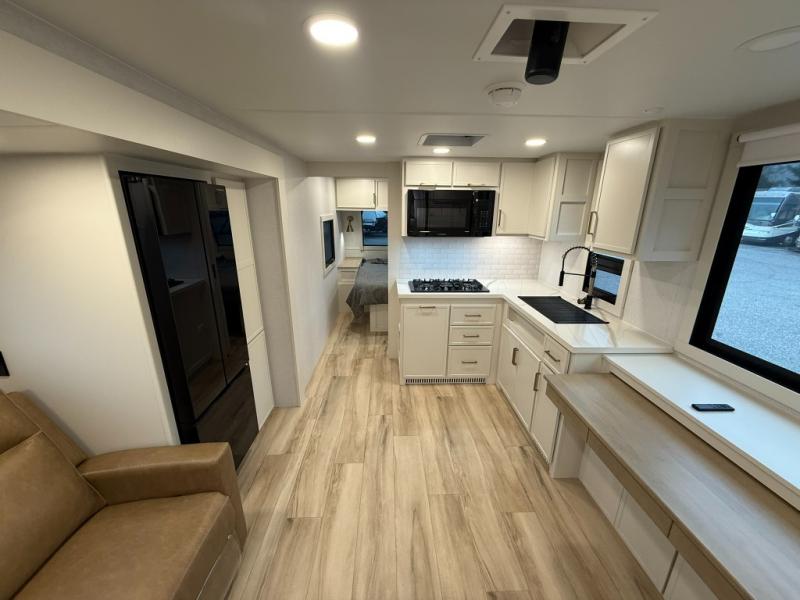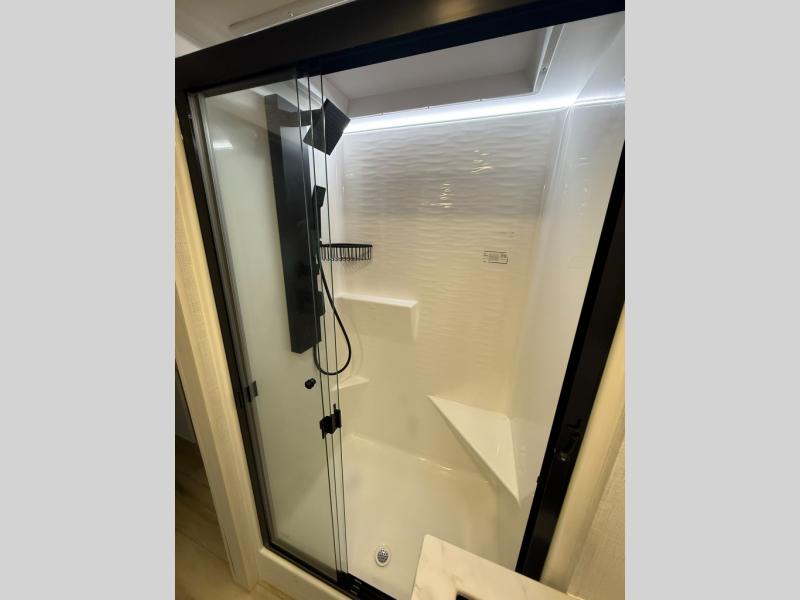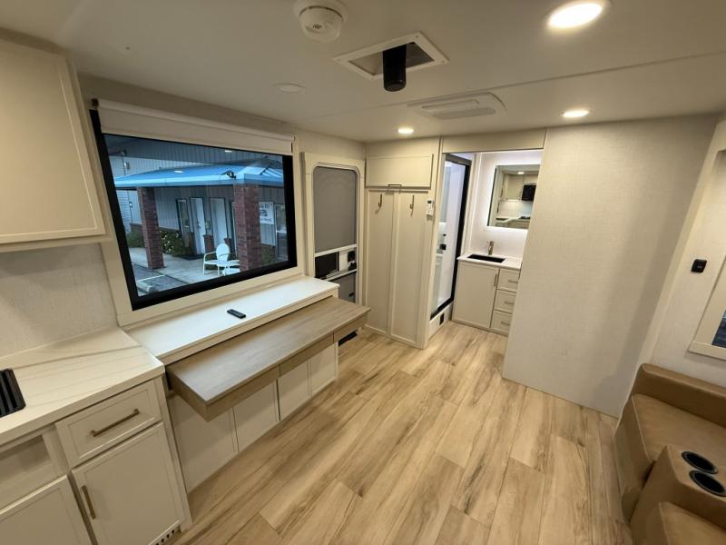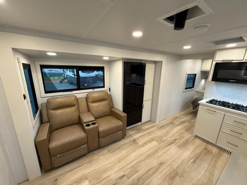 One look at this travel trailer and you'll be sold! The full rear bath features a spacious 42" x 30" shower with a built-in seat and Maxxair fan to name a few comforts. The front private bedroom features a 66" x 80" king bed with a MaxSpace Split-Level Wardrobe underneath to store shoes, clothes, and more! A slide out in the combined living area and kitchen makes your space more open, and you'll enjoy relaxing on the theater seating here in the evenings. The full kitchen includes a three burner stovetop, residential 30" convection microwave, 12 cu. ft. 12V refrigerator, plus a trash bin and Stow N' Go paper towel holder for added convenience. You can choose to eat outdoors under the 19' electric awning with LED lights or stay inside to dine at the pull-out dining table with a drawer for added storage! And if you're needing more sleeping space, just choose the optional tri-fold sofa in place of the theater seating!